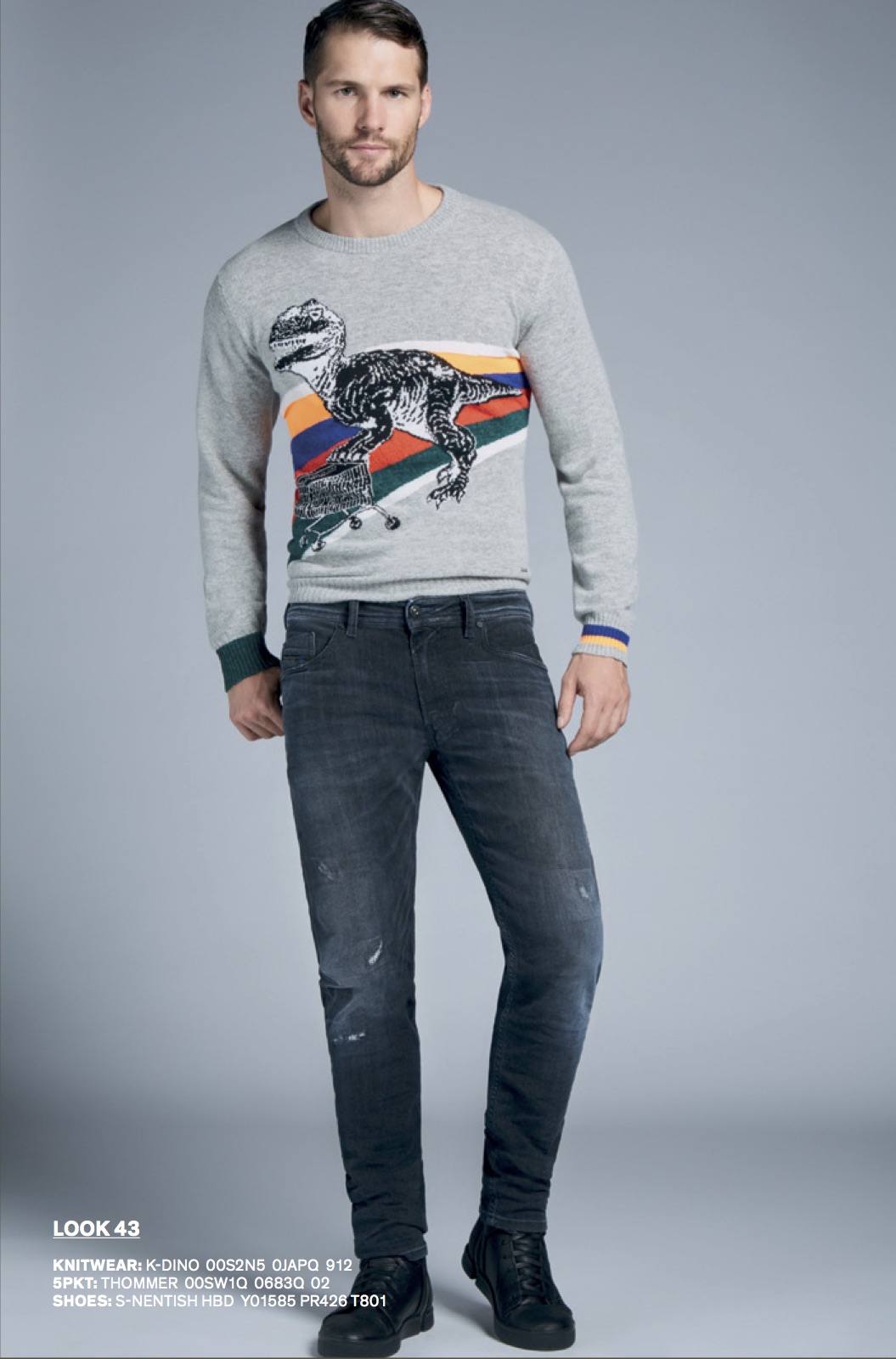 Diesel : Pull au jacquard dino faisant ses courses au supermarché avec un chariot.