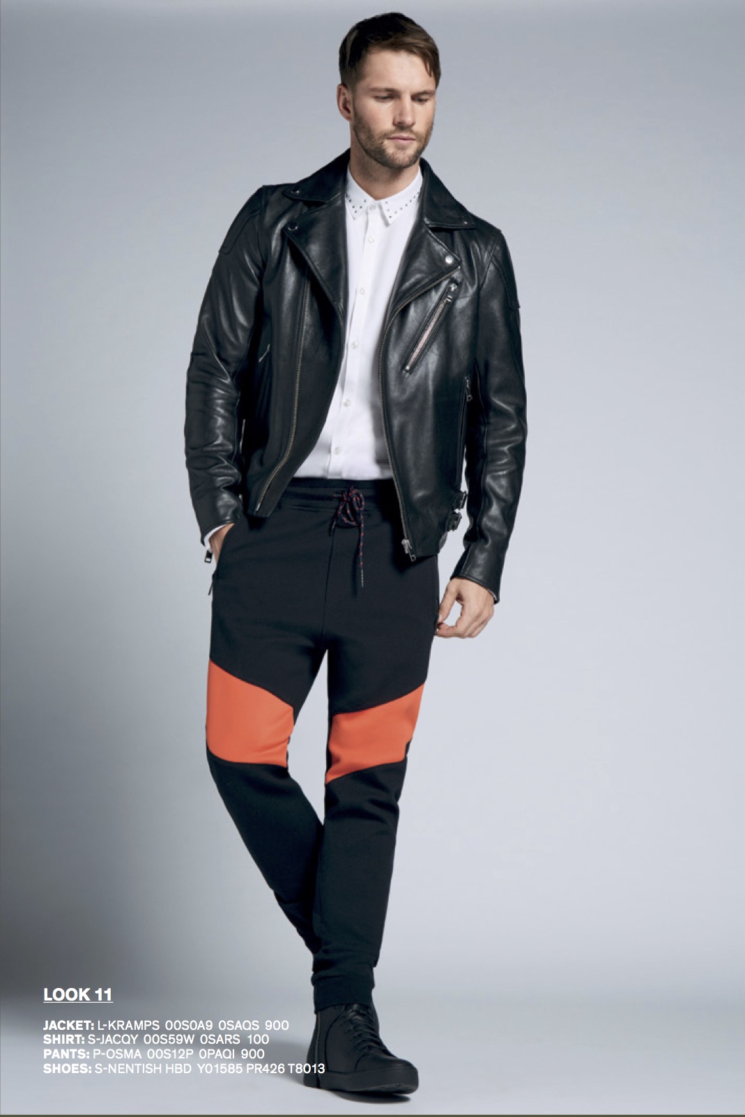 Diesel : pantalon survet en molleton porté avec une chemise et un perfecto de cuir.