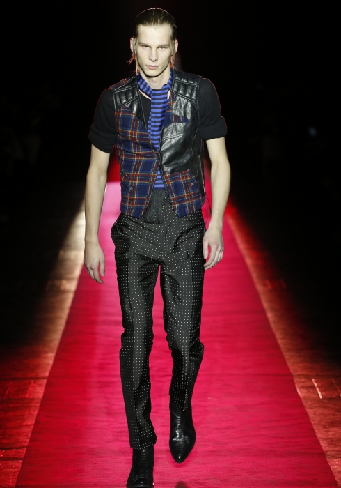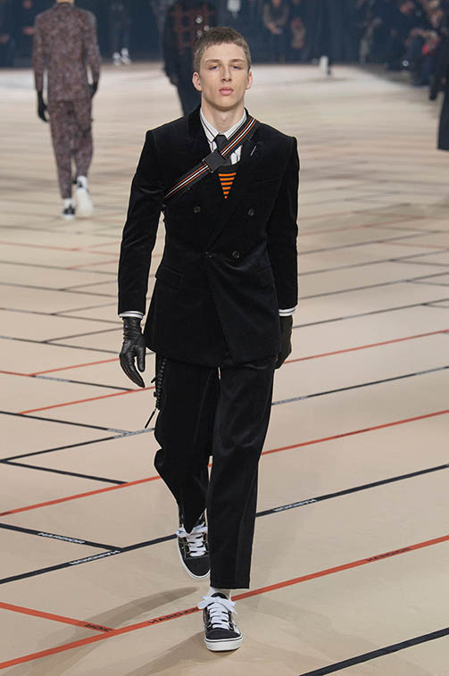 Dior homme Veste croisée manches ¾ en velours milleraies noir, broderie « signature » point main à la boutonnière. Pull sans manches façon débardeur en jersey de laine vierge et polyester à fines rayures horizontales rouges et noires, broderie « abeille ». Chemise col 5 cm manches ¾ en twill de coton blanc à fines rayures rouges et noires, broderie «abeille». Pantalon « cropped » en velours milleraies noir.