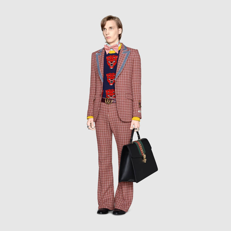 Gucci Pull en maille de laine jacquard tigre sous un costume homme à carreau avec veste à très larges revers et un noeud paillon extra large rose.