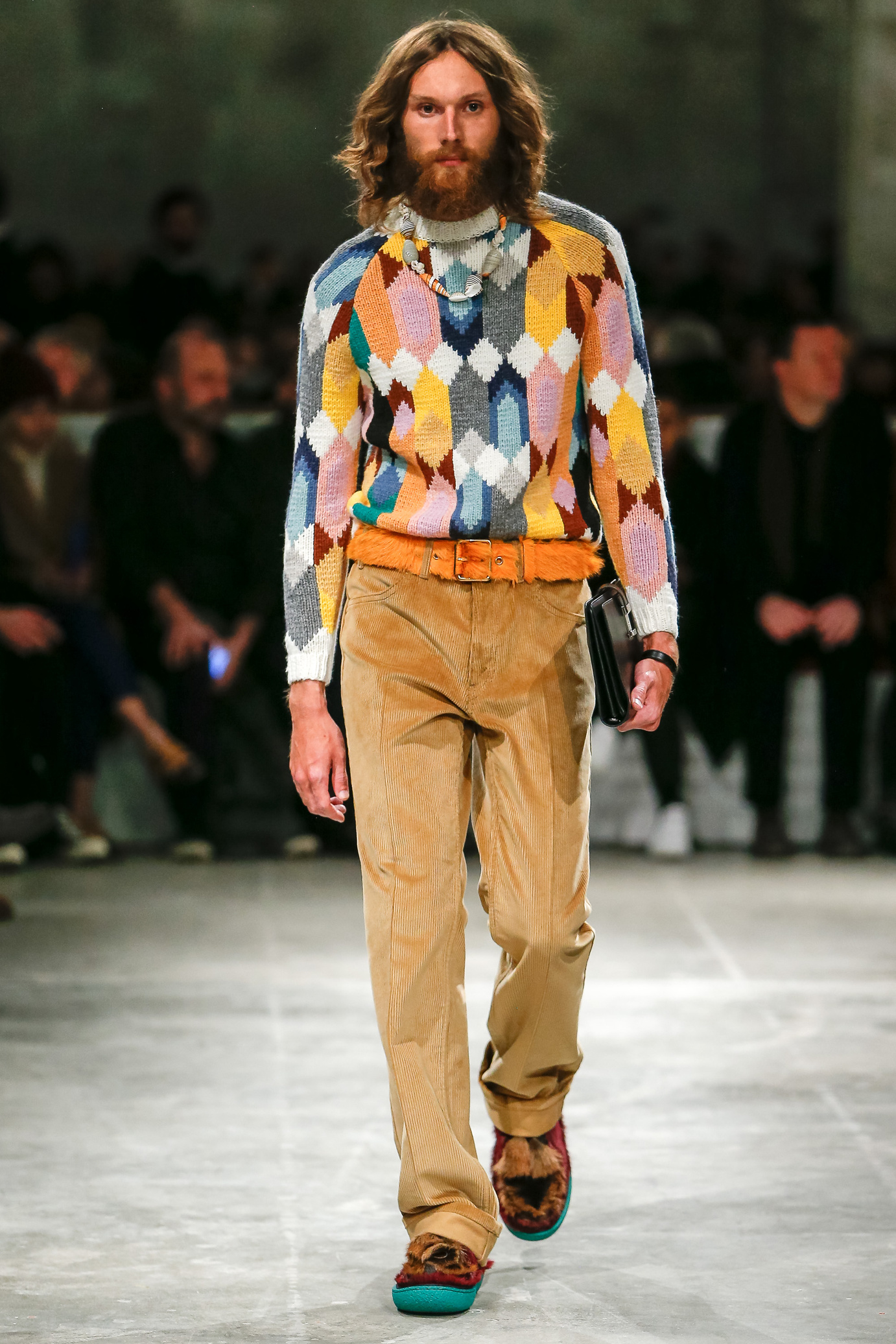 Prada homme : Pantalon en velours côtelé beige, pull à losange, manche raglan, ceinture à fourrure.