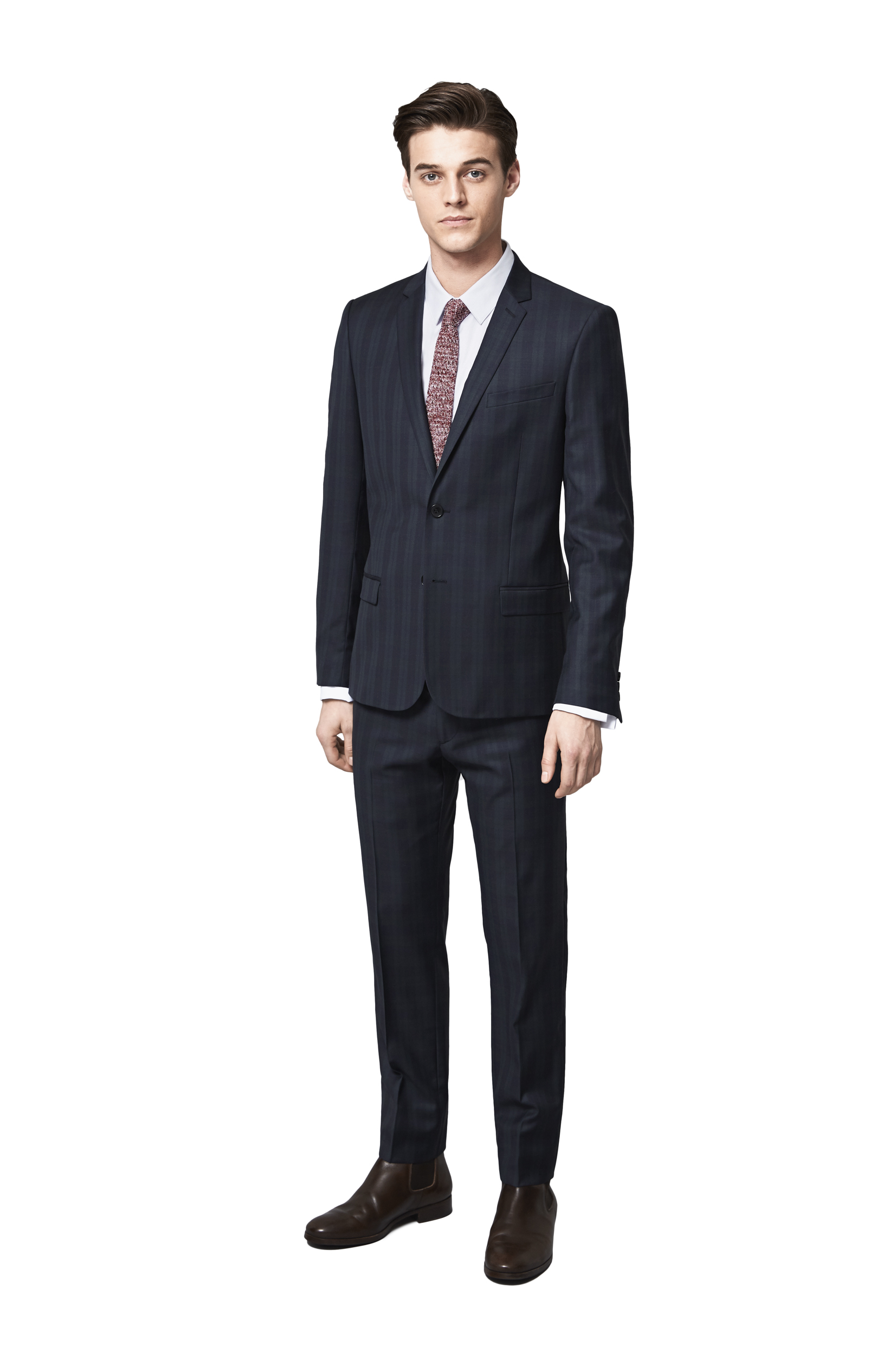 Un costume en laine plutôt rigide à la coupe assez ajustée, avec 2 boutons comme c’est la mode en ce moment. Une tenue sobre et classique, pas trop chère, pour aller travailler. Celio.