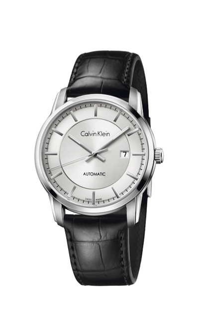 Calvin Klein Infinite à mouvement automatique. Son fond transparent permet de voir le balancier et l’ensemble du mécanisme bouger.