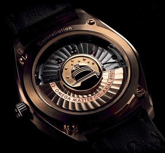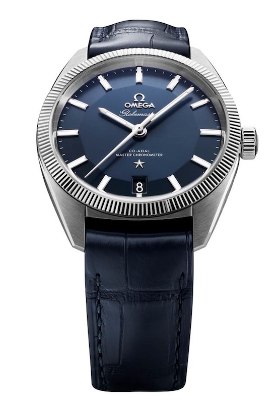 Omega Globemaster, inspirée de l’aéronautique, elle bénéficie du mécanisme le plus perfectionné de la marque. La lunette cannelée est en carbure de tungstène, un métal particulièrement dur. Le fond gravé représente un observatoire astronomique.