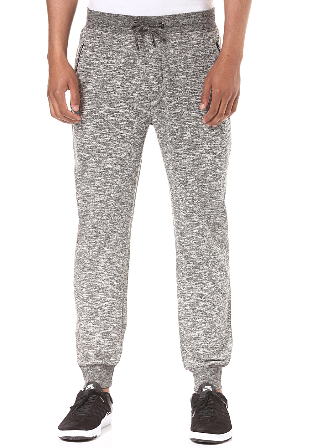 Les pantalons de jogging ne se portent plus seulement pour cocooner à la maison ou faire du sport ou pour se donner un look sport – hip hop. Depuis quelques saisons, on les voit associés lors de défilés de mode et dans les séries de photos de mode des magazines avec toutes sortes de vêtements : vestes de costumes, chemise, pull de maille. Pantalon en molleton de coton gris chiné Reell.