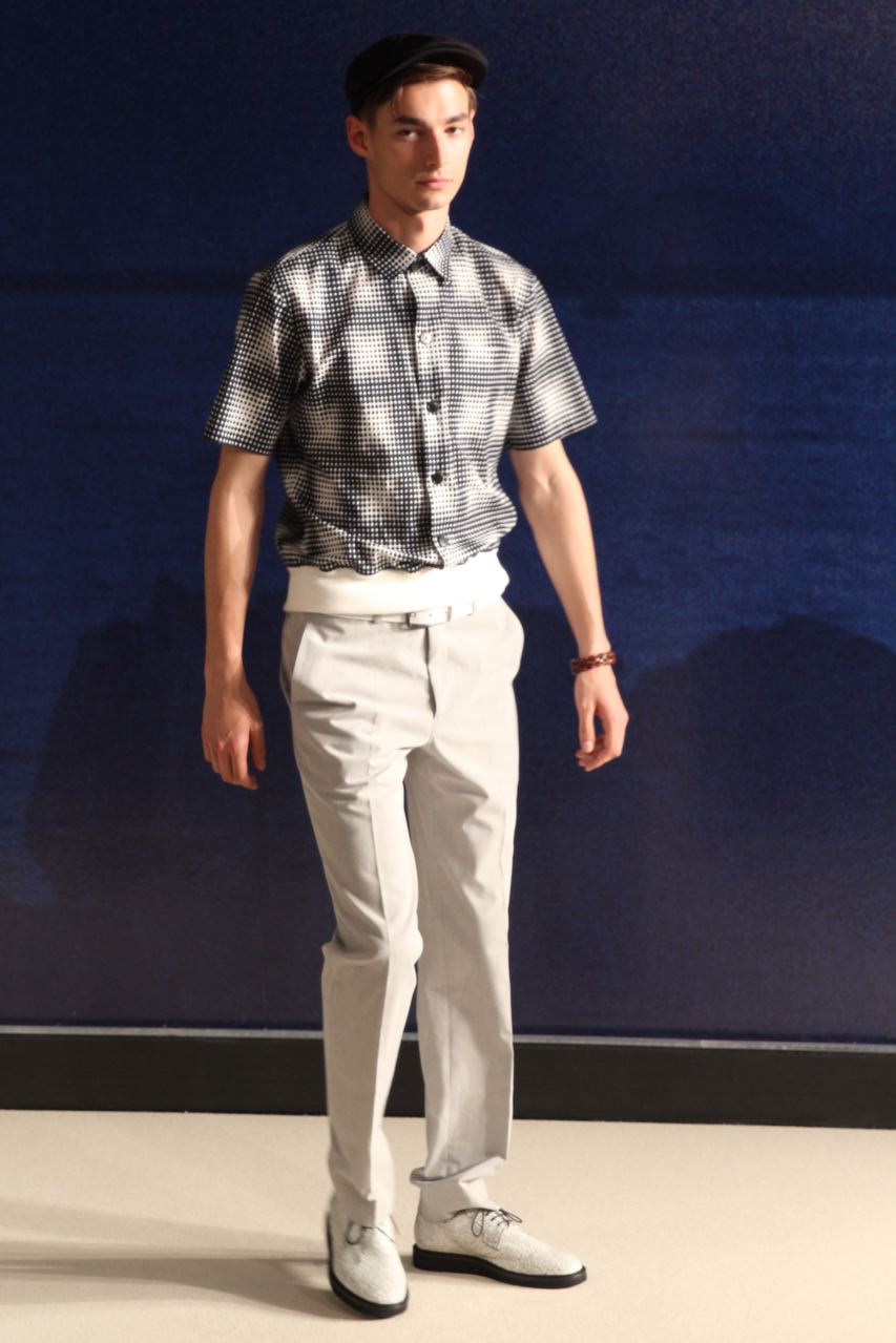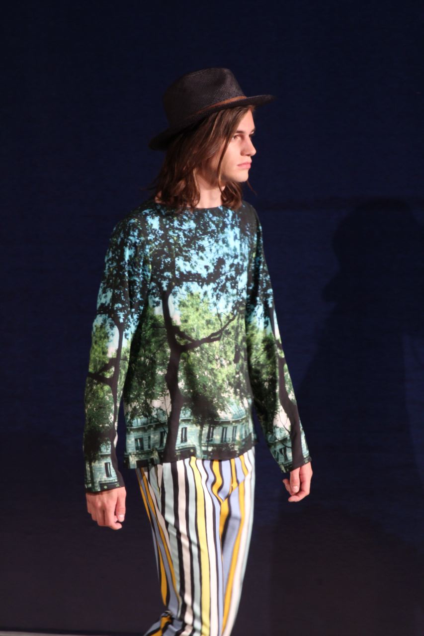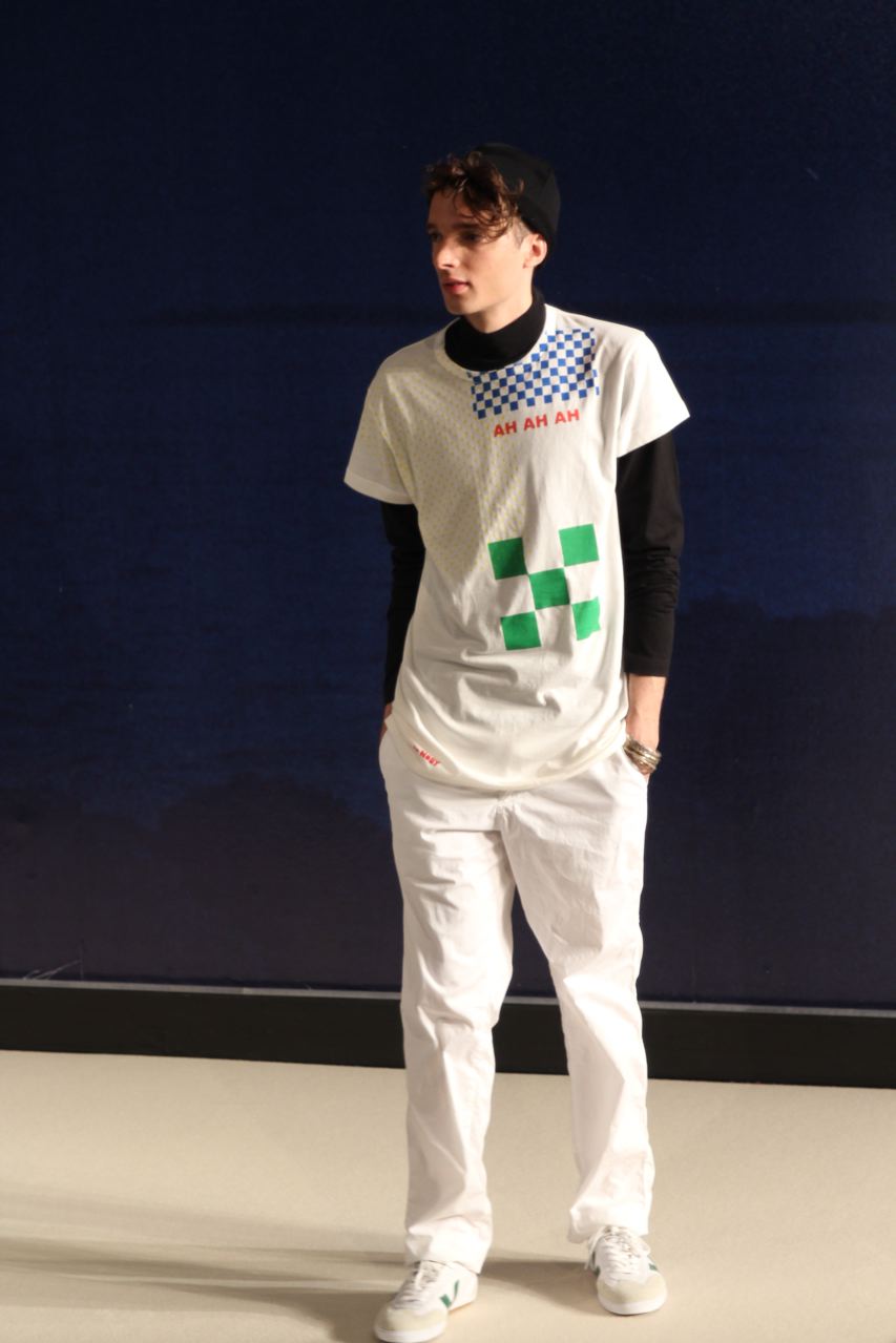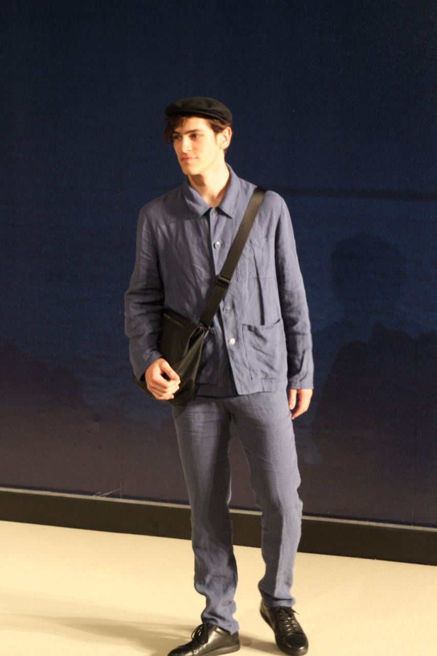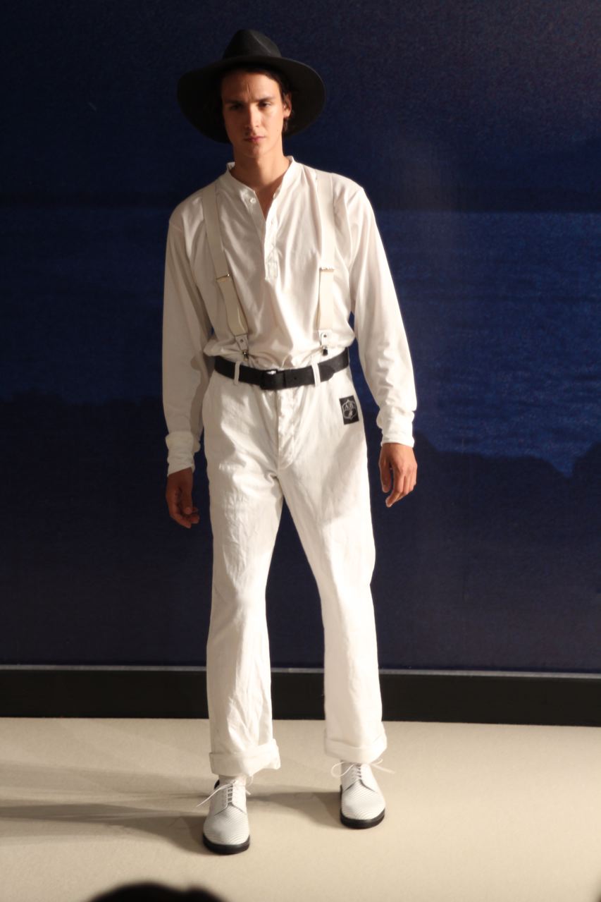 Combinaisons de travail en denim, coton blanc sérigraphie, pantalons et vestes de travail, veste tambourin, t-shirt à rayure. La première partie du défilé d’agnès b présente des pièces inspirées de vêtements de travail. Des habits simples en coton, denim, lin, jerseys et cuir. Gris, bleus, blancs ou à rayures noires et blanches. L’inspiration de la deuxième partie, c’est un parisien revenant de voyage en Inde d’où l’usage de couleurs assez important, avec quelques pièces inspirées de la culture indienne. Certains tissus ont été imprimés dans ce pays. Les coloris sont des dégradés de beige et de gris rehaussés par des couleurs plus vives comme des oranges et des imprimés floraux ou graphiques. Les coupes des pantalons et vestes sont près du corps. Les vêtements de la 3ème partie sont inspirés par le style parisien avec des trenchs, pantalons rayés, costumes près du corps gris et bleus, avec du jaune, du vert d’eau. Des rayures, des imprimés graphiques et un imprimé photo du Canal saint Martin prise par Agnès. Dans la 4ème partie, les vêtements sont inspirés de la période post punk, nouvelle vague en France (période 1978-1983), pendant laquelle la révolte des jeunes contre la société s’exprimait au travers de différents mouvements musicaux et artistiques. Les couleurs : blanc, rouge, noir, rose. La fin du défilé présente des tenues de gala, tenues de soirée, sur le tapis rouge d’un festival de cinéma.