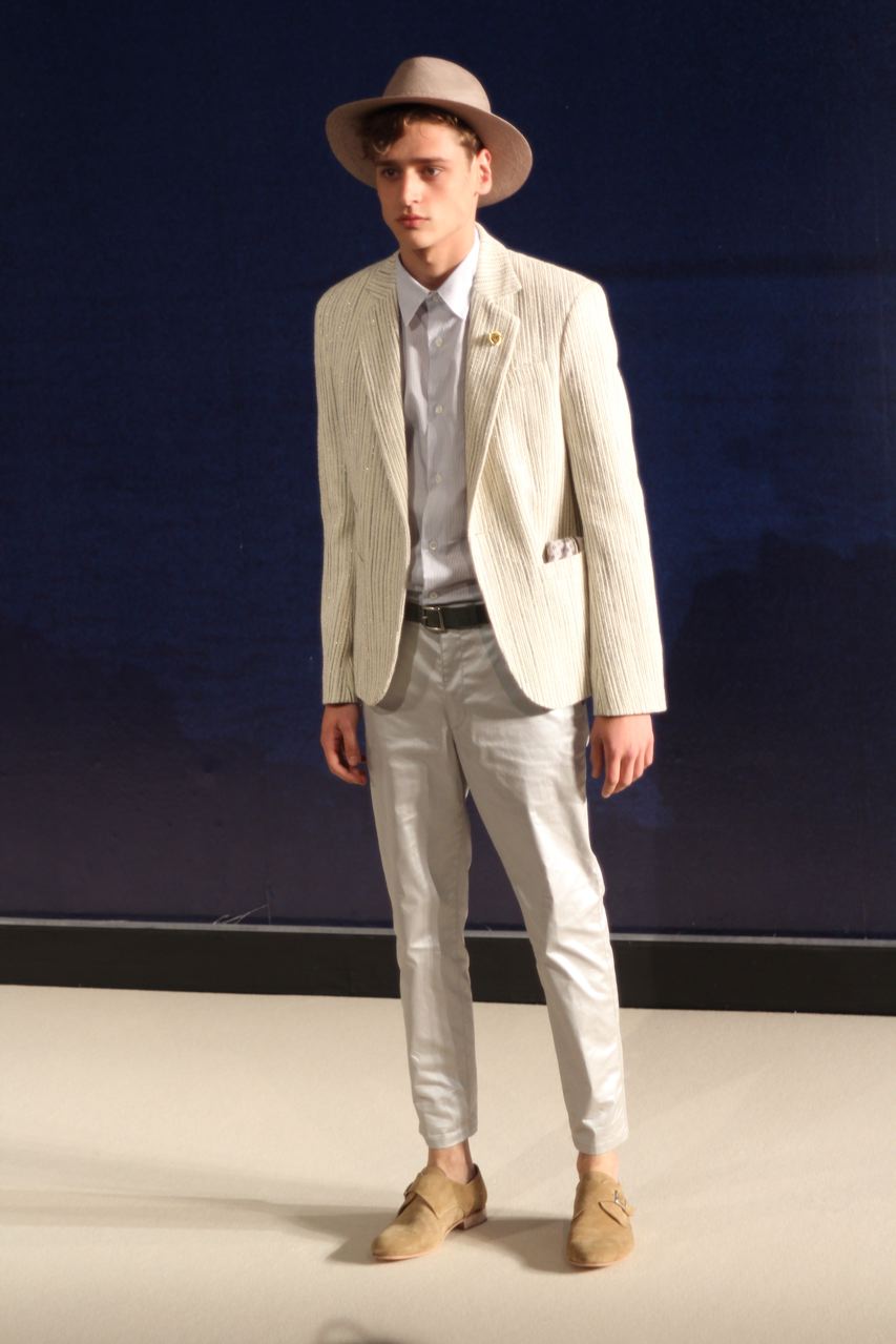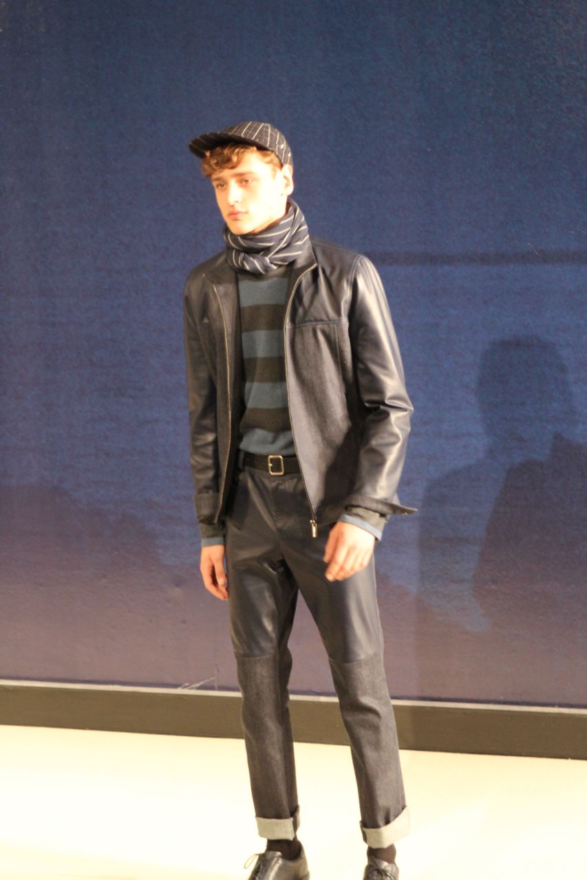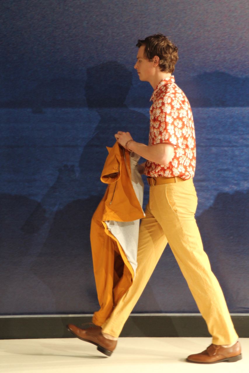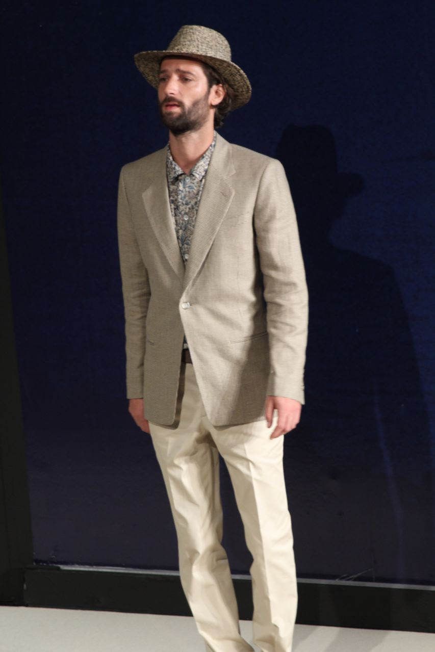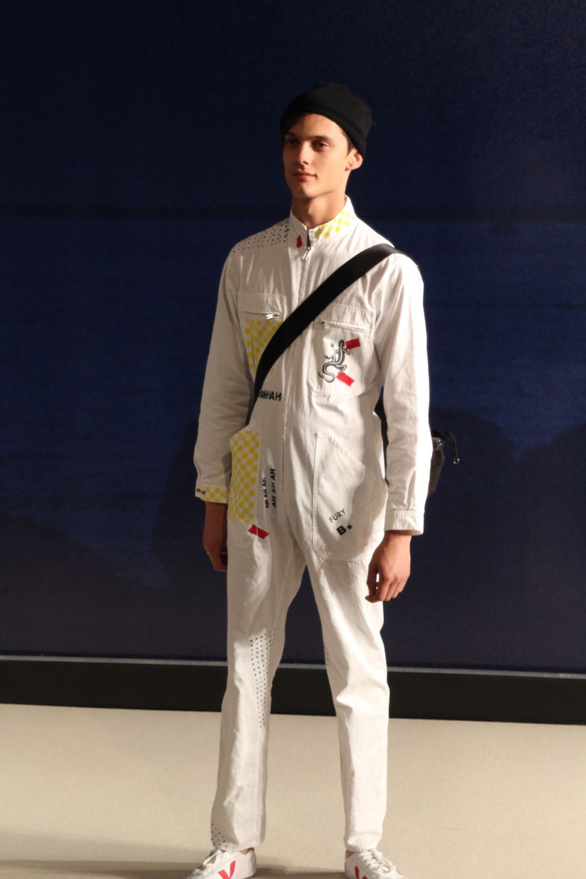 Combinaisons de travail en denim, coton blanc sérigraphie, pantalons et vestes de travail, veste tambourin, t-shirt à rayure. La première partie du défilé d’agnès b présente des pièces inspirées de vêtements de travail. Des habits simples en coton, denim, lin, jerseys et cuir. Gris, bleus, blancs ou à rayures noires et blanches. L’inspiration de la deuxième partie, c’est un parisien revenant de voyage en Inde d’où l’usage de couleurs assez important, avec quelques pièces inspirées de la culture indienne. Certains tissus ont été imprimés dans ce pays. Les coloris sont des dégradés de beige et de gris rehaussés par des couleurs plus vives comme des oranges et des imprimés floraux ou graphiques. Les coupes des pantalons et vestes sont près du corps. Les vêtements de la 3ème partie sont inspirés par le style parisien avec des trenchs, pantalons rayés, costumes près du corps gris et bleus, avec du jaune, du vert d’eau. Des rayures, des imprimés graphiques et un imprimé photo du Canal saint Martin prise par Agnès. Dans la 4ème partie, les vêtements sont inspirés de la période post punk, nouvelle vague en France (période 1978-1983), pendant laquelle la révolte des jeunes contre la société s’exprimait au travers de différents mouvements musicaux et artistiques. Les couleurs : blanc, rouge, noir, rose. La fin du défilé présente des tenues de gala, tenues de soirée, sur le tapis rouge d’un festival de cinéma.