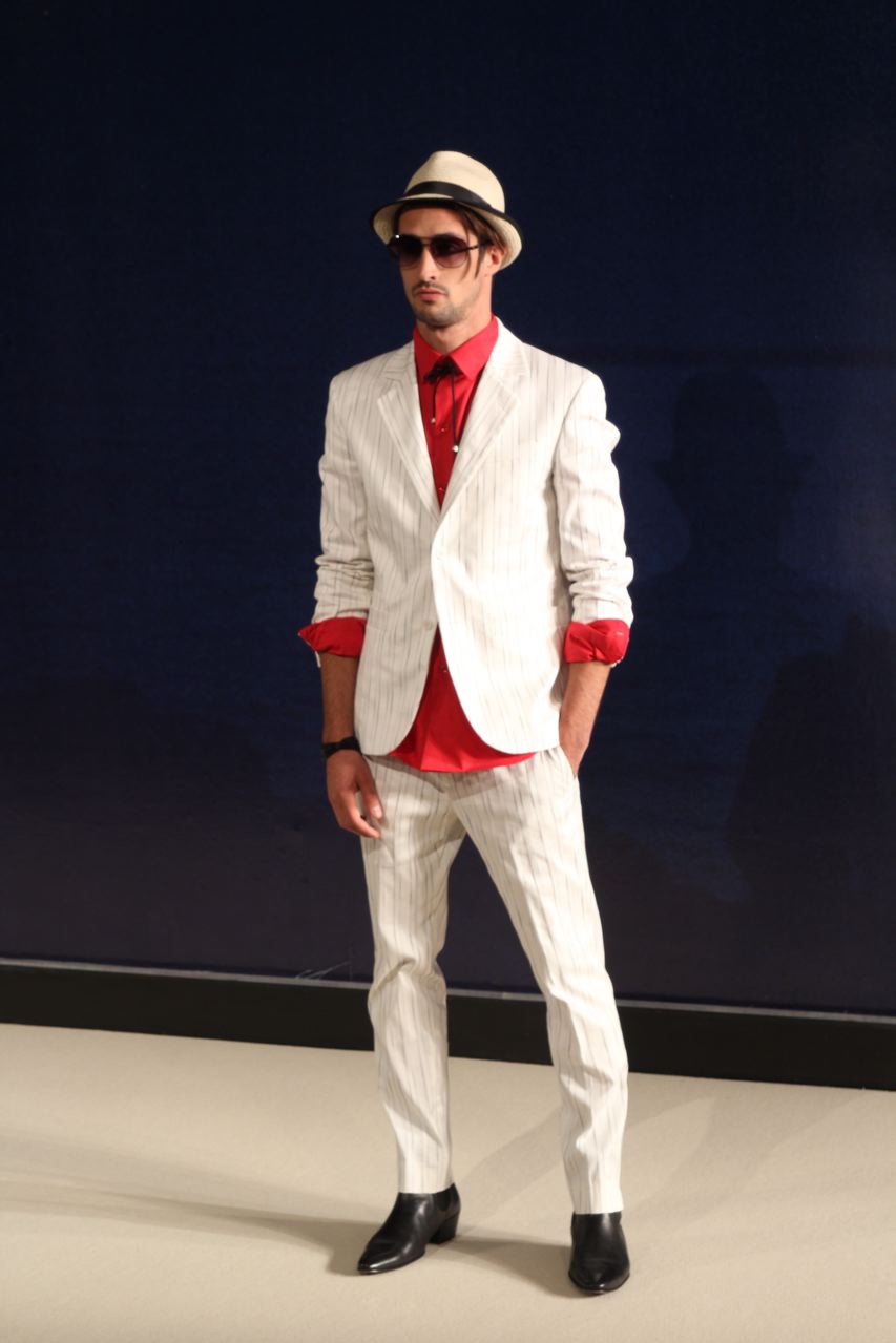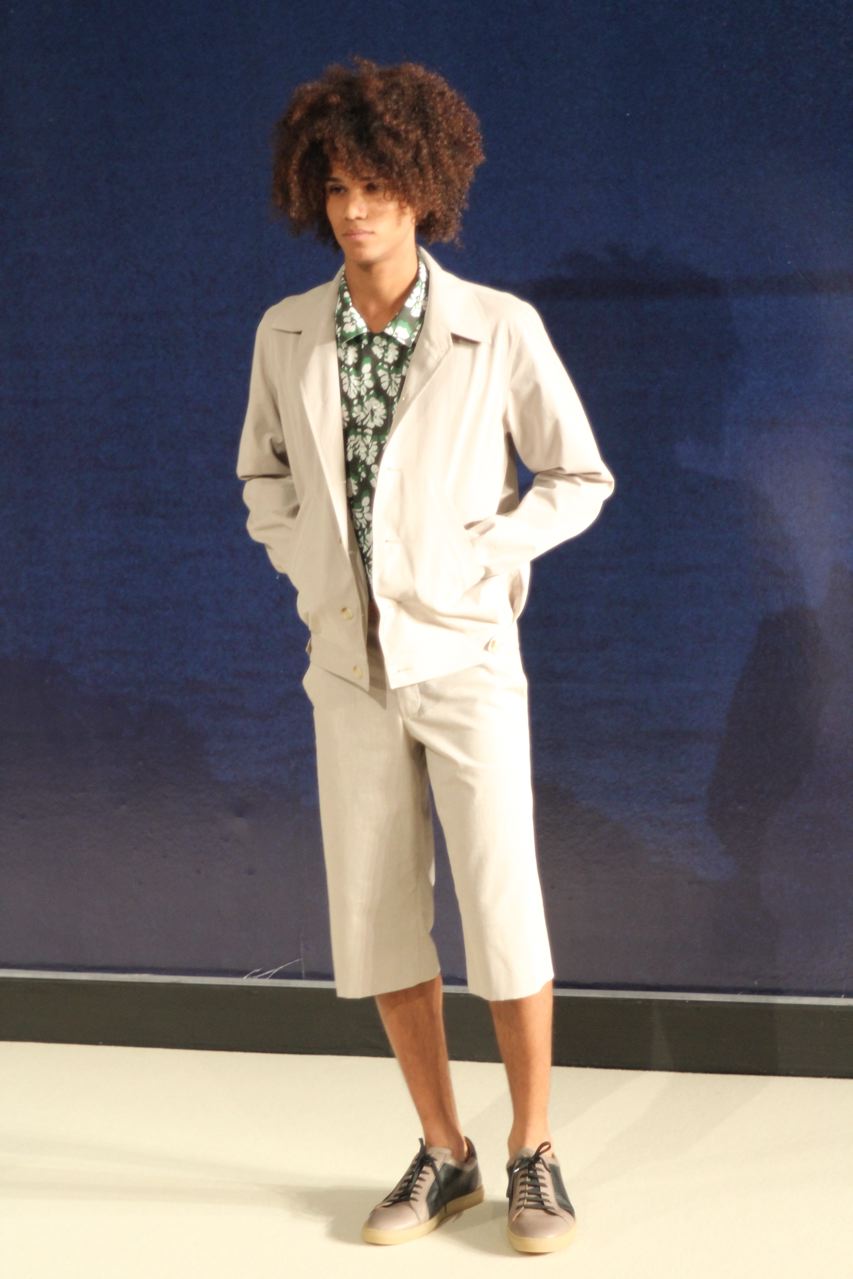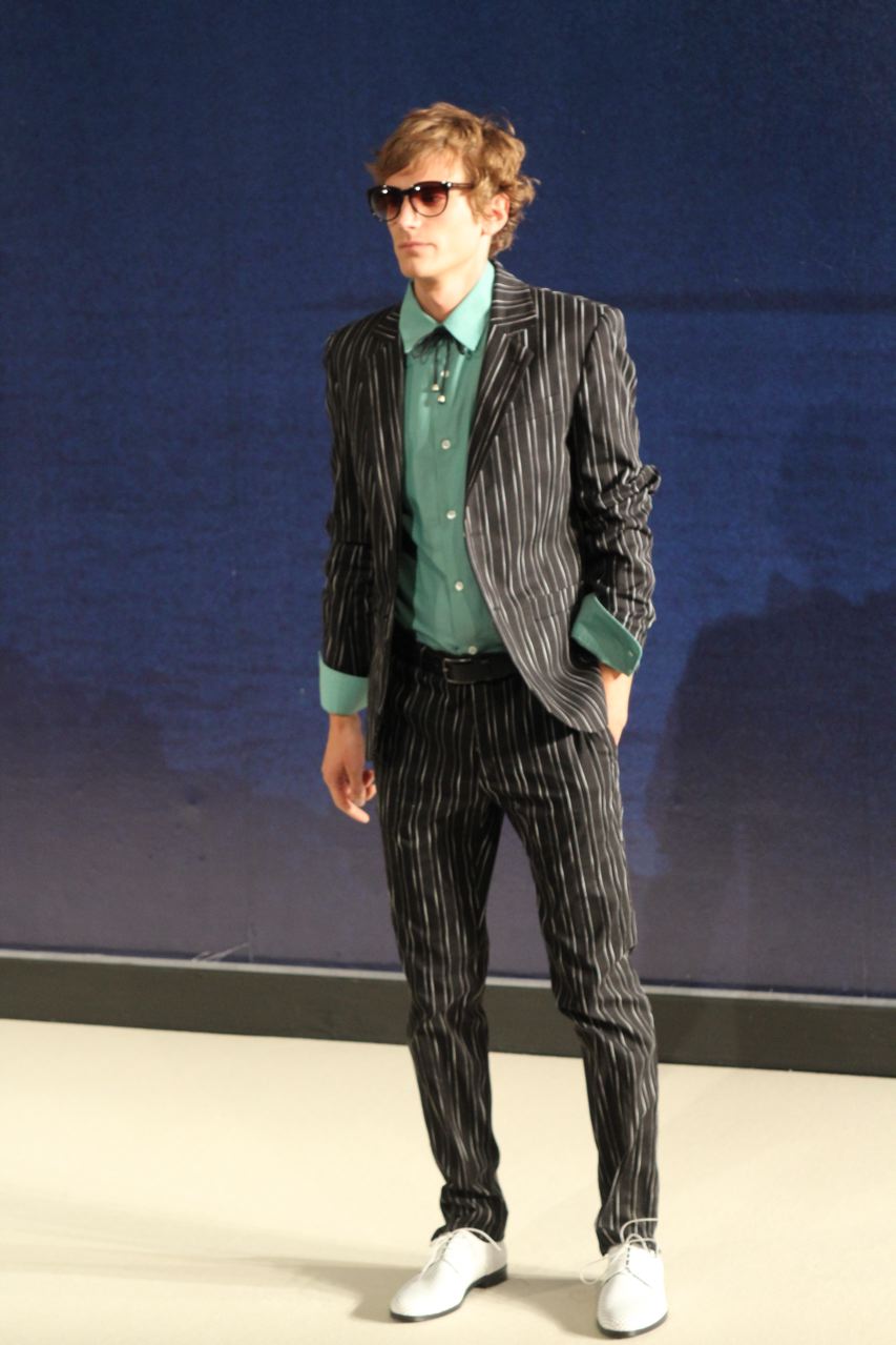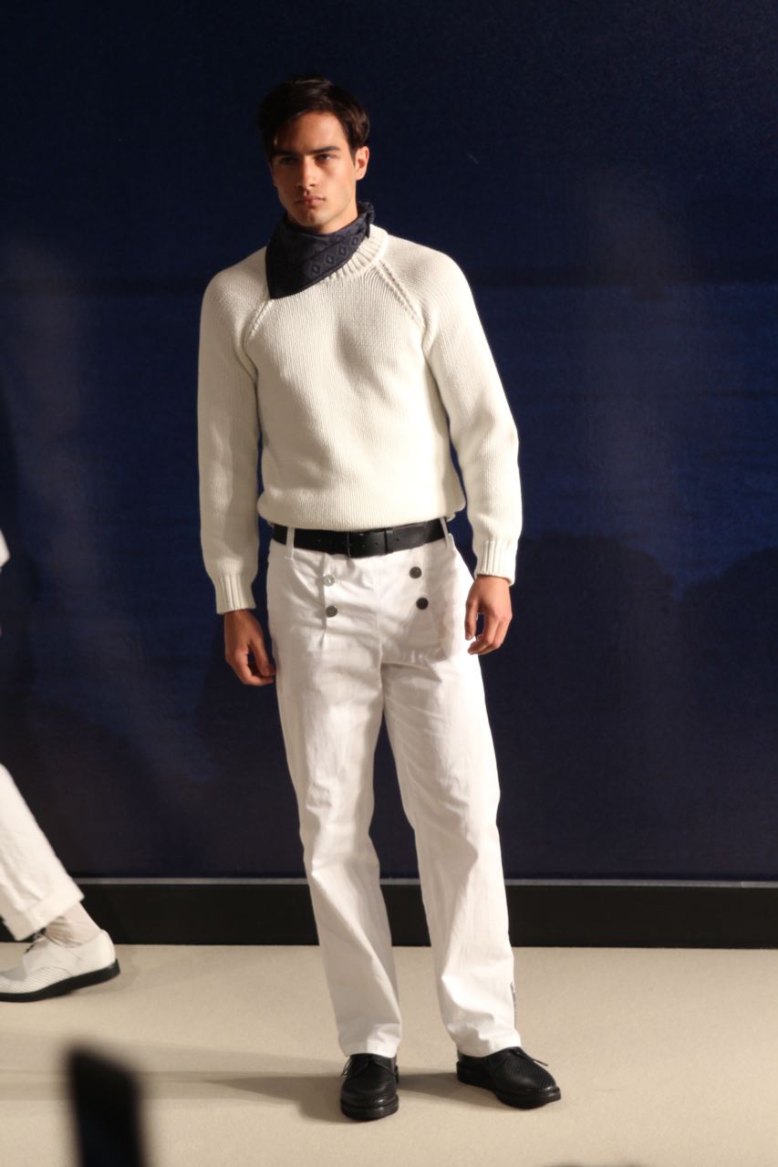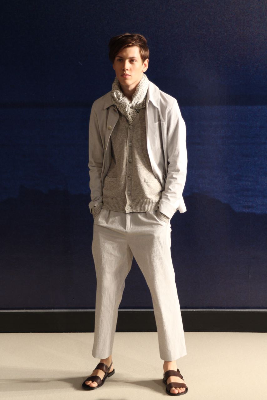 Combinaisons de travail en denim, coton blanc sérigraphie, pantalons et vestes de travail, veste tambourin, t-shirt à rayure. La première partie du défilé d’agnès b présente des pièces inspirées de vêtements de travail. Des habits simples en coton, denim, lin, jerseys et cuir. Gris, bleus, blancs ou à rayures noires et blanches. L’inspiration de la deuxième partie, c’est un parisien revenant de voyage en Inde d’où l’usage de couleurs assez important, avec quelques pièces inspirées de la culture indienne. Certains tissus ont été imprimés dans ce pays. Les coloris sont des dégradés de beige et de gris rehaussés par des couleurs plus vives comme des oranges et des imprimés floraux ou graphiques. Les coupes des pantalons et vestes sont près du corps. Les vêtements de la 3ème partie sont inspirés par le style parisien avec des trenchs, pantalons rayés, costumes près du corps gris et bleus, avec du jaune, du vert d’eau. Des rayures, des imprimés graphiques et un imprimé photo du Canal saint Martin prise par Agnès. Dans la 4ème partie, les vêtements sont inspirés de la période post punk, nouvelle vague en France (période 1978-1983), pendant laquelle la révolte des jeunes contre la société s’exprimait au travers de différents mouvements musicaux et artistiques. Les couleurs : blanc, rouge, noir, rose. La fin du défilé présente des tenues de gala, tenues de soirée, sur le tapis rouge d’un festival de cinéma.