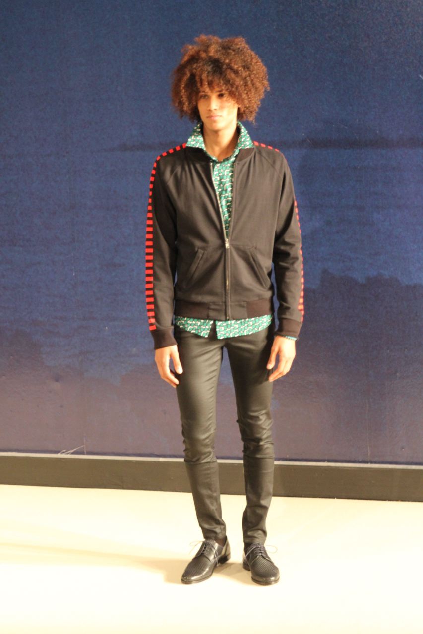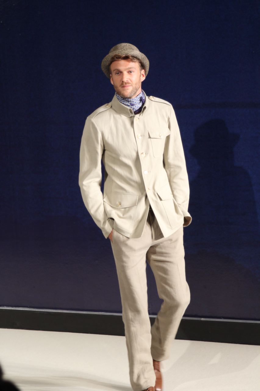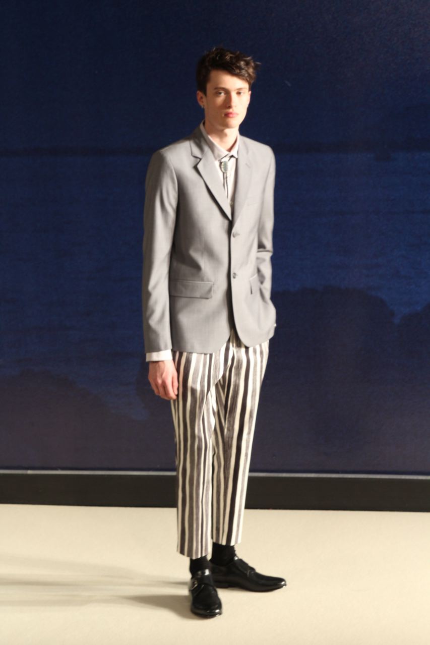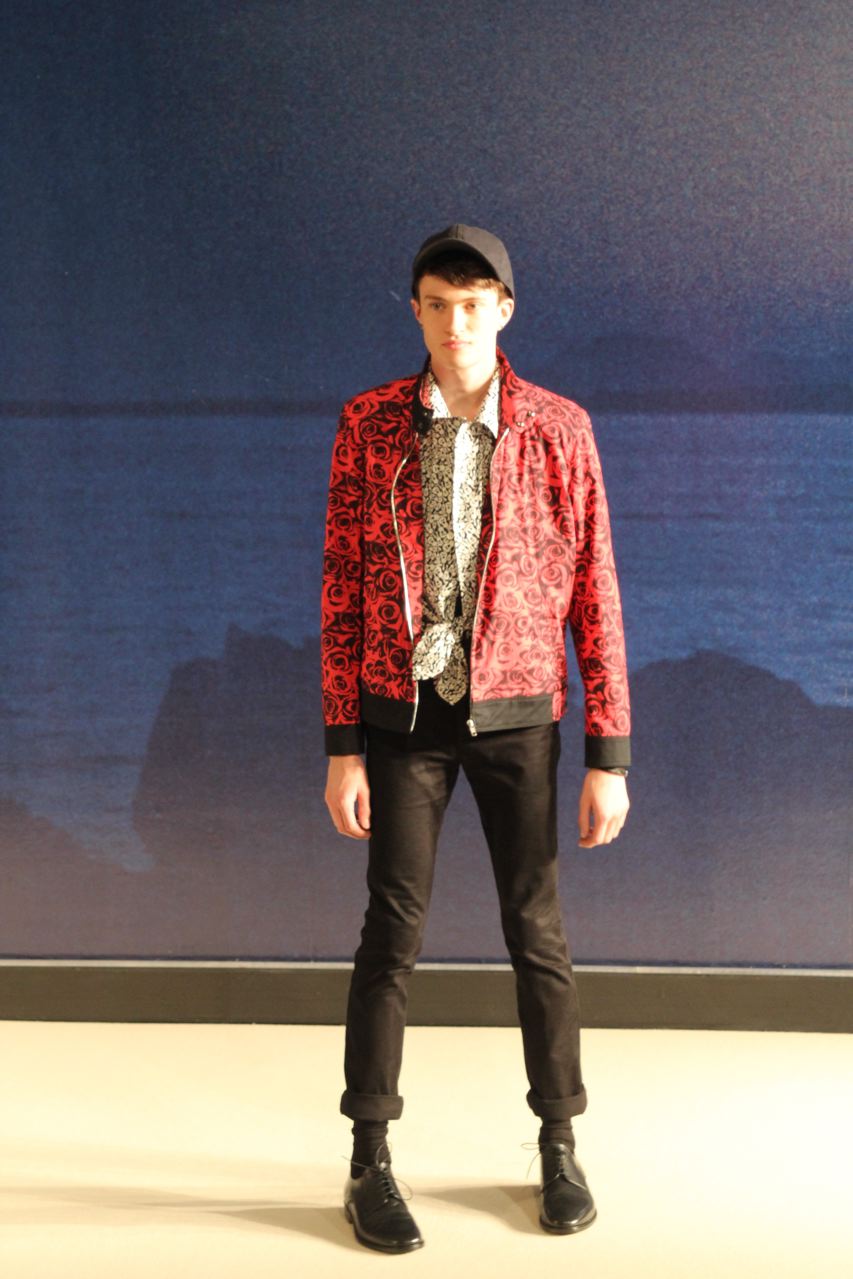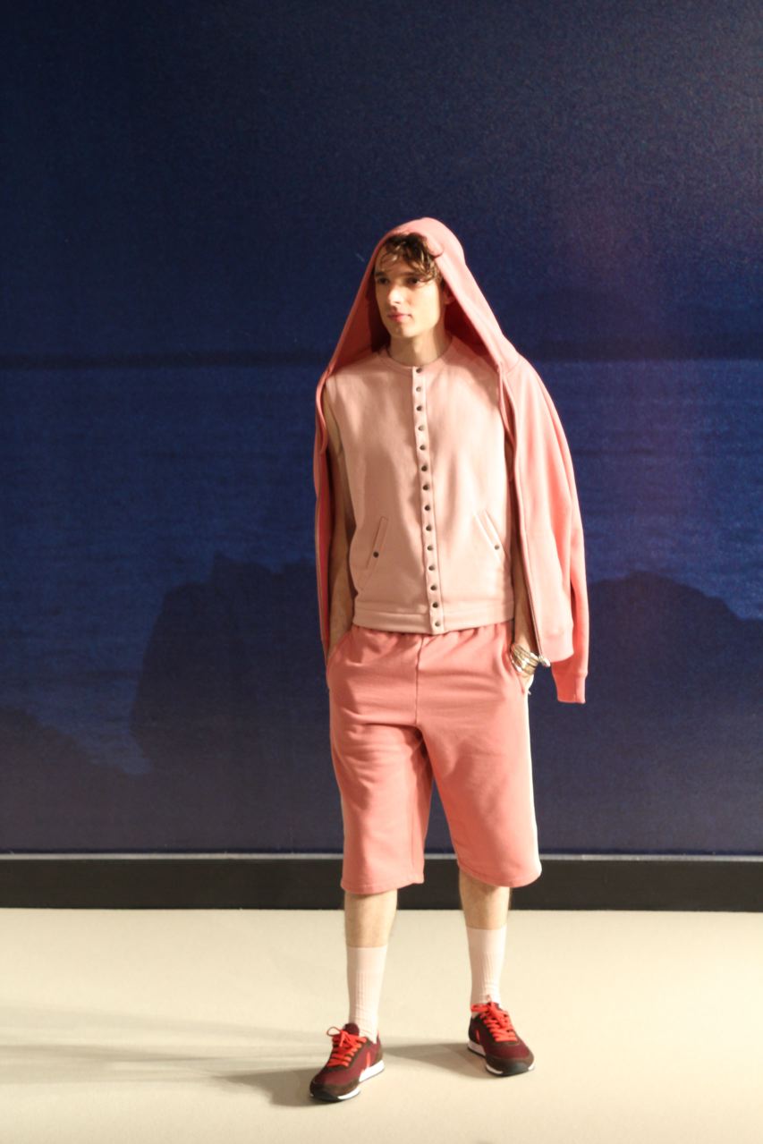 Combinaisons de travail en denim, coton blanc sérigraphie, pantalons et vestes de travail, veste tambourin, t-shirt à rayure. La première partie du défilé d’agnès b présente des pièces inspirées de vêtements de travail. Des habits simples en coton, denim, lin, jerseys et cuir. Gris, bleus, blancs ou à rayures noires et blanches. L’inspiration de la deuxième partie, c’est un parisien revenant de voyage en Inde d’où l’usage de couleurs assez important, avec quelques pièces inspirées de la culture indienne. Certains tissus ont été imprimés dans ce pays. Les coloris sont des dégradés de beige et de gris rehaussés par des couleurs plus vives comme des oranges et des imprimés floraux ou graphiques. Les coupes des pantalons et vestes sont près du corps. Les vêtements de la 3ème partie sont inspirés par le style parisien avec des trenchs, pantalons rayés, costumes près du corps gris et bleus, avec du jaune, du vert d’eau. Des rayures, des imprimés graphiques et un imprimé photo du Canal saint Martin prise par Agnès. Dans la 4ème partie, les vêtements sont inspirés de la période post punk, nouvelle vague en France (période 1978-1983), pendant laquelle la révolte des jeunes contre la société s’exprimait au travers de différents mouvements musicaux et artistiques. Les couleurs : blanc, rouge, noir, rose. La fin du défilé présente des tenues de gala, tenues de soirée, sur le tapis rouge d’un festival de cinéma.