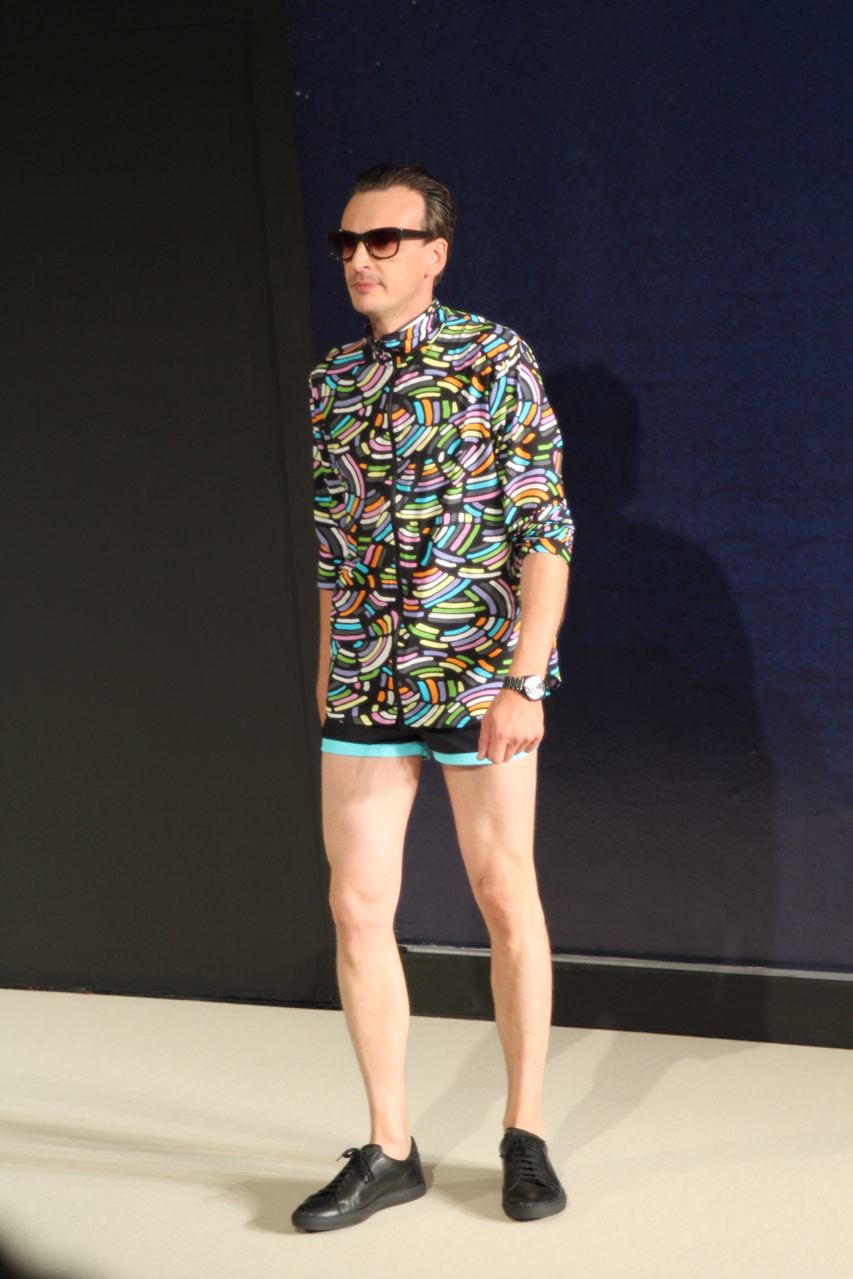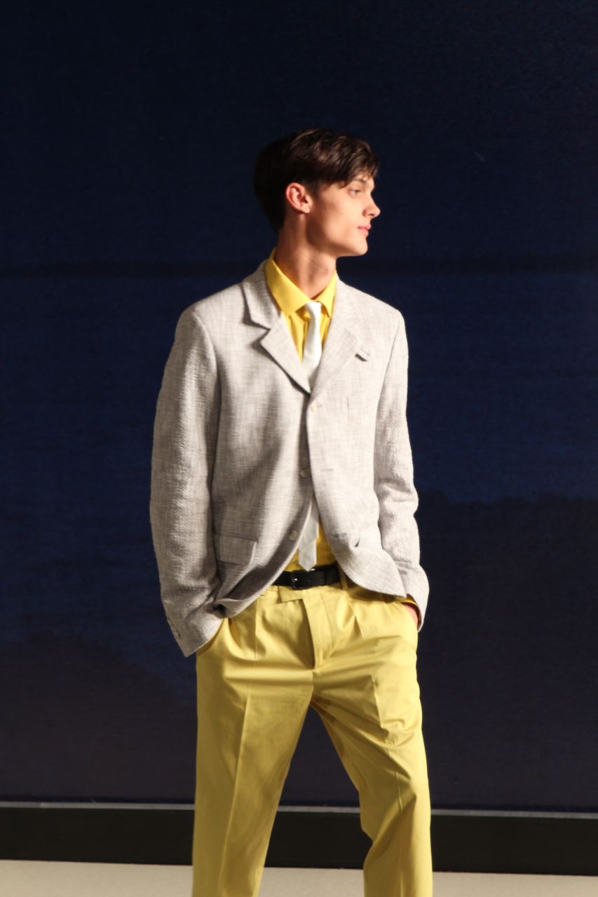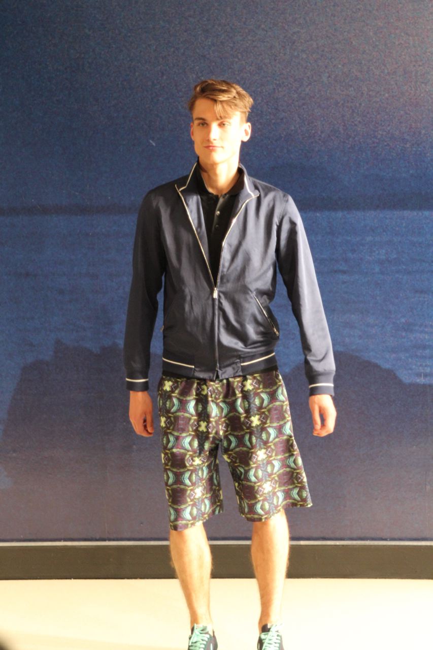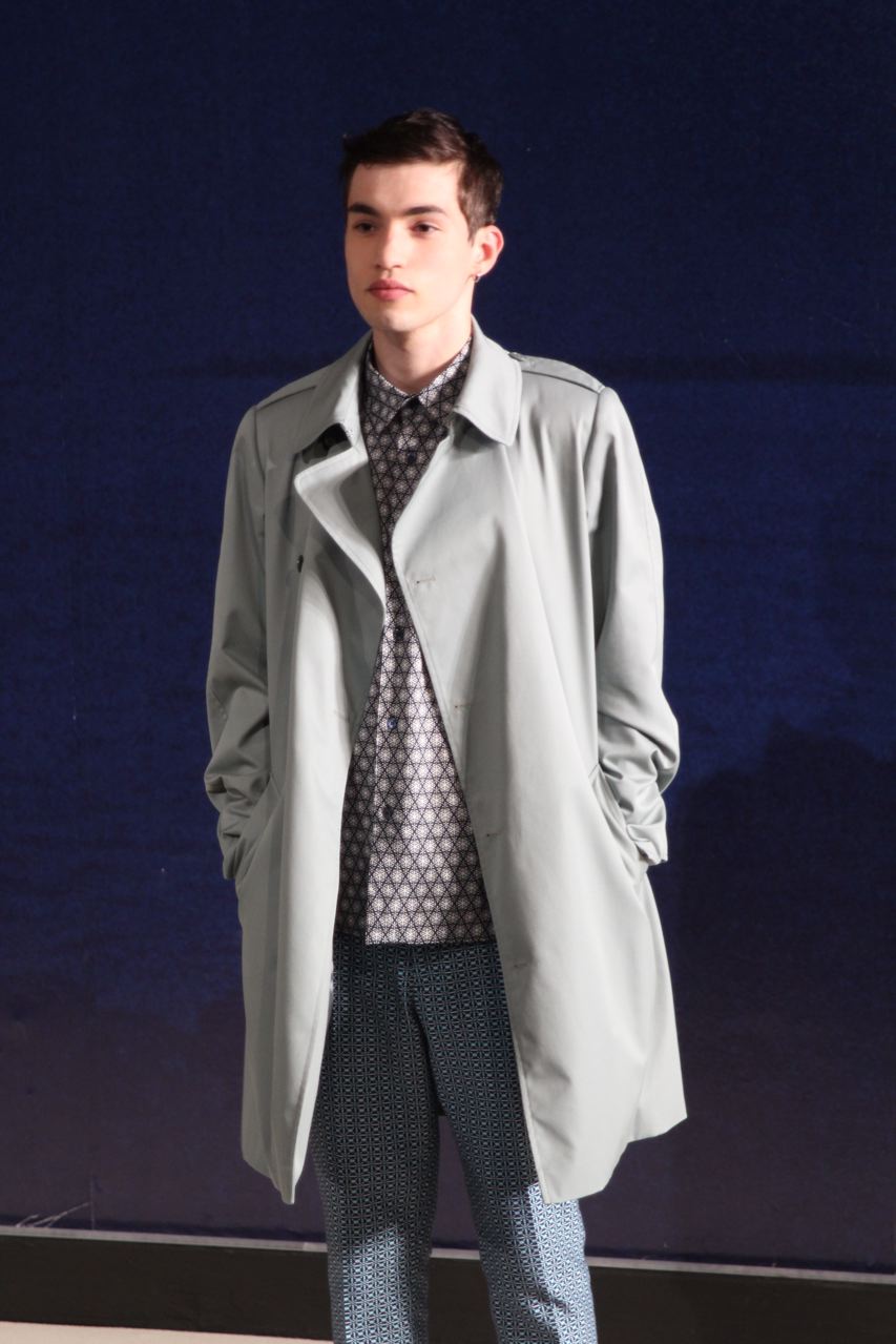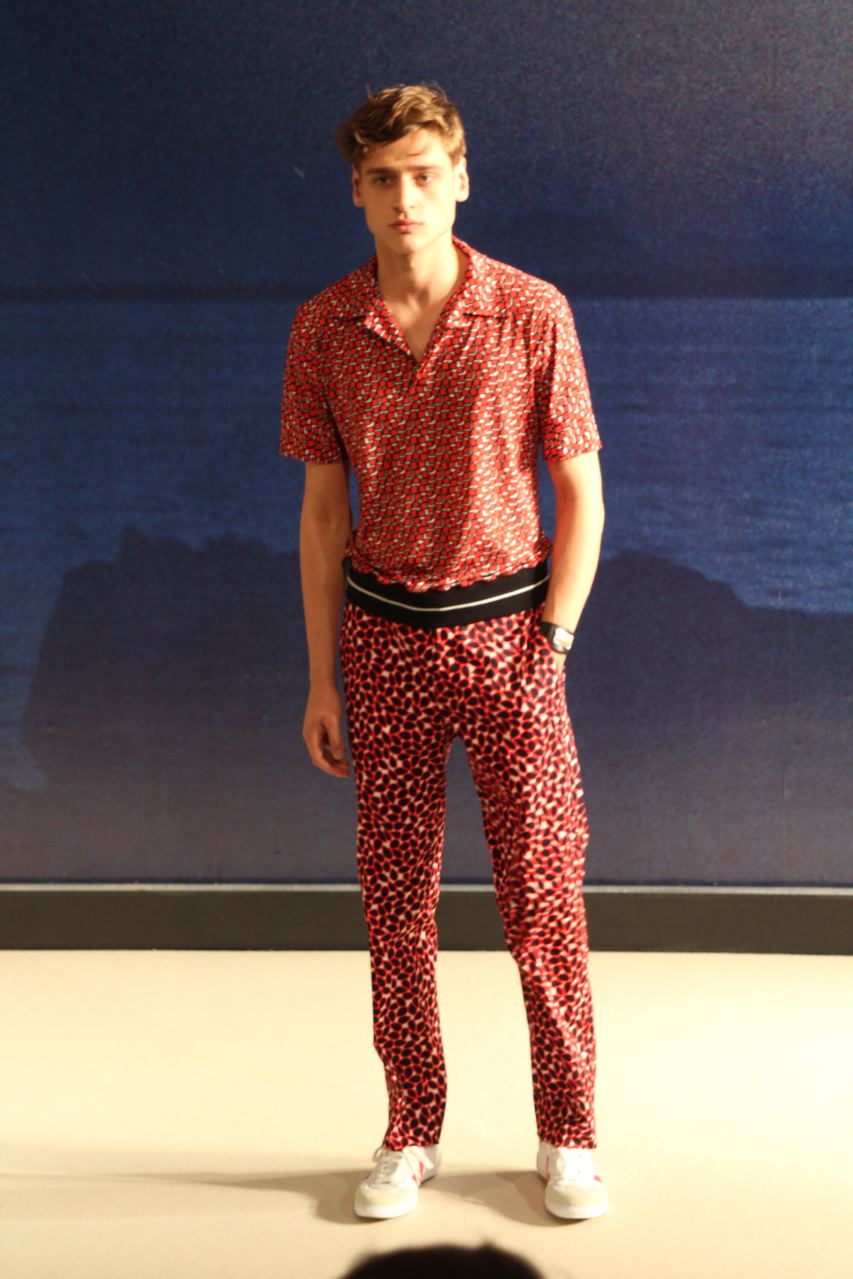 Combinaisons de travail en denim, coton blanc sérigraphie, pantalons et vestes de travail, veste tambourin, t-shirt à rayure. La première partie du défilé d’agnès b présente des pièces inspirées de vêtements de travail. Des habits simples en coton, denim, lin, jerseys et cuir. Gris, bleus, blancs ou à rayures noires et blanches. L’inspiration de la deuxième partie, c’est un parisien revenant de voyage en Inde d’où l’usage de couleurs assez important, avec quelques pièces inspirées de la culture indienne. Certains tissus ont été imprimés dans ce pays. Les coloris sont des dégradés de beige et de gris rehaussés par des couleurs plus vives comme des oranges et des imprimés floraux ou graphiques. Les coupes des pantalons et vestes sont près du corps. Les vêtements de la 3ème partie sont inspirés par le style parisien avec des trenchs, pantalons rayés, costumes près du corps gris et bleus, avec du jaune, du vert d’eau. Des rayures, des imprimés graphiques et un imprimé photo du Canal saint Martin prise par Agnès. Dans la 4ème partie, les vêtements sont inspirés de la période post punk, nouvelle vague en France (période 1978-1983), pendant laquelle la révolte des jeunes contre la société s’exprimait au travers de différents mouvements musicaux et artistiques. Les couleurs : blanc, rouge, noir, rose. La fin du défilé présente des tenues de gala, tenues de soirée, sur le tapis rouge d’un festival de cinéma.