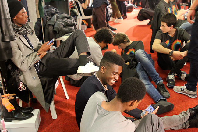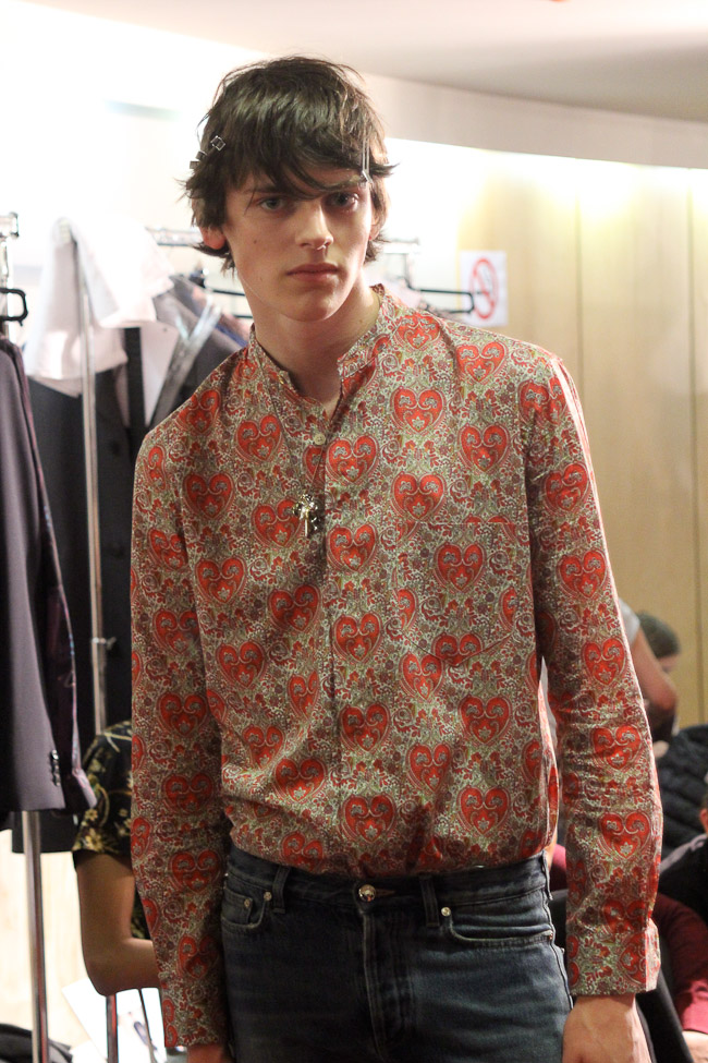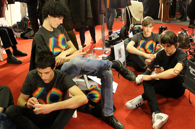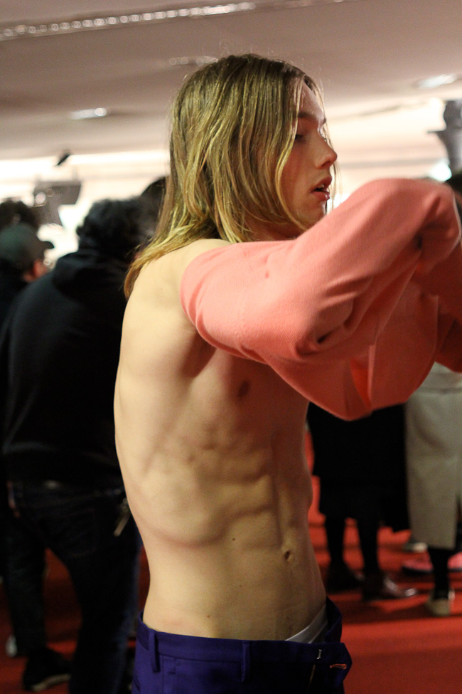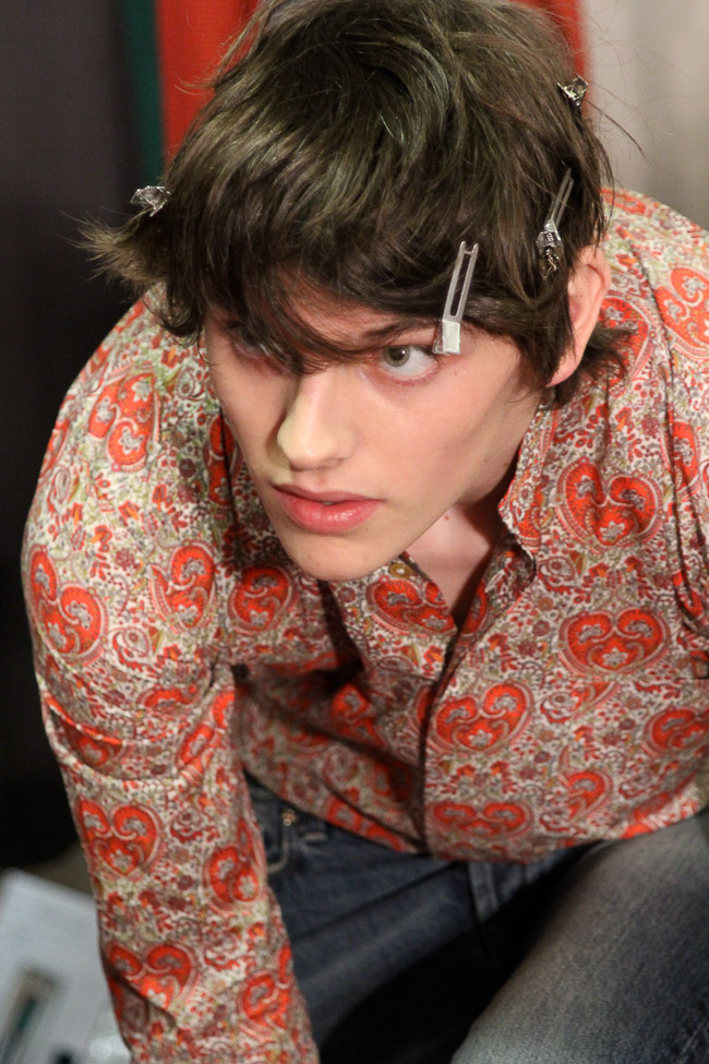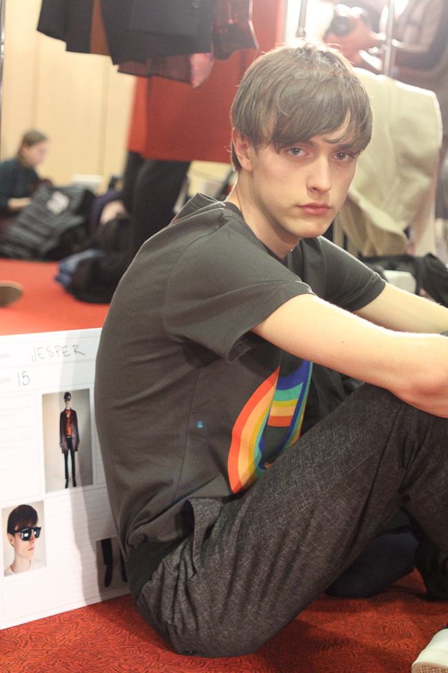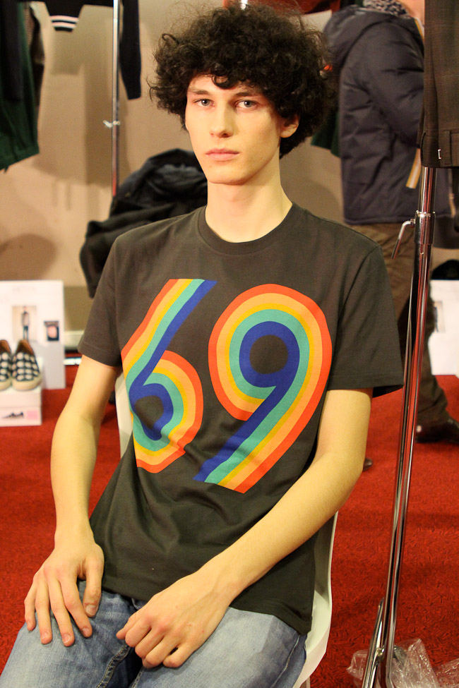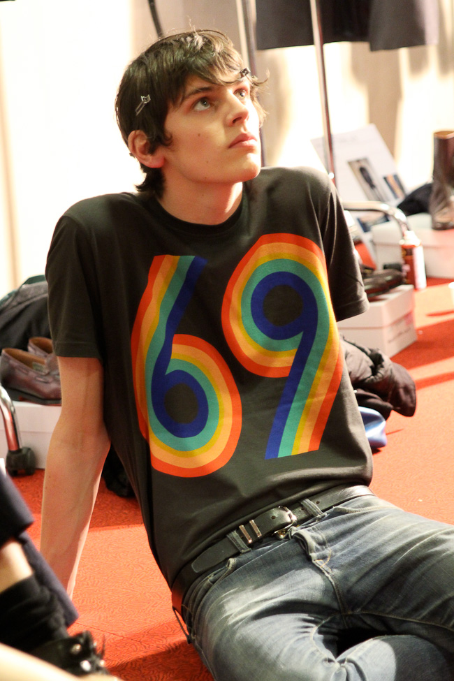 A leur arrivée en backstage, tous les mannequins se voient remettre un T-shirt avant de passer au maquillage et au coiffage. Cette année, le chiffre 69 écrit en lettres arc-en-ciel. Paul Smith embrasse l’esprit libre de la fin des années 60 début des années 70.