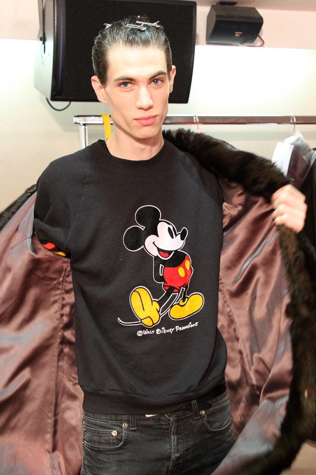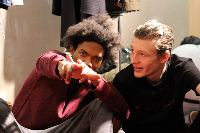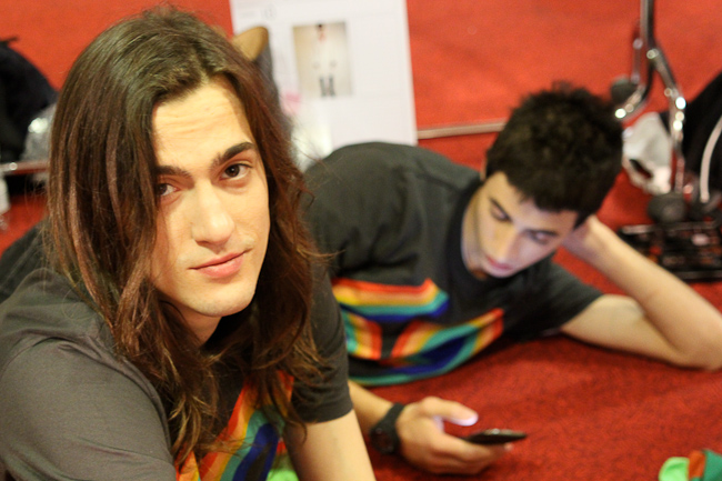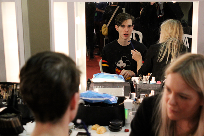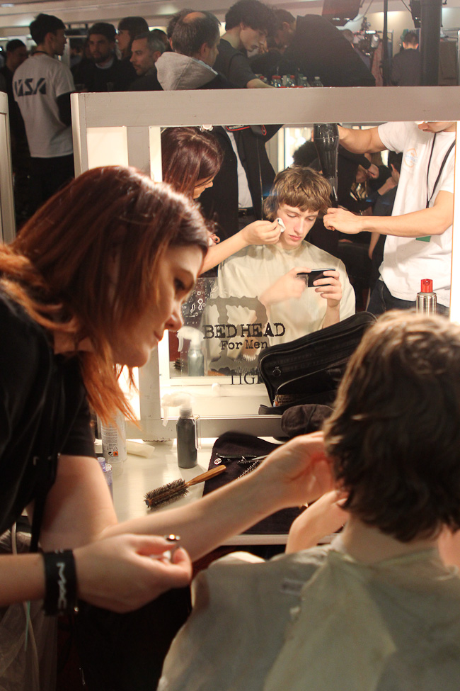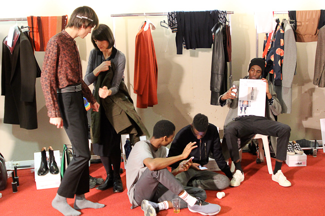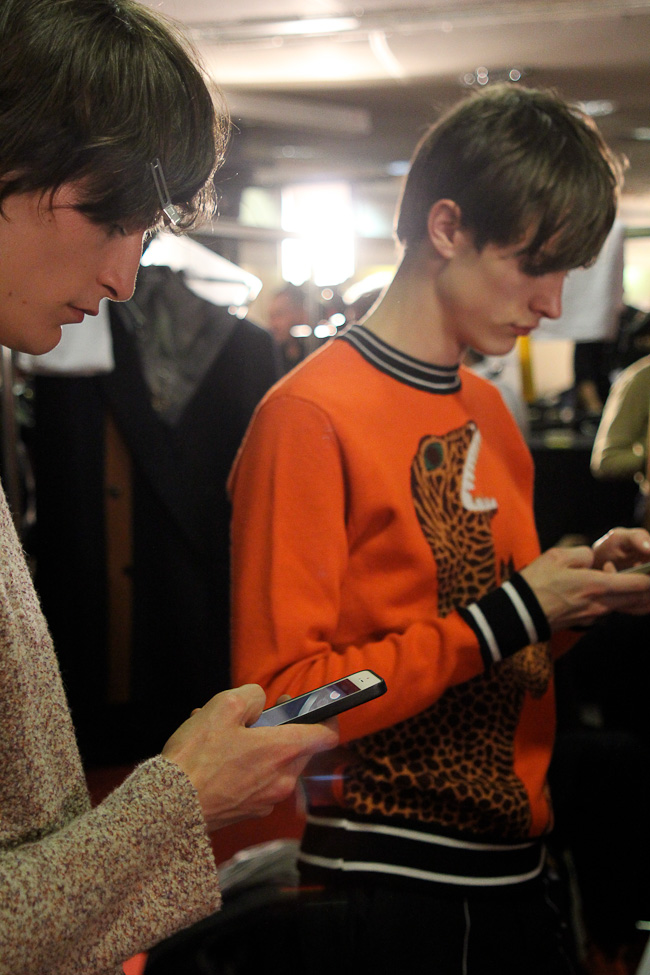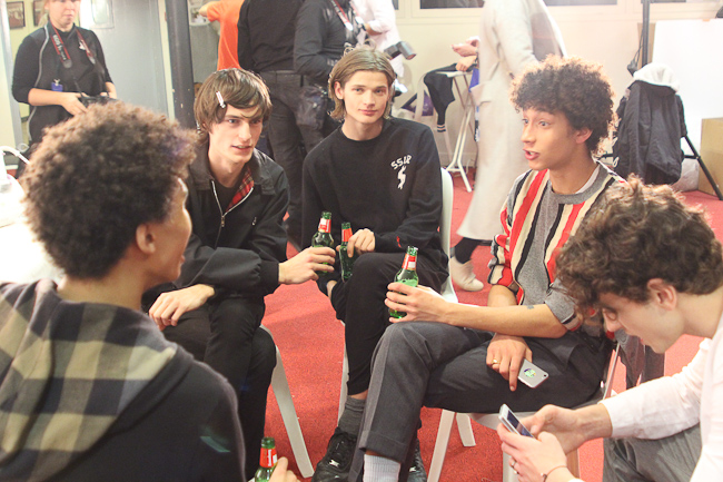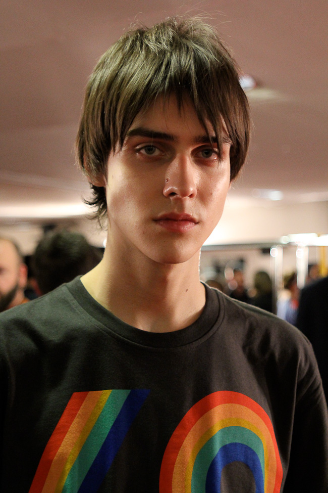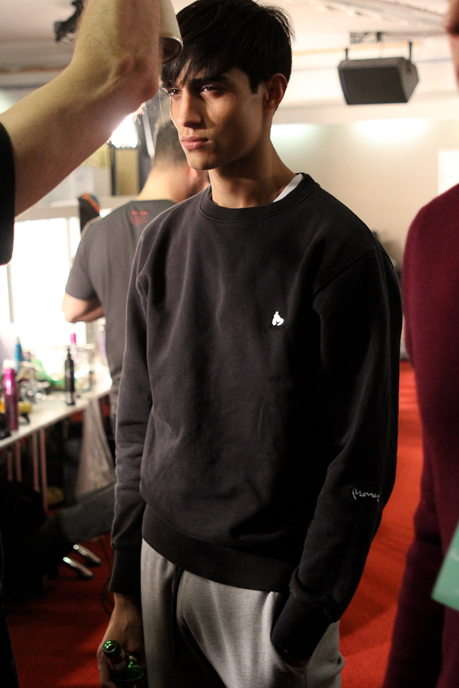 A leur arrivée en backstage, tous les mannequins se voient remettre un T-shirt avant de passer au maquillage et au coiffage. Cette année, le chiffre 69 écrit en lettres arc-en-ciel. Paul Smith embrasse l’esprit libre de la fin des années 60 début des années 70.