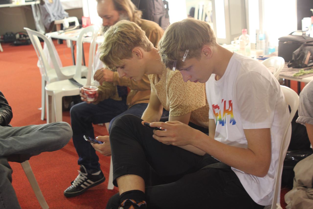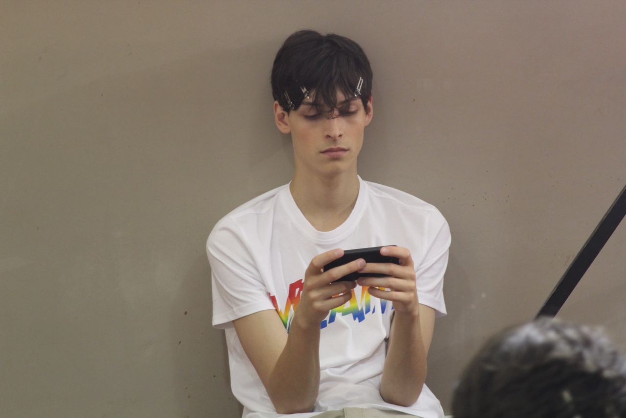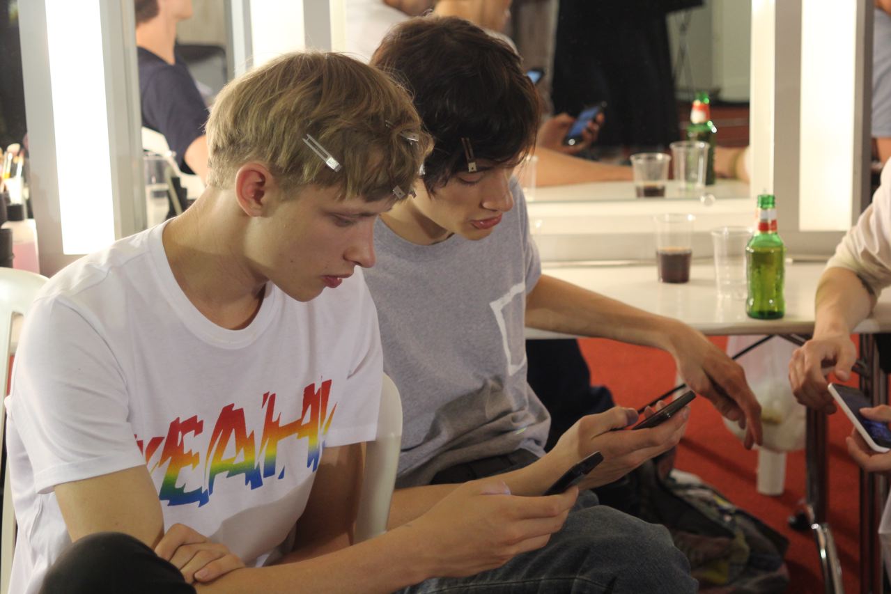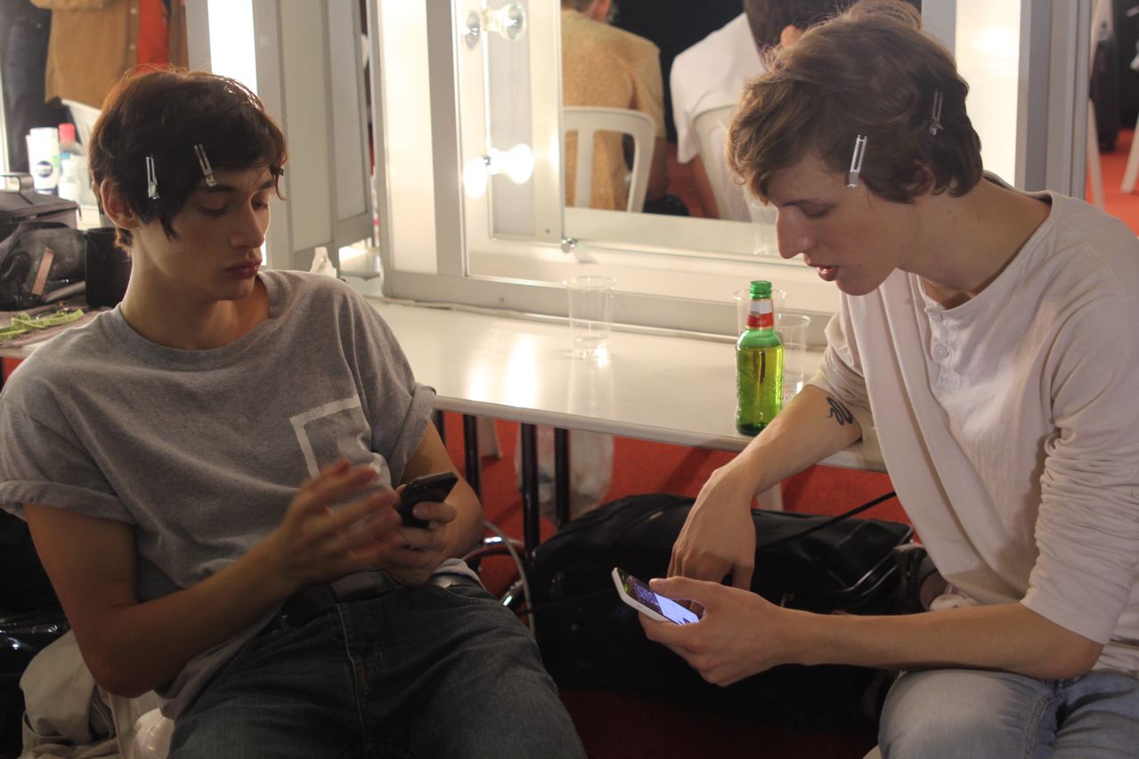 Les jeunes mannequins choisis pour présenter la collection été de Paul Smith profitent de l’avant défilé pour se relaxer, faire une microsieste, méditer, consulter leurs messages sur leurs smartphones, leurs tablettes ou leurs laptops, avant de passer entre les mains, des coiffeurs, maquilleurs et habilleurs.