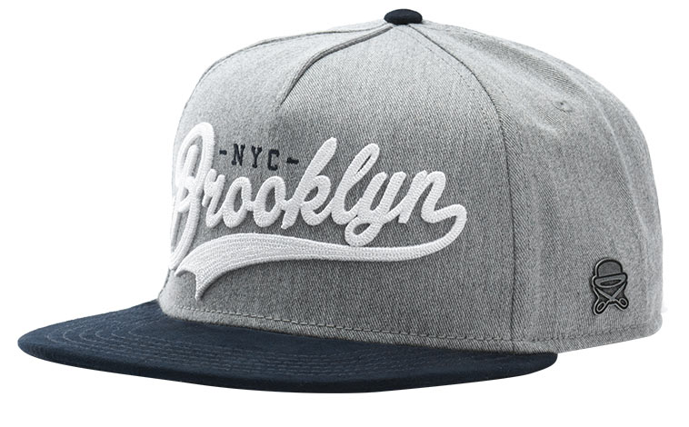 Casquette snapback grise et bleu marine brodée en relief du nom du quartier Brooklyn de NYC de la marque hip-hop Cayler and Sons :