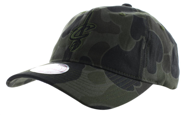 Les imprimés camouflage sont également très à la mode. Exemple avec ce modèle Mitchell & Ness, brodé du logo de l’équipe NBA des Cavaliers de Cleveland :