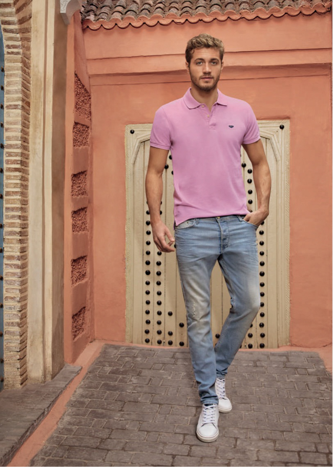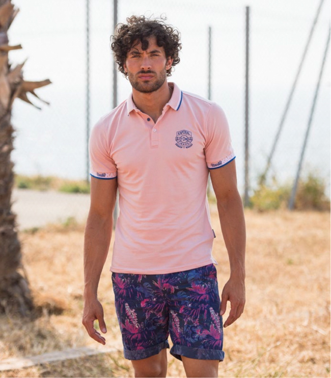 Les polos suivent à peu près les mêmes tendances mode que les chemisettes avec des imprimés de végétaux tropicaux, des micro motifs répétitifs et des rayures marinière. Evidemment les marques propose aussi énormément d’unis avec parfois un liseré pour souligner le col et le bas des manches. Le colorama est large, mais les jaunes et les roses sont particulièrement nombreux (je reviendrai sur ces 2 couleurs de été 2018 dans un prochain article). Le rose vient du monde du rugby. Parfois le col est d’une autre couleur que le corps. Les coupes sont souvent très ajustées, près du corps pour faire ressortir les pectoraux.
