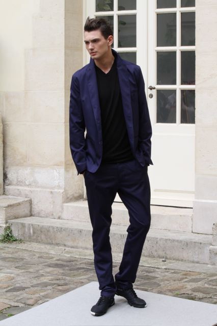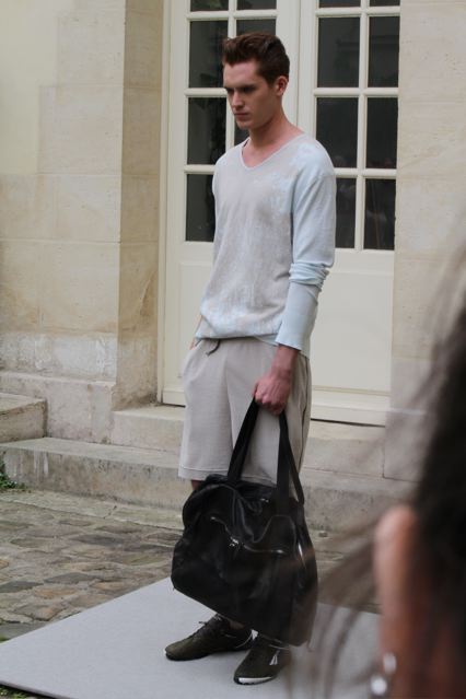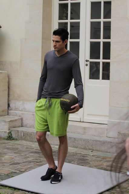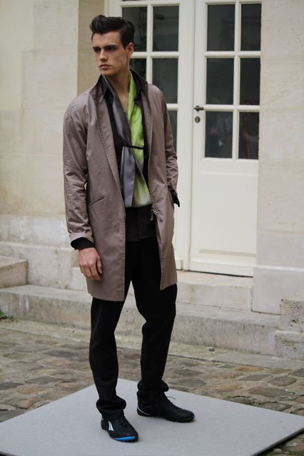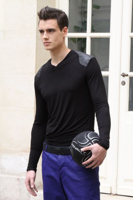 Gustavo Lins débute une collaboration avec le label de vêtements de sport brésilien « Penalty ». Des pièces inspirées du foot viennent ainsi se mêler un l’univers formel du tailleur. Un T-shirt gris kaki gansé de cuir à l’épaule, un short en maille de coton couleur pelouse fraiche. Un imperméable réversible en coton au touché papier porté en même temps que des chaussures et ballon de foot en cuir à multi surpiqûres. Un autre T-shirt porte des empiècements de cuir noir à l’épaule qui sont en fait 1/8ème d’un ballon de foot. Des pantalons coulissés à la taille… Mais aussi pour le soir, un smoking avec des revers en satin de soie ou une veste spiralée en cuir de chèvre…