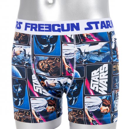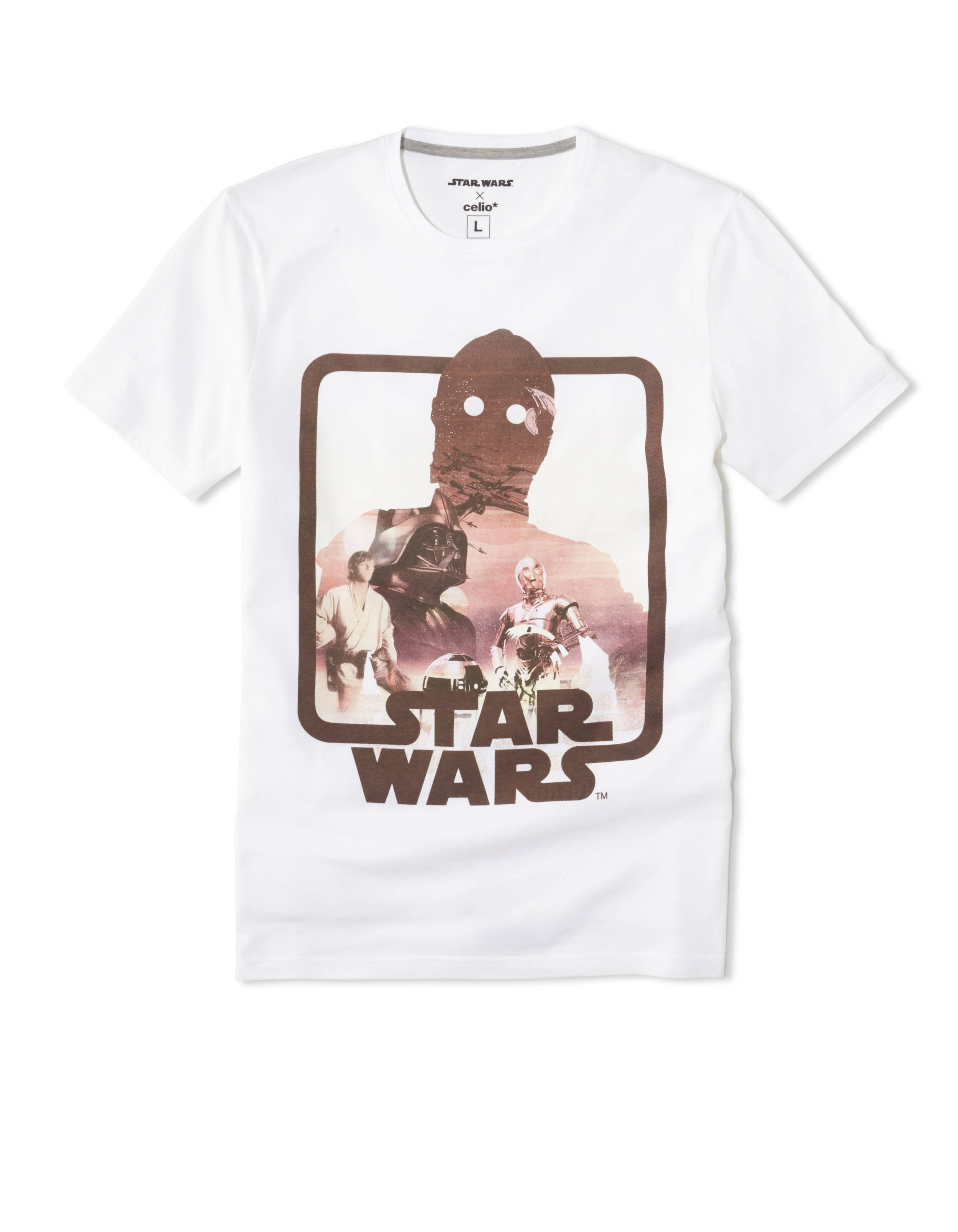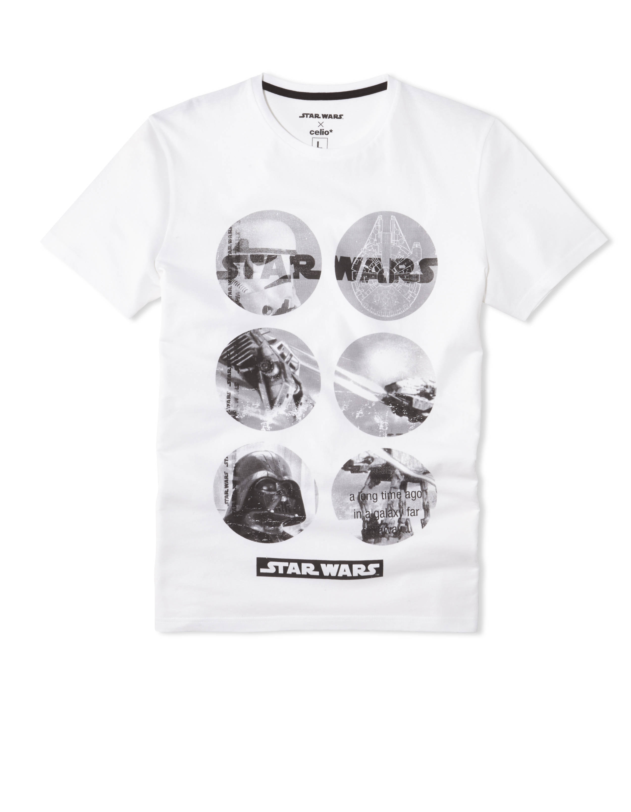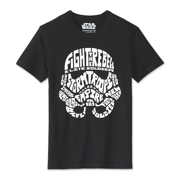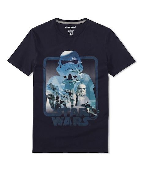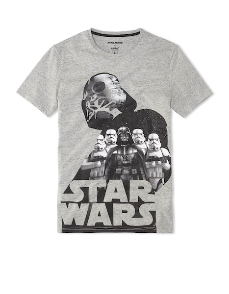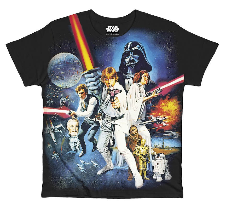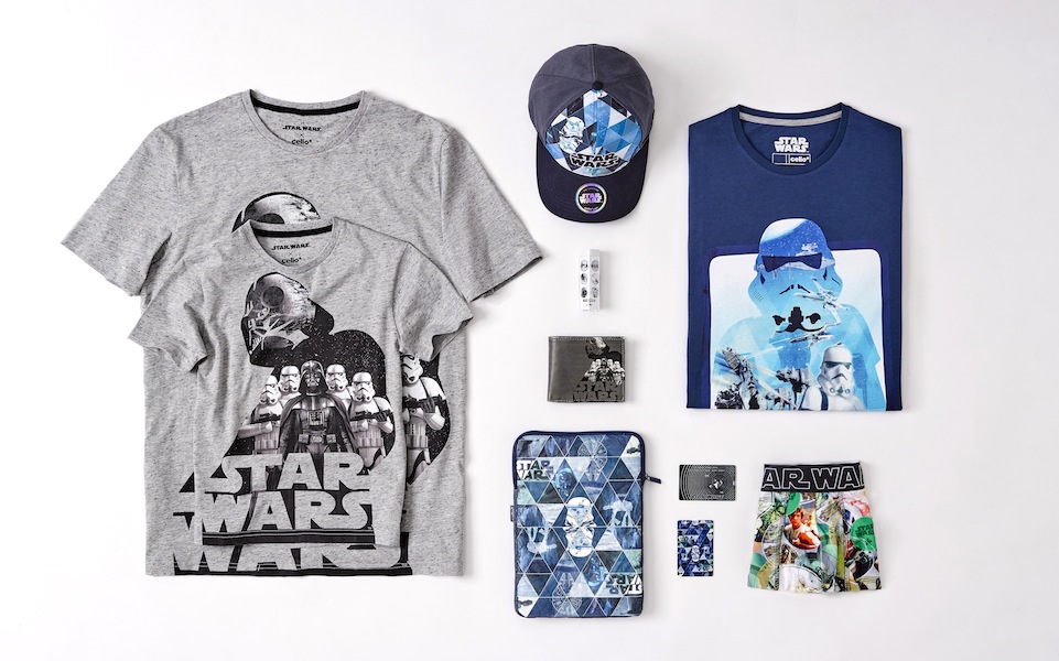 Les imprimés reprennent le plus souvent des visuels de la première trilogie, Star wars un nouvel espoir, L’empire contre-attaque et Le retour du Jedi. La gamme la plus étendue est proposée par Celio avec 8 tee shirts, un pyjama, des chaussettes, caleçons, casquettes, housse pour tablette, batterie externe, portefeuille et clé USB.