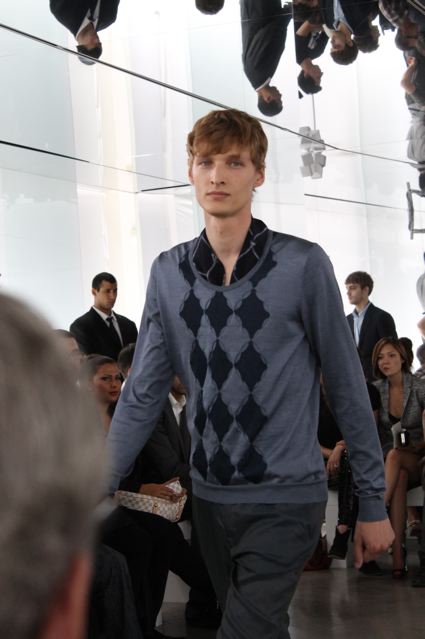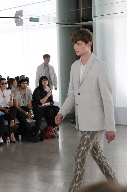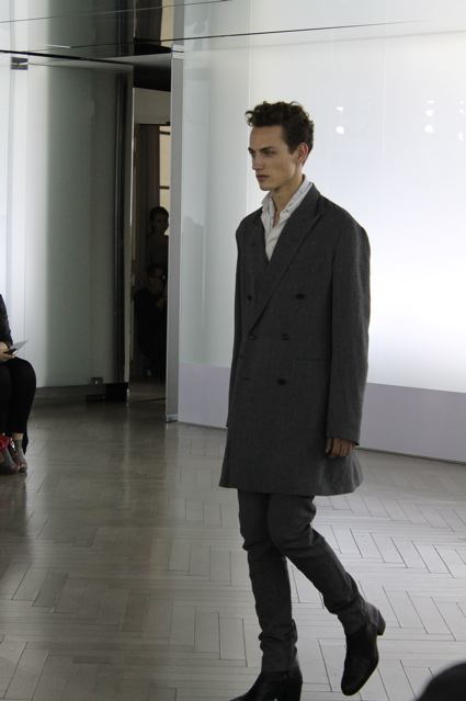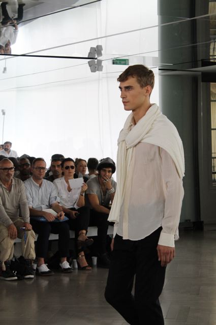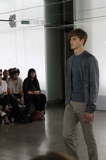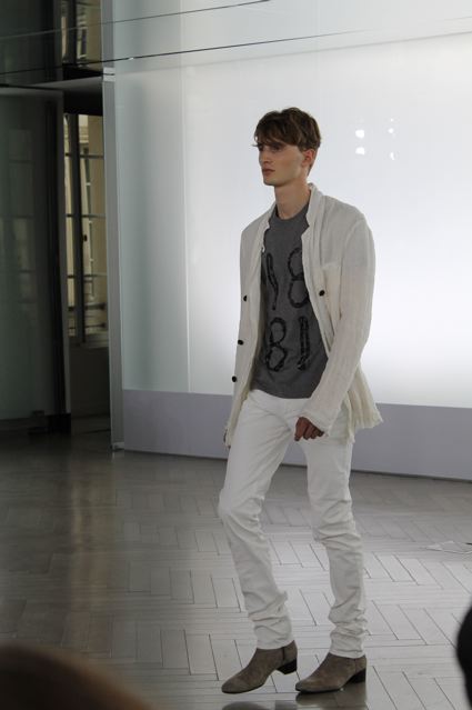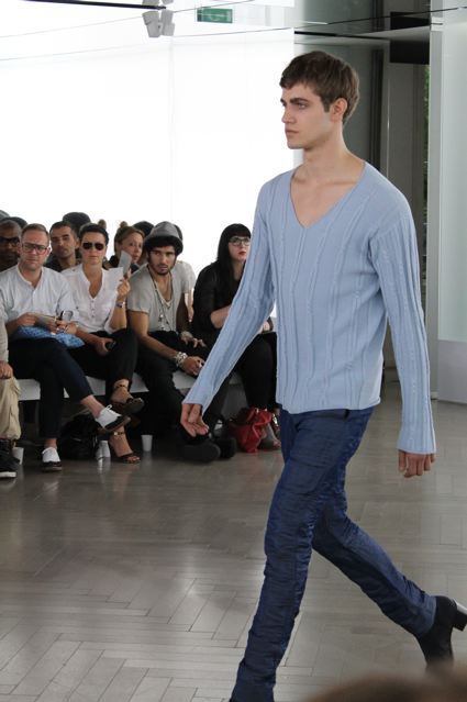 La direction prise par Cerruti pour la collection prêt-à-porter homme de l’été 2012 est très loin des codes établis par le fondateur de la maison, Nino Cerruti connu pour la qualité de ses draperies et ses coupes impeccables mettant en valeur la silhouette de l’homme. Les vêtements sont plutôt basiques avec des Tee shirts, gilets, vestes, pantalons, tous simples. Pour certaines vestes et blousons, j’ai parfois eu l’impression que les mannequins portaient des vêtements trop grands pour eux. Avec des coutures tombant mal au niveau des épaules.