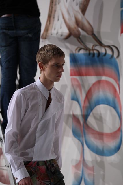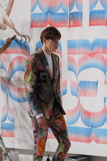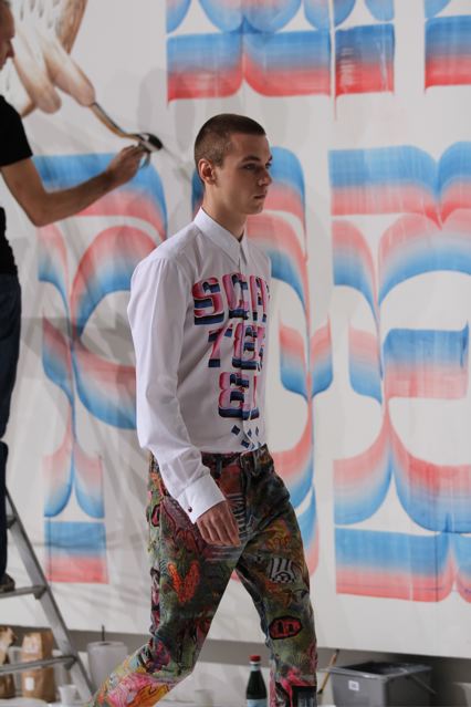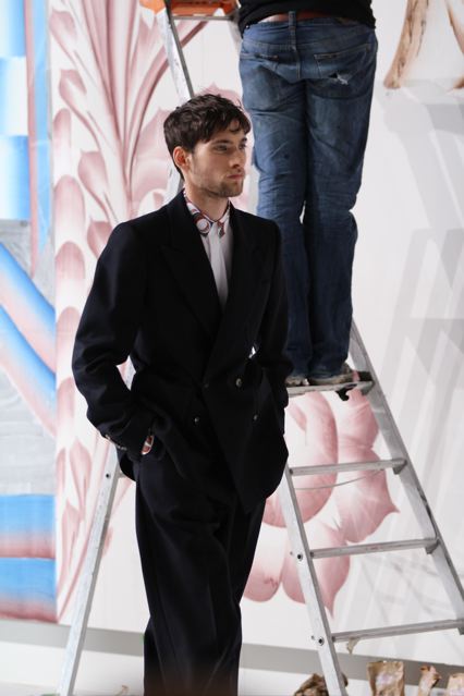 Le créateur belge Dries Van Noten a présenté une collection homme intitulée « Lord Arthur Savile’s crime » (titre d’une nouvelle d’Oscar Wilde) avec des graphismes très forts sur des manteaux, chemises et pantalons, rappelant le mouvement psychédélique. Des lettres calligraphiées reprises sur plusieurs pièces du défilé. Quelques superbes manteaux d’inspiration caban, à fermeture croisée et double boutonnage. De drôles de tricots babacool. Des gros pulls douillets. Des tenues plus classiques avec des vestes en velours. Des chemises blanches assez originales avec une fermeture qui rappelle les blouses des chefs cuisiniers. Le créateur explique sa démarche comme une sorte de rencontre entre l’élégance victorienne d’Oscar Wilde et la folie des années 60 de Frank Zappa.