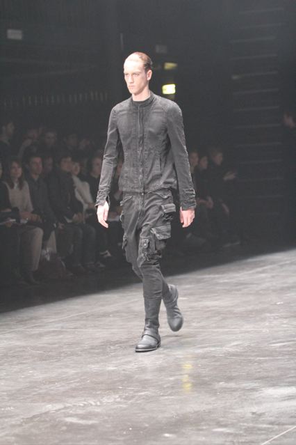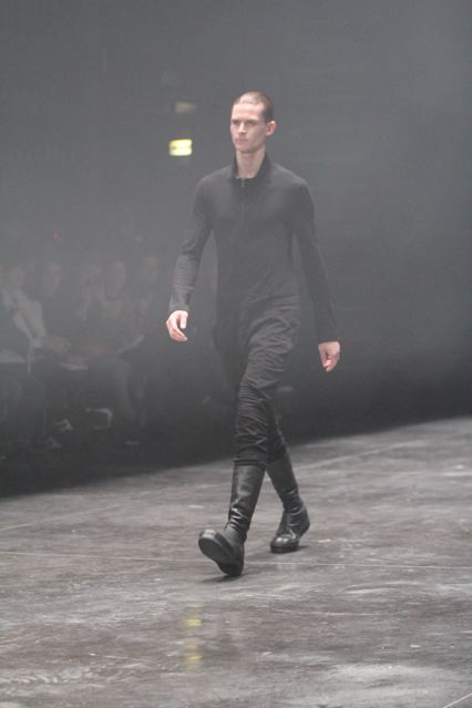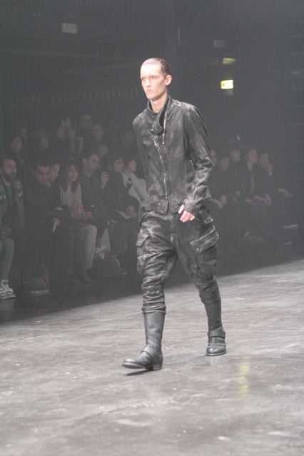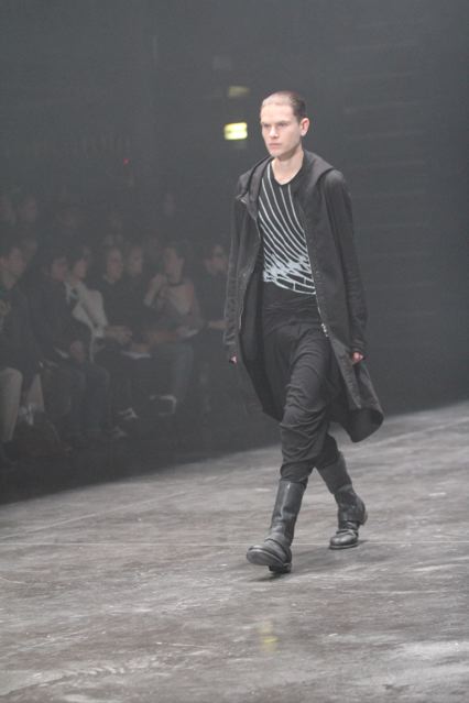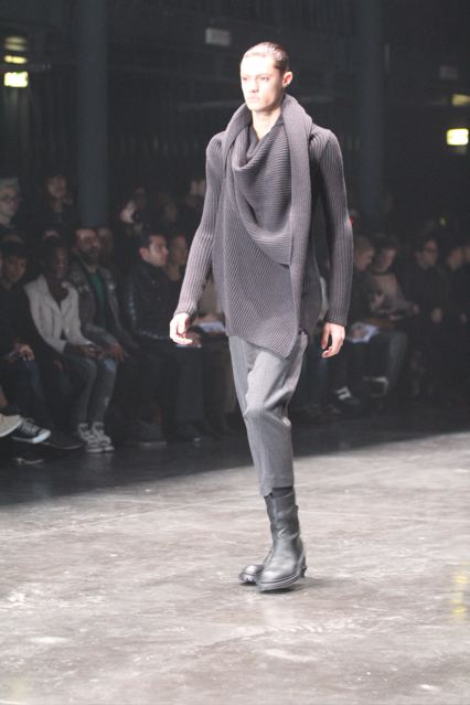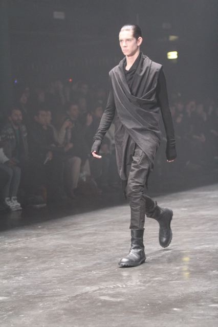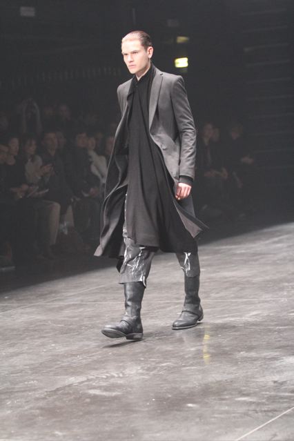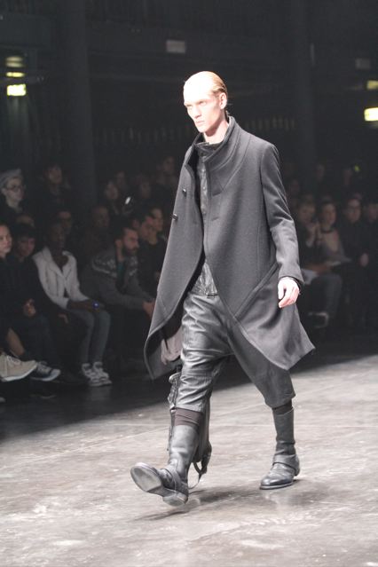 Je poursuis mes comptes-rendus de la fashion week homme hiver 2012 avec le défilé de Julius. De saison en saison, je m’enthousiasme pour cette marque. On retrouve cet excellent travail de drapier avec de très longs manteaux, des écharpes, capes, pantalons de toutes sortes, mais toujours courts. En lainage, cuir, coton enduit. Les couleurs sont comme d’habitude : noires, grises, cendres.