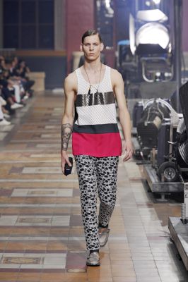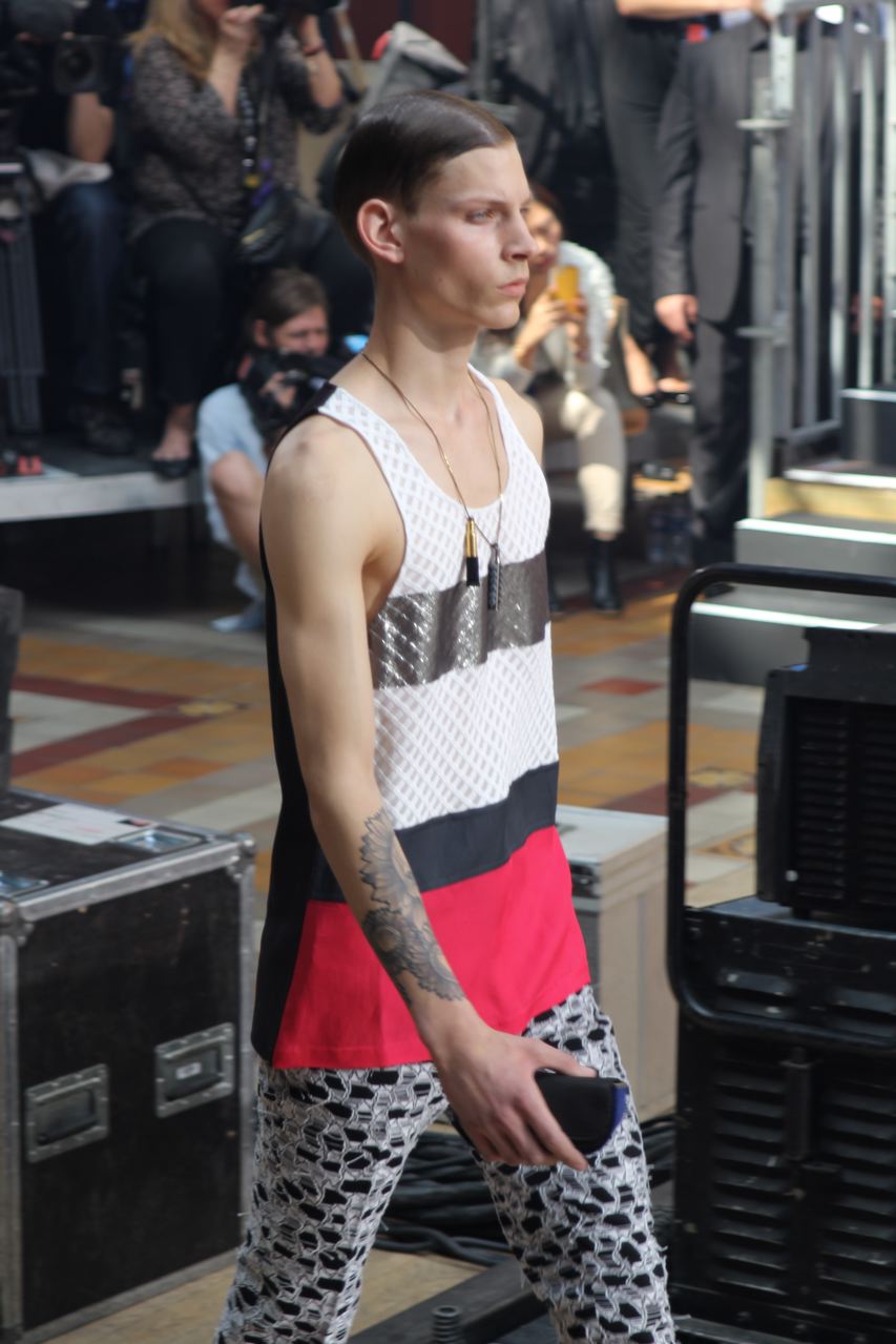 Les associations de matières sont particulièrement travaillées sur les débardeurs aux bandes lamées qui affichent un aspect graphique, alternant brillant et mat, aspect rugueux ou lisse. L’un d’eux est couleur de peau ce qui de loin donne l’impression d’un torse nu. Certains vêtements tricolores m’évoquent des toiles de Mondrian (cliquez pour lire mon article sur ce sujet).