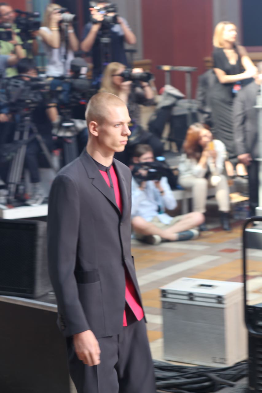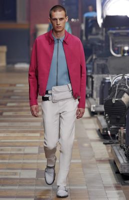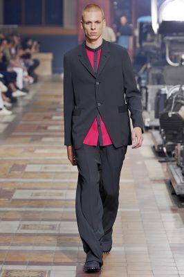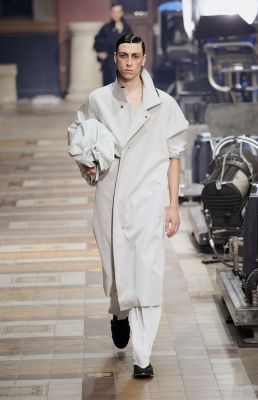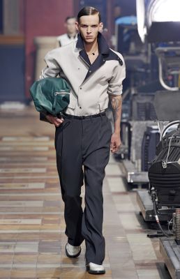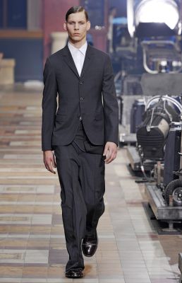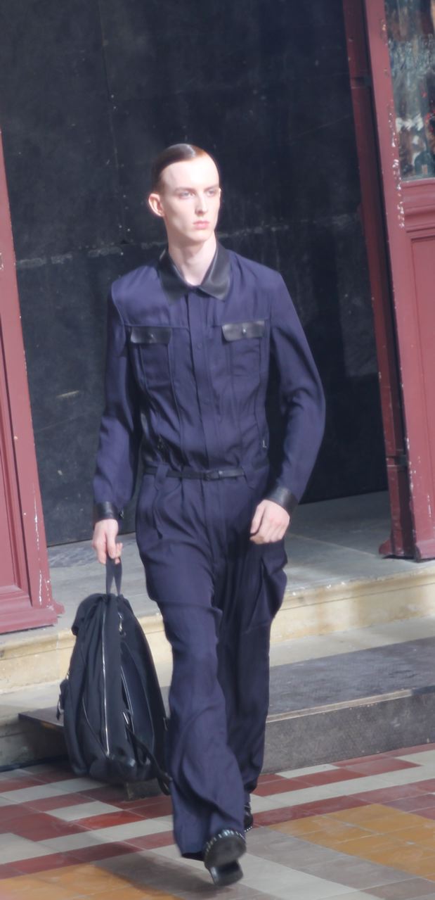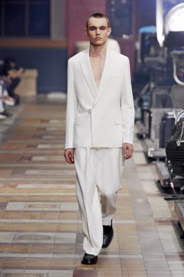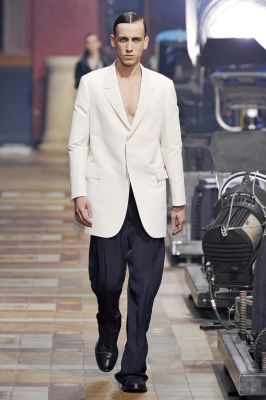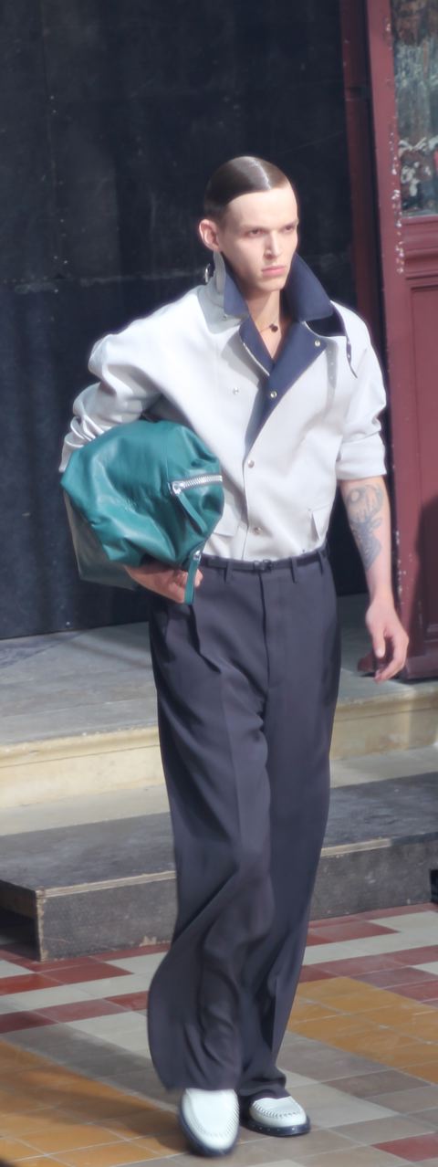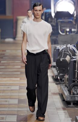 On retrouve évidemment La silhouette Lanvin avec son jeu de volumes opposés, mariant costume cintré et pantalon large, à la taille haute et l’entrejambe basse.