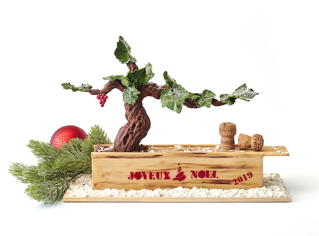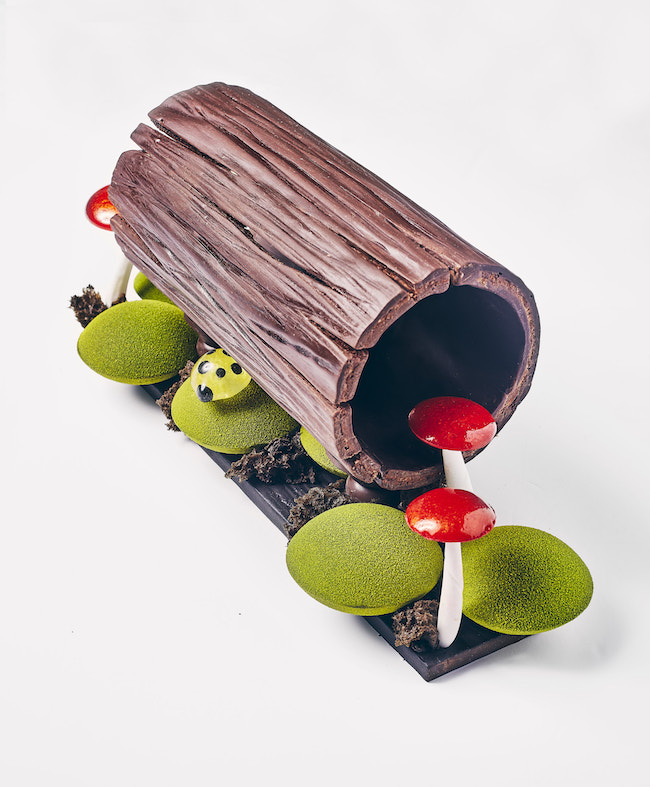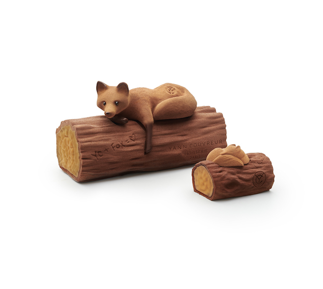 Pierre Hermé, désigné en 2016 meilleur pâtissier du monde par le classement des « World’s 50 Best Restaurants », a créé une collection de bûches pour ses boutiques qui peuvent prendre place dans une sculpture “trompe-l’œil” en chocolat noir réalisée à la main : « écorse trésors cachés ». La bûche choisie s’y glisse comme dans un écrin. Celui-ci est fait de chocolat noir pure origine Mexique et de chocolat au lait. Sur la photo il abrite la bûche « Estela » : Sablé au blé noir, biscuit moelleux, praliné aux pignons de cèdre, ganache et crème Chantilly aux bourgeons de pin, gelée fraîche végétale.