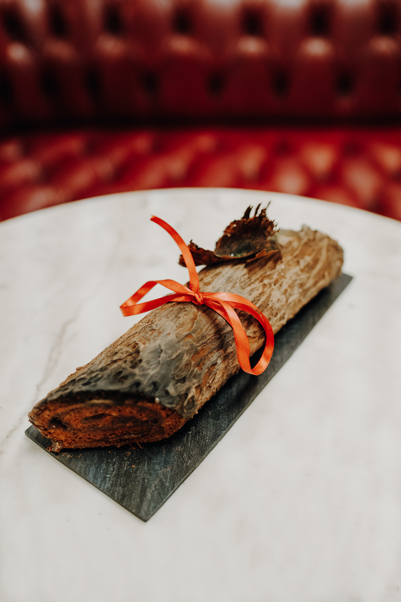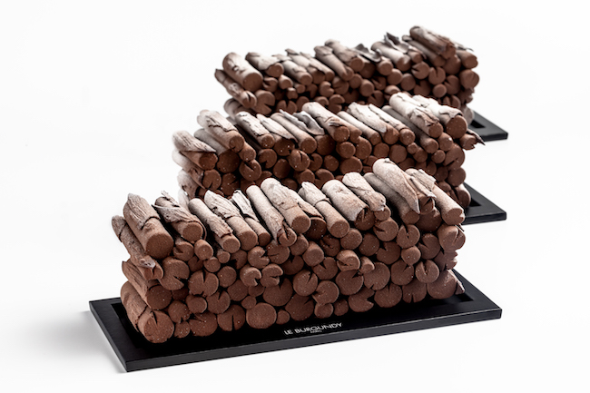 Pascal Hainigue pour le Burgundy Paris a créé « Le Stère Chocolaté » : un cœur onctueux à la vanille et au sapin ainsi qu’une mousse au chocolat Macaé. Base composée d’un biscuit tendre aux noisettes, d’un croustillant au sarrasin et éclats de crêpes dentelles. Le tout sous une écorce craquante au chocolat.