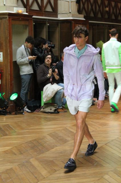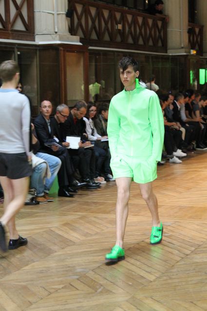 La collection met en avant une imagerie de héros masculin très sexués à travers des coupes, des matières, des couleurs et des silhouettes dont les proportions qui sont presque celles de personnages de mangas. Beaucoup de stretch comme dans les vêtements des athlètes qui font l’effet d’une seconde peau. Les tenues vieillottes des preppys sont revisitées en vert façon cartoon, une couleur issue des archives de Mugler. Beaucoup de délavages aussi. Aussi bien sur les costumes que sur les vêtements en denim.