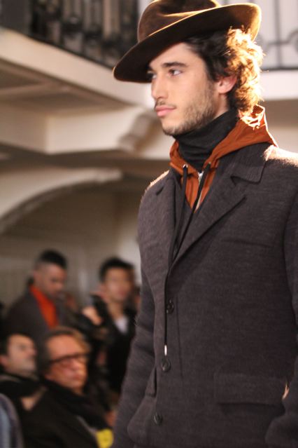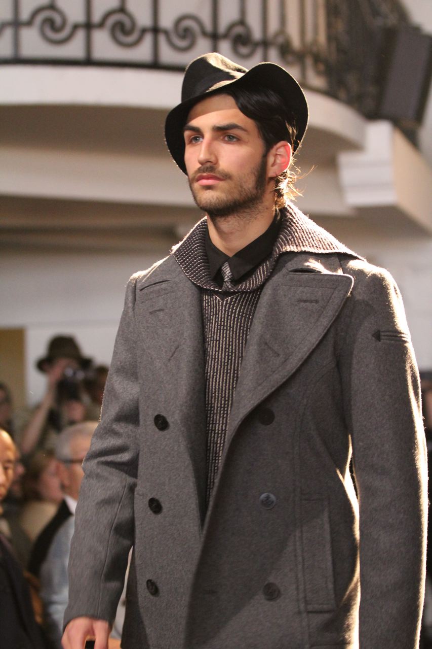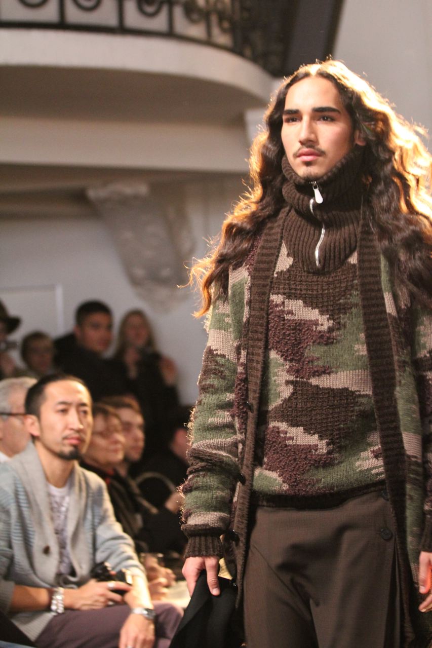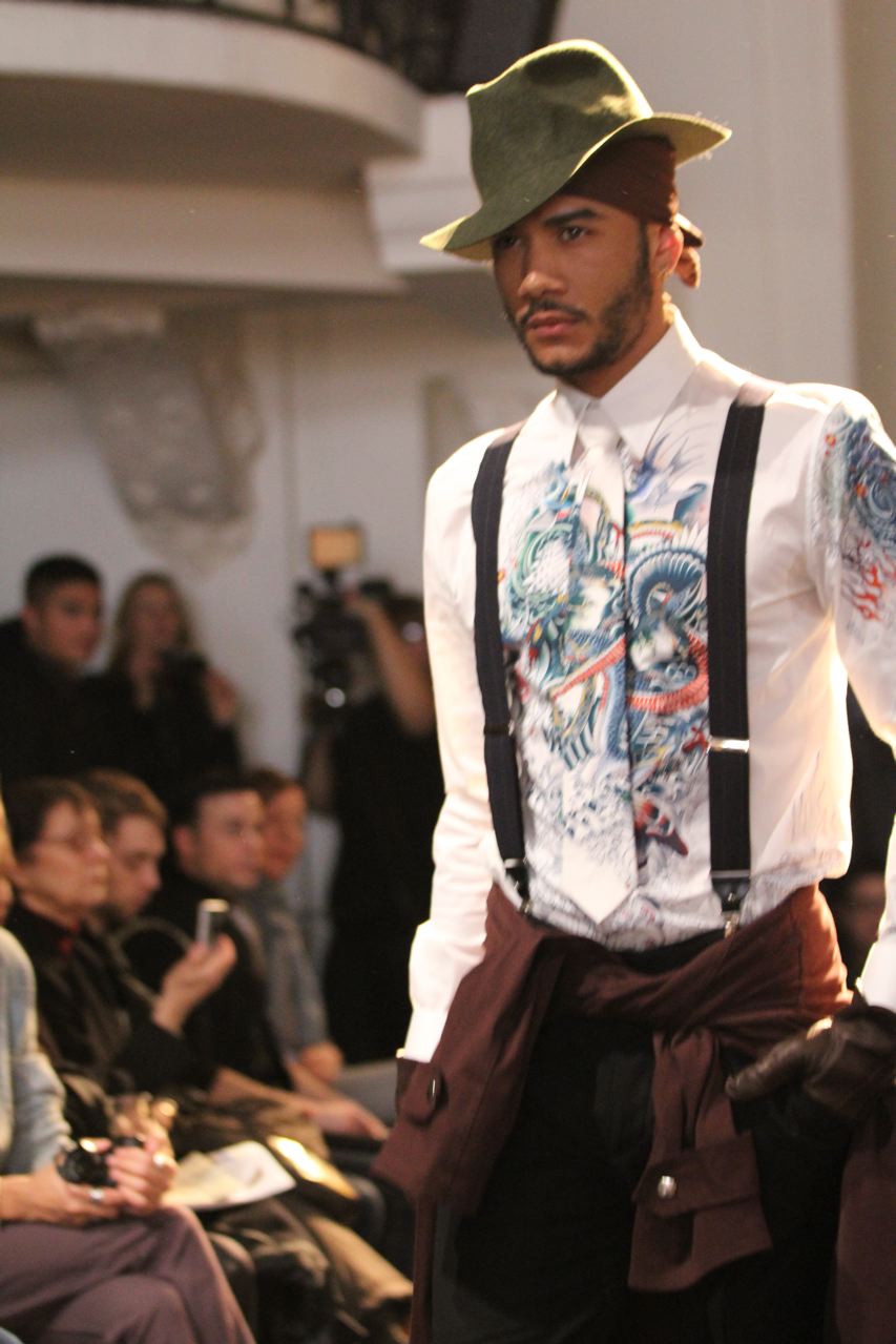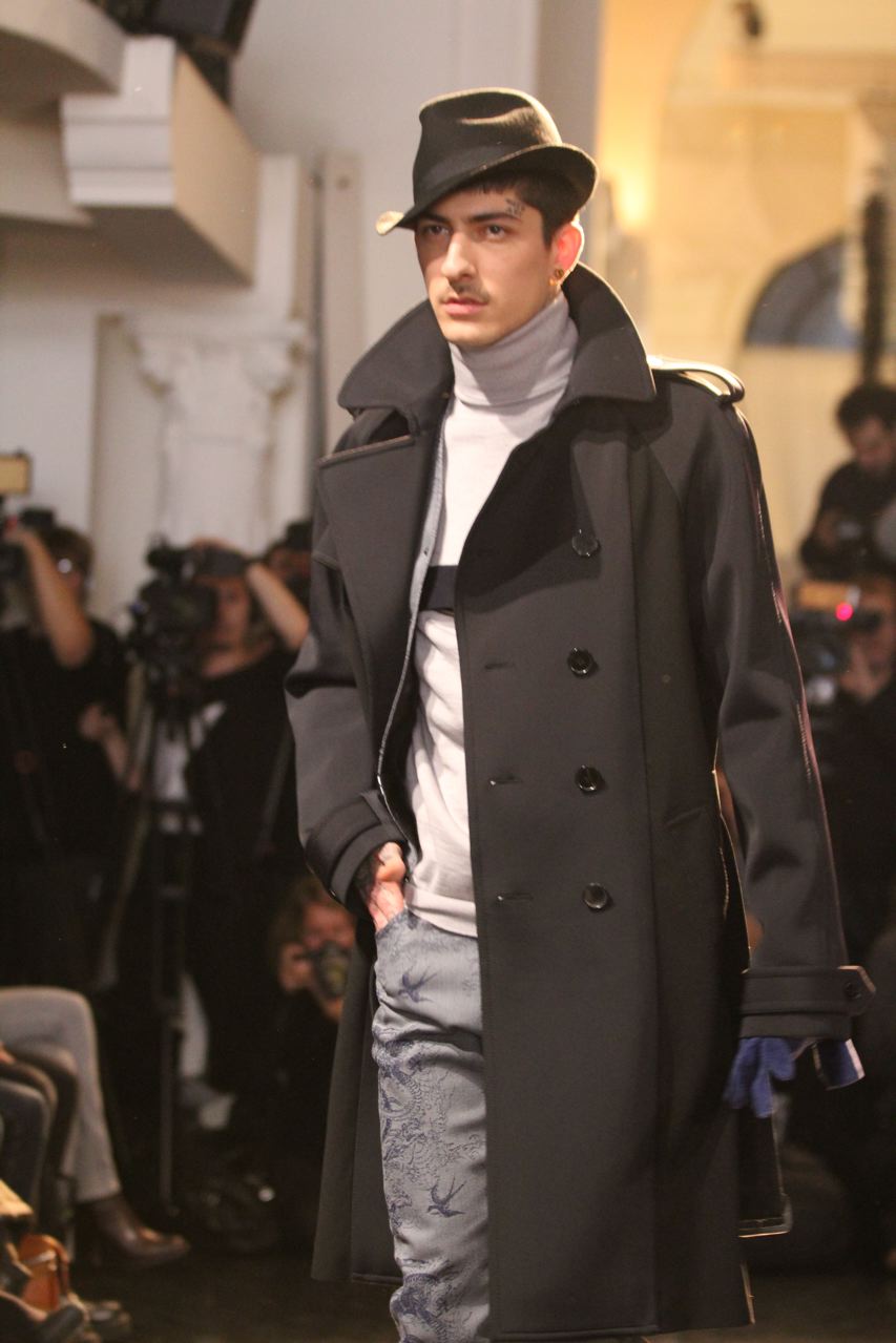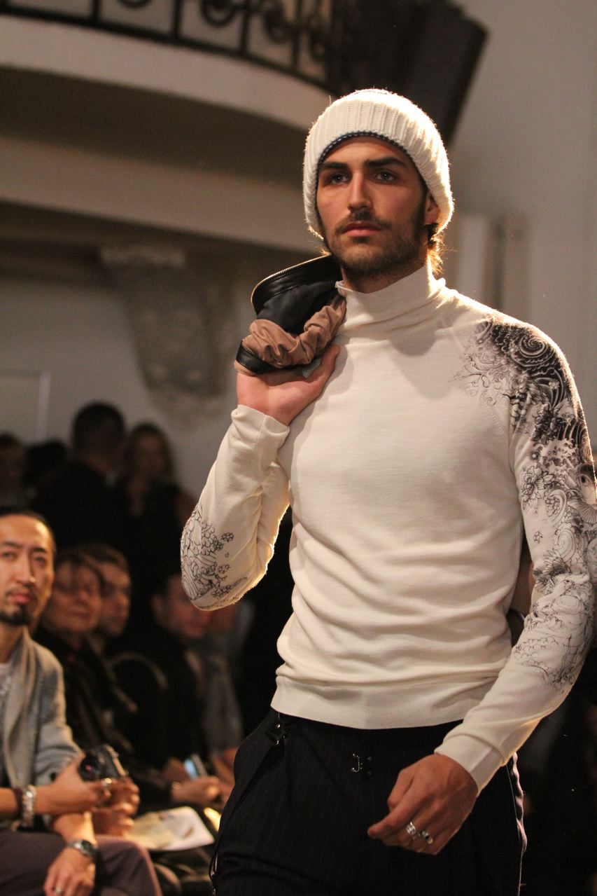 Tout en étant en plein dans les tendances actuelles, il présente un travail sur ses propres grands classiques et ses thèmes iconiques : les rayures tennis, les imprimés avec logo Jean Paul Gaultier des années 80, le tatouage, les piercings que l’on retrouve en clin d’oeil dans les boutonnages, le camouflage – en maille donc évidement pas militaire au premier degré, mais stylisé- , des jupes kilt. D’autres jupes pour homme plus longues. Des cabans rappelant Querelle. Des faux semblants avec par exemple des imprimés « mur de briques ». Beaucoup de mélanges de matières (l’une des grandes tendances depuis quelques saisons) : draps de laine et cuir par exemple. Du coton dévoré, des armures sergées. Coté stylisme, beaucoup de chapeaux qui évoquent Chicago ou Sherlock Holmes.