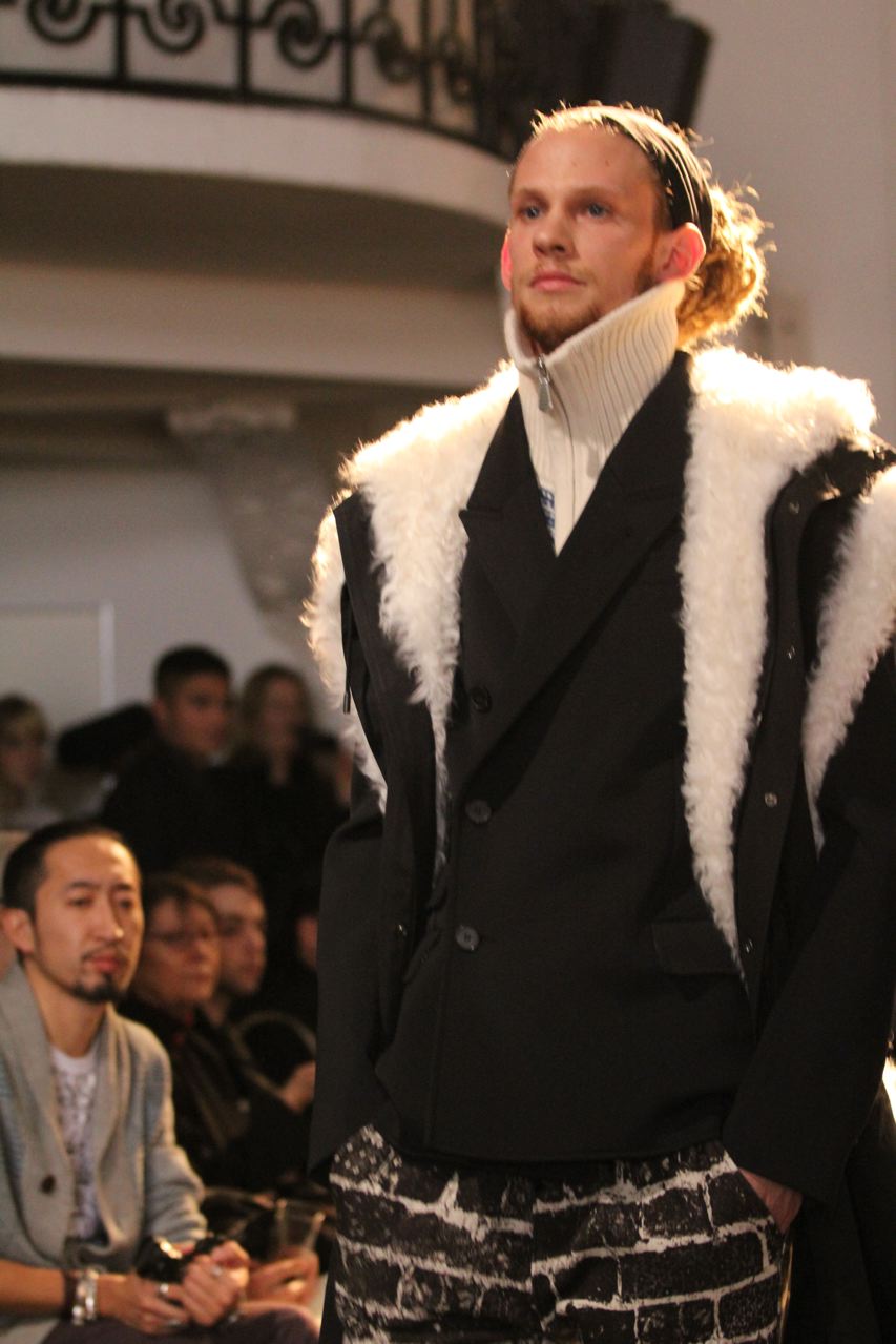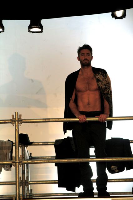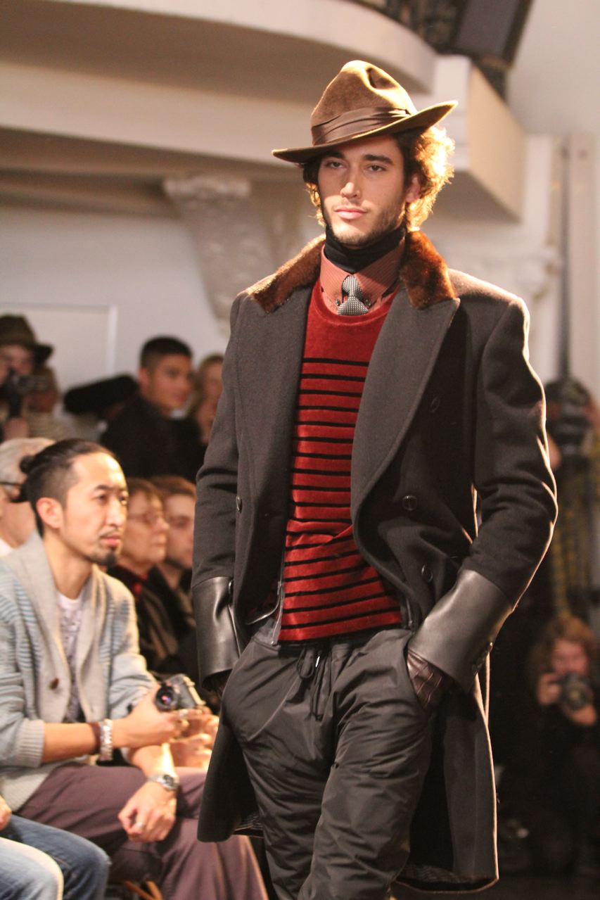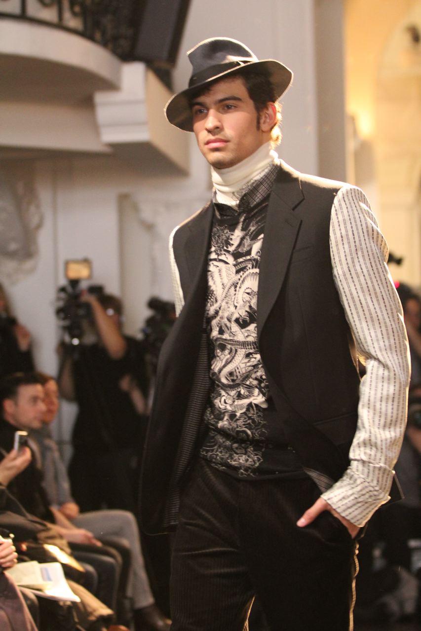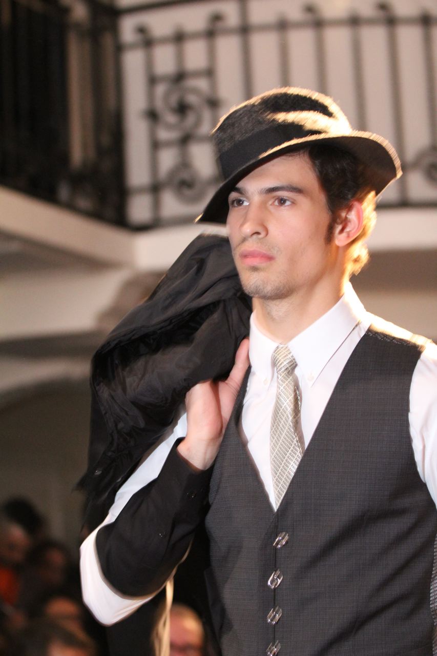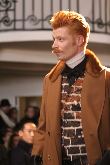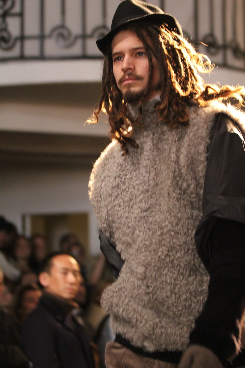 Tout en étant en plein dans les tendances actuelles, il présente un travail sur ses propres grands classiques et ses thèmes iconiques : les rayures tennis, les imprimés avec logo Jean Paul Gaultier des années 80, le tatouage, les piercings que l’on retrouve en clin d’oeil dans les boutonnages, le camouflage – en maille donc évidement pas militaire au premier degré, mais stylisé- , des jupes kilt. D’autres jupes pour homme plus longues. Des cabans rappelant Querelle. Des faux semblants avec par exemple des imprimés « mur de briques ». Beaucoup de mélanges de matières (l’une des grandes tendances depuis quelques saisons) : draps de laine et cuir par exemple. Du coton dévoré, des armures sergées. Coté stylisme, beaucoup de chapeaux qui évoquent Chicago ou Sherlock Holmes.