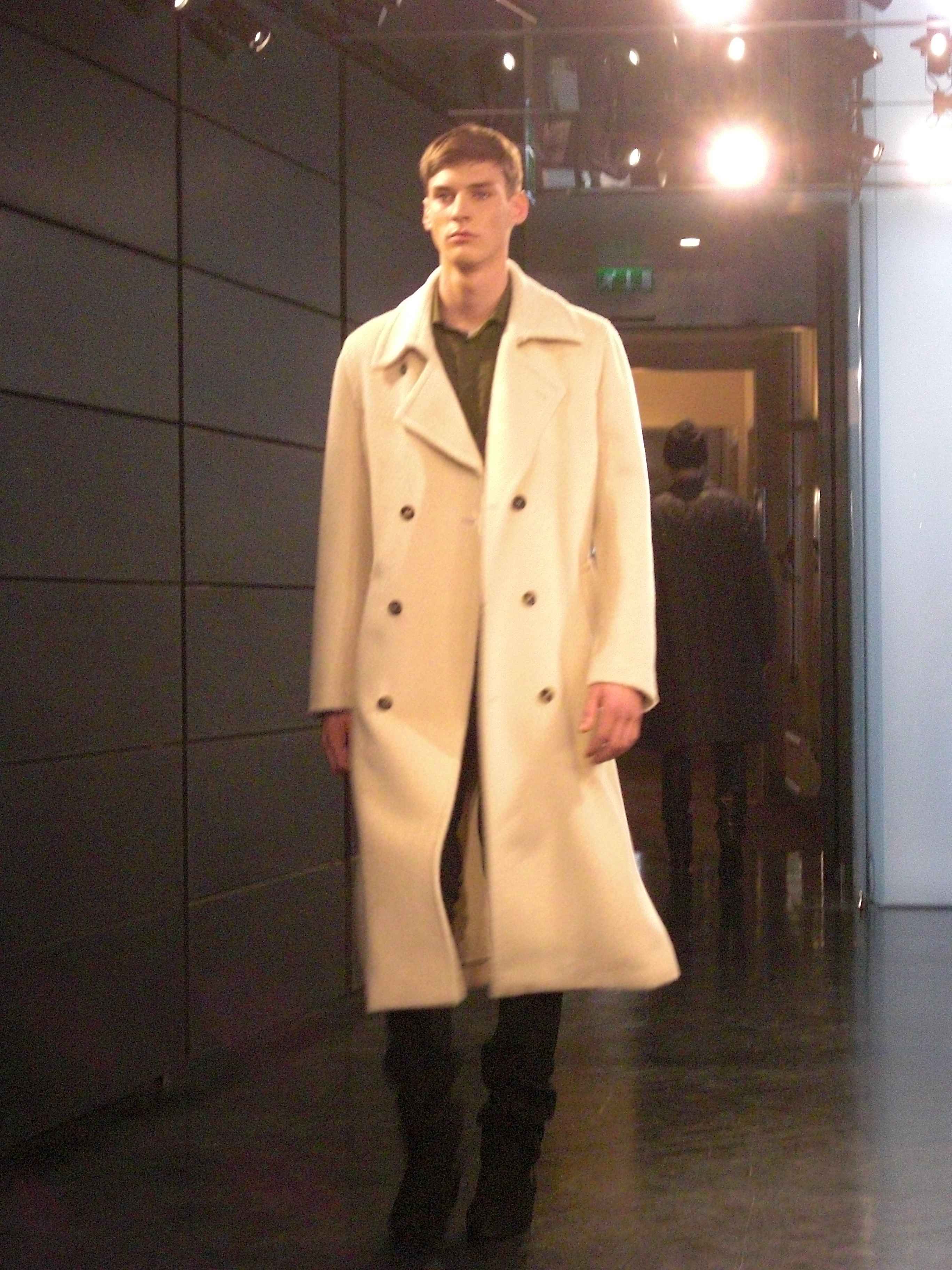 La collection Cerruti de l’hiver 2011 pour homme reste dans des tons marrons, taupe, gris, beige, seulement égaillés par un costume rose. Beaucoup de ton sur ton comme l’hiver dernier avec notamment un pull fin et un gilet de maille de la même laine. Des pantalons de cuirs et d’amusants casques audio en fourrure. Voici quelques unes de mes photos prises avec un petit compact qui, je l’avoue, ne sont pas très réussies.