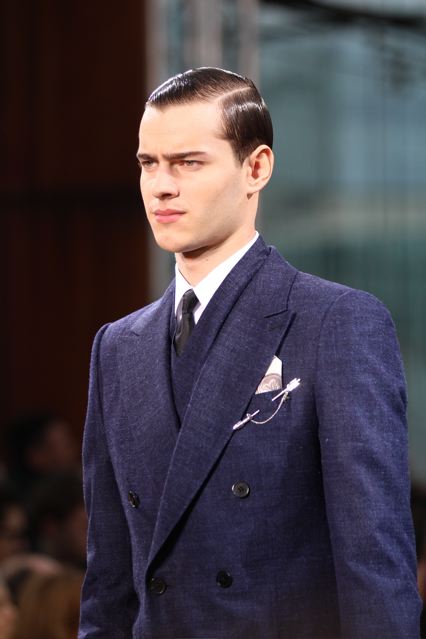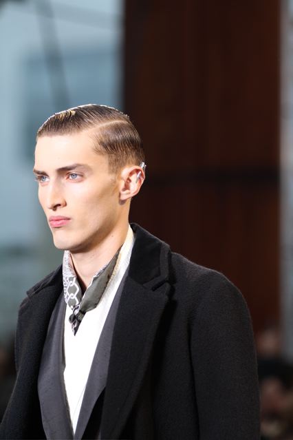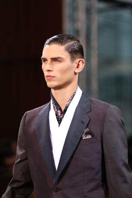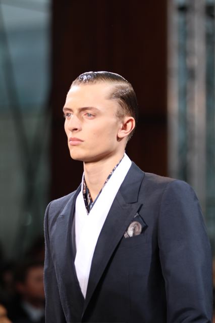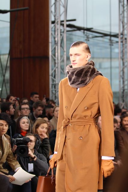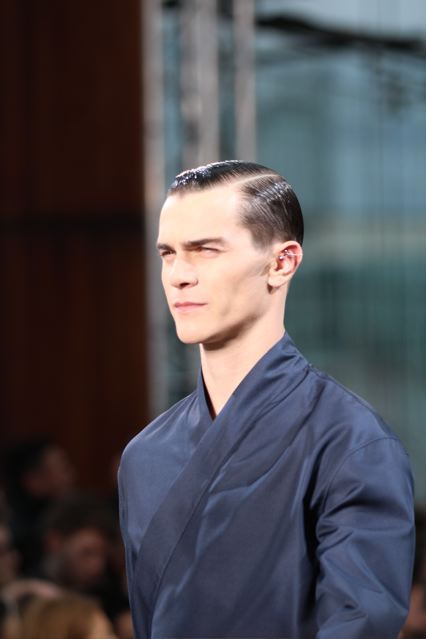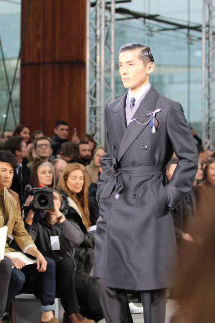 La première partie du défilé est une réinvention du Paris de la fin des années 70. Des vêtements pour homme classiques influencés par le Japon comme ce manteau double face camel avec un col en kangourou porté avec une chemise kimono en crépon de soie ou ce par-dessus en vigogne croisé avec une chemise Kimono.
