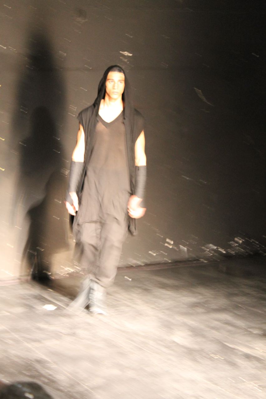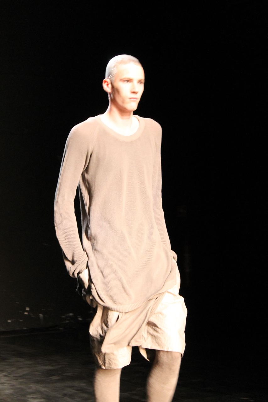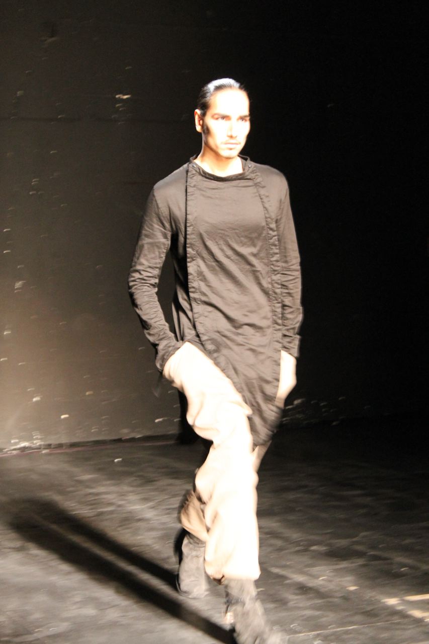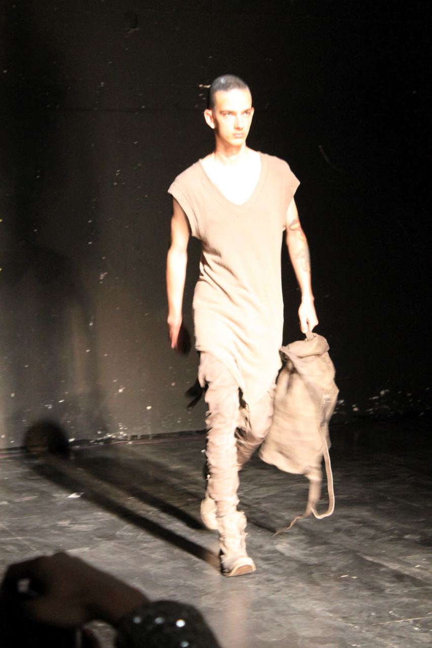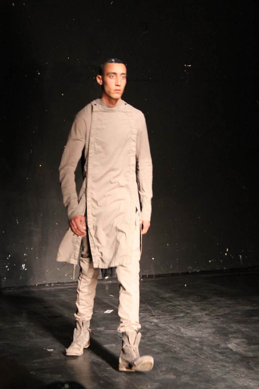 Boris Bidjan Saberi, créateur germano-iranien, présente une collection entièrement dans des tons neutres : déclinant les beiges, kakis, noirs et taupés. Les vêtements sont souples et superposés avec un excellent travail de drapier. Ils évoquent les tenues de films post apocalypse avec beaucoup de tuniques longues, robes et autres vêtements à capuche, tous conçus pour protéger de la chaleur et des rayons du soleil. Mais aussi des Tee shirts semi transparents qui semblent en partie déchirés. Mêlés à ces pièces, dont beaucoup sont inspirées de vêtements traditionnels du moyen orient, des vestes de costume collant parfaitement aux tendances de l’été 2012, ajustées et fermées d’un bouton. Les pantalons, eux-aussi se montrent très skinny ou tout au contraire over size et loose. Autres pièces remarquables : une combinaison, un débardeur lesté par un zip. Beaucoup de laine bouillie, de cotons épais et de cuir. En raison du manque de lumière, j’ai raté presque toutes les photos… L’un de mes défilés préférés de la saison.