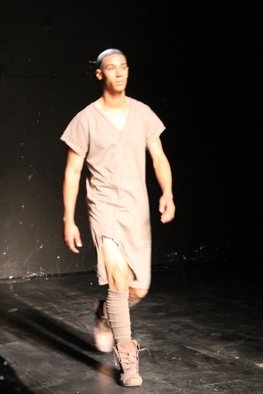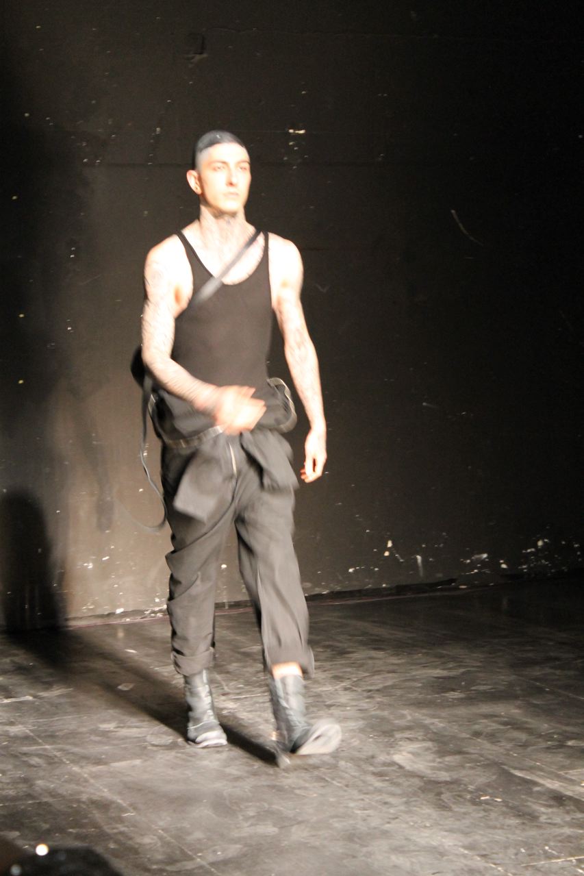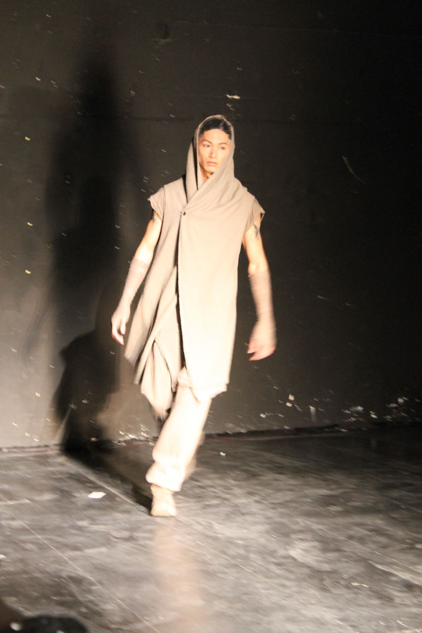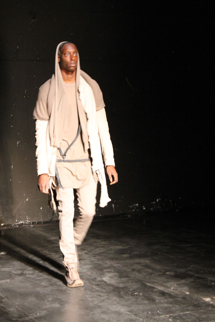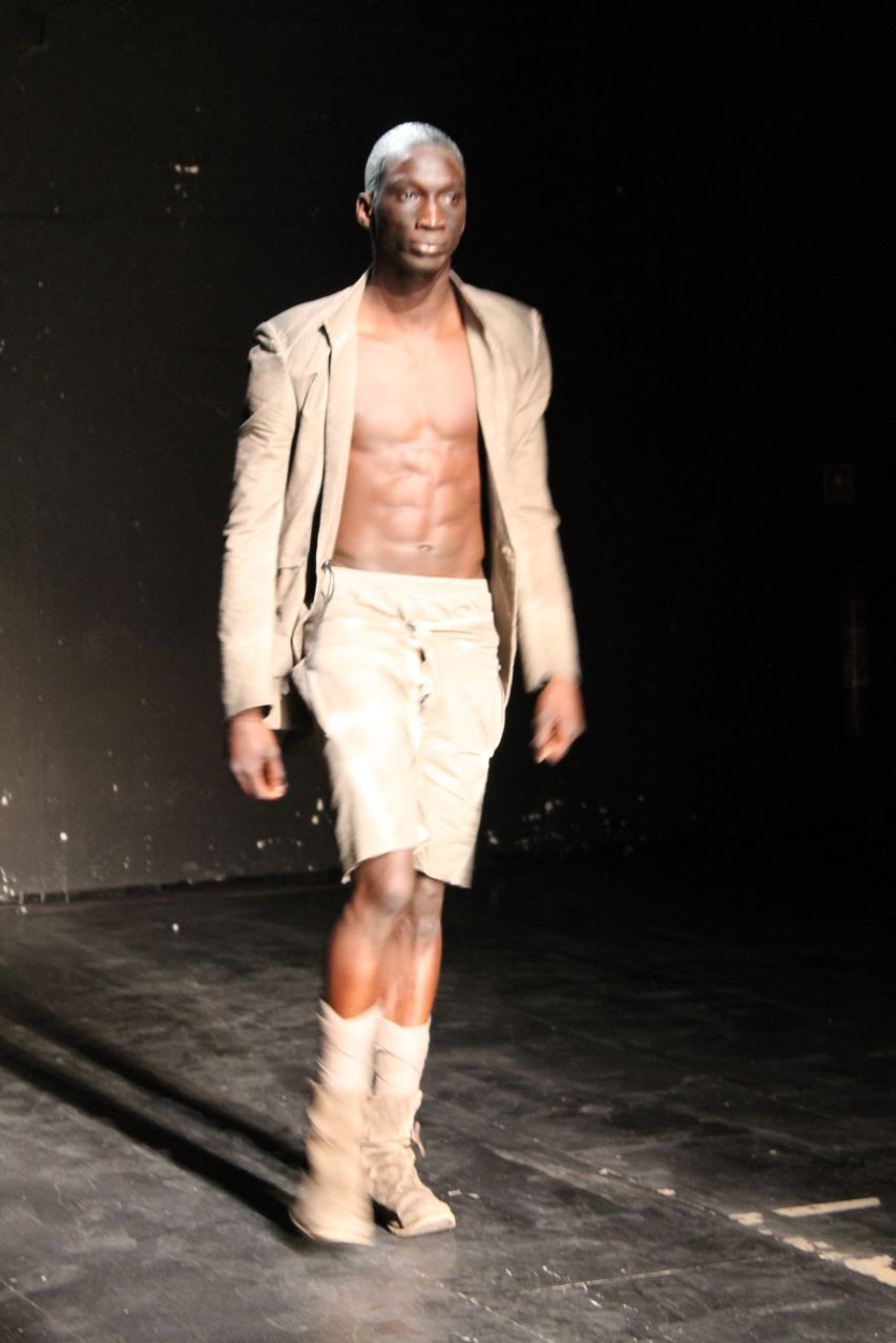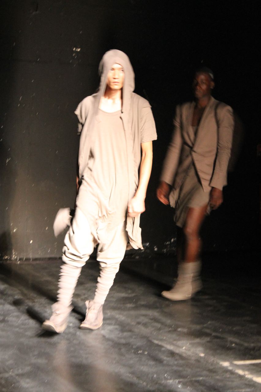 Boris Bidjan Saberi, créateur germano-iranien, présente une collection entièrement dans des tons neutres : déclinant les beiges, kakis, noirs et taupés. Les vêtements sont souples et superposés avec un excellent travail de drapier. Ils évoquent les tenues de films post apocalypse avec beaucoup de tuniques longues, robes et autres vêtements à capuche, tous conçus pour protéger de la chaleur et des rayons du soleil. Mais aussi des Tee shirts semi transparents qui semblent en partie déchirés. Mêlés à ces pièces, dont beaucoup sont inspirées de vêtements traditionnels du moyen orient, des vestes de costume collant parfaitement aux tendances de l’été 2012, ajustées et fermées d’un bouton. Les pantalons, eux-aussi se montrent très skinny ou tout au contraire over size et loose. Autres pièces remarquables : une combinaison, un débardeur lesté par un zip. Beaucoup de laine bouillie, de cotons épais et de cuir. En raison du manque de lumière, j’ai raté presque toutes les photos… L’un de mes défilés préférés de la saison.