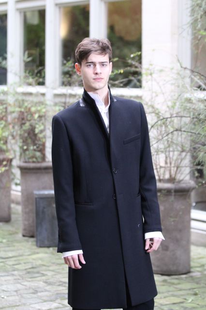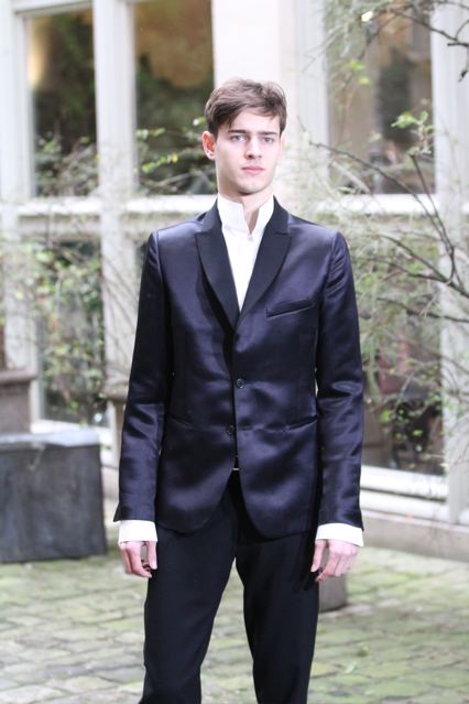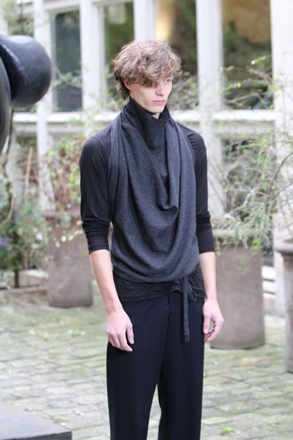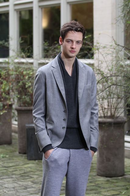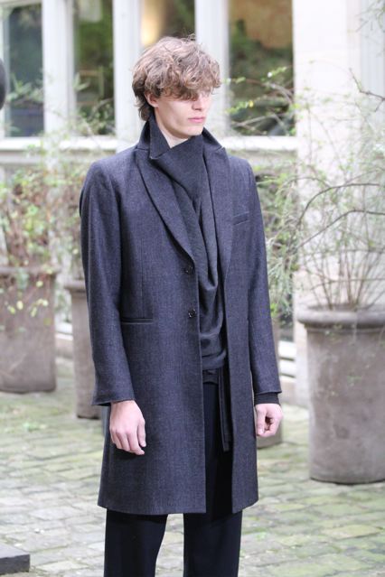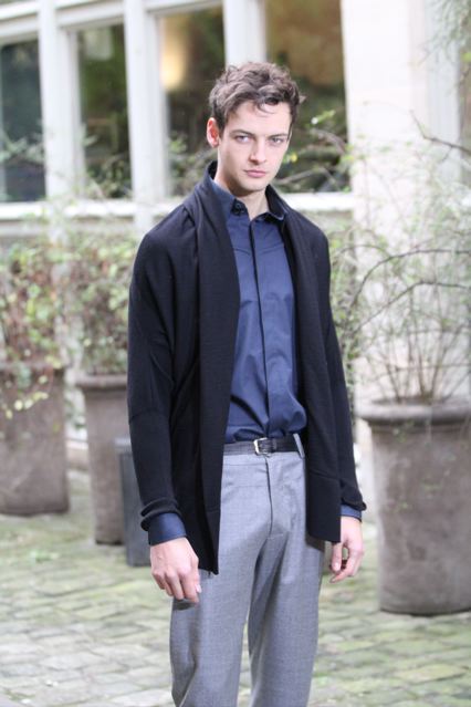 Un manteau et une veste (en satin et cuir) très élégants à col châle. Un pardessus très construit taillé dans un double crêpe. des ganses de cuir au pieds de col, revers des manches et passepolis. Un caban court en cuir et cachemire. Des chemises à col cravate et col haut. Un pantalon spiralé à jambe très ajustée, un autre à coupe droite sans couture sur les cotés, taillé dans un coton tissé oeil-de-perdrix. Un modèle plus ample à pli « poignard » sur le devant. Un jogging en maille jersey tricotée avec des bord cotes en bas.