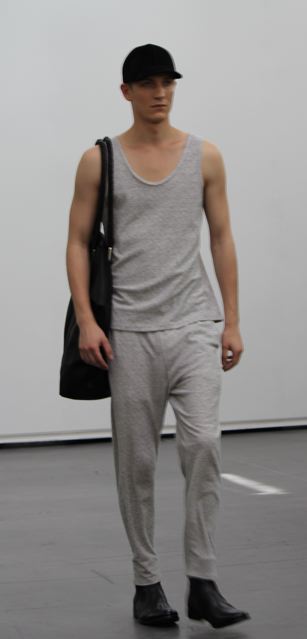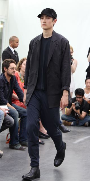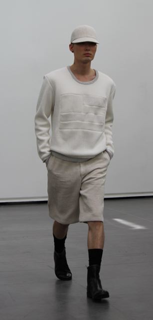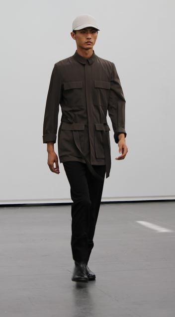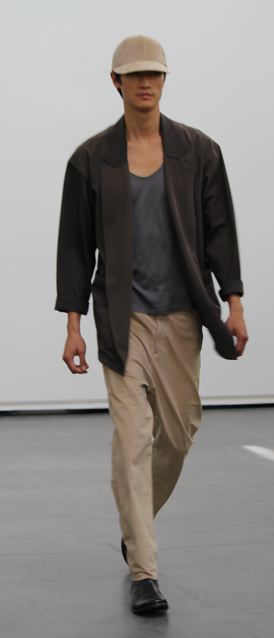 La collection est légère et douce aussi bien en ce qui concerne les couleurs que les matières. De la laine italienne légère, du twill de coton pour les costumes et manteaux. Du micro jersey japonais pour les hauts et les pantalons. Certaines pièces sont traitées de telle façon qu’elle deviendront unique par un processus de vieillissement accéléré.