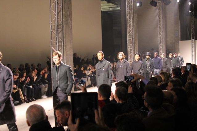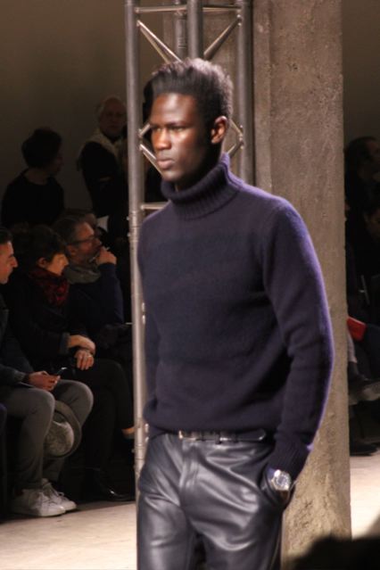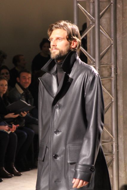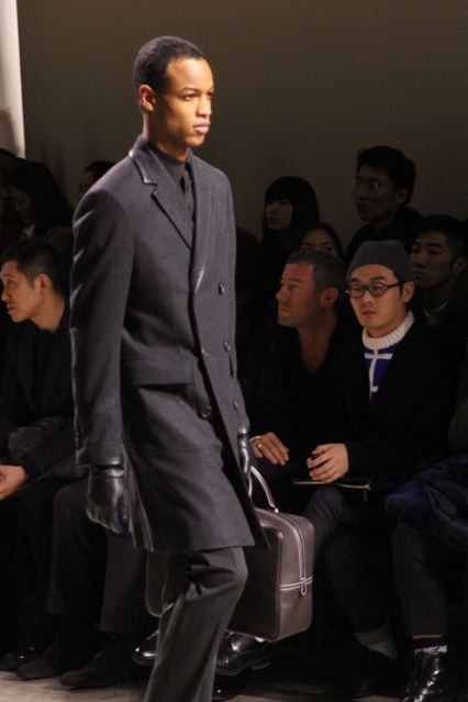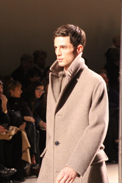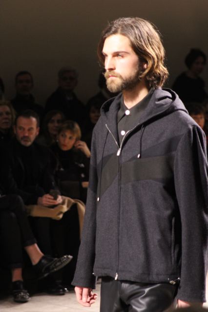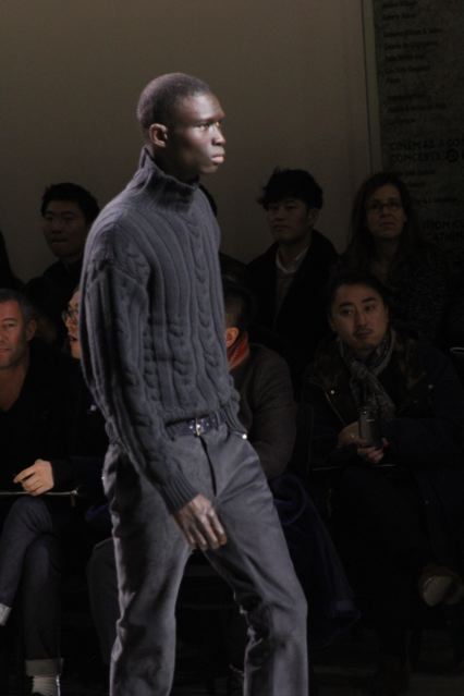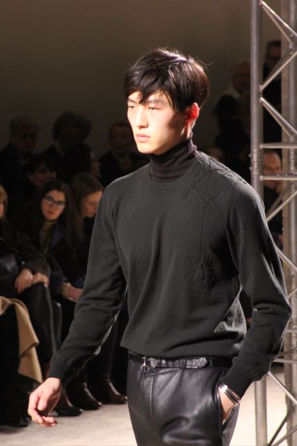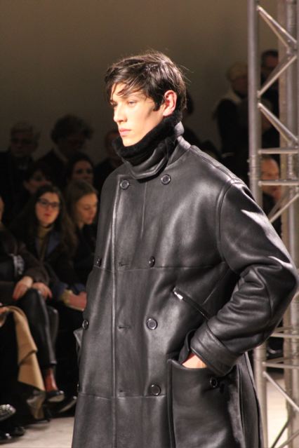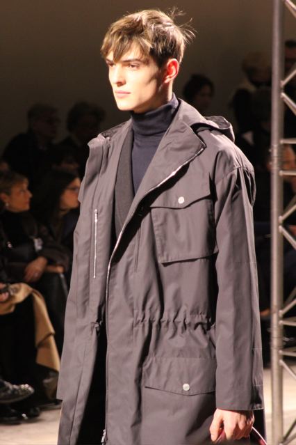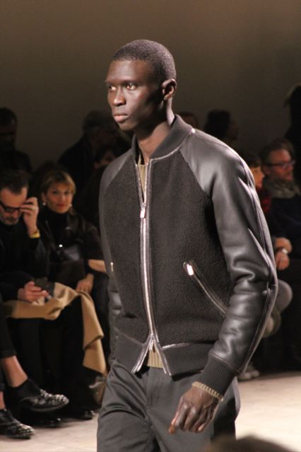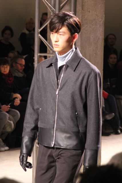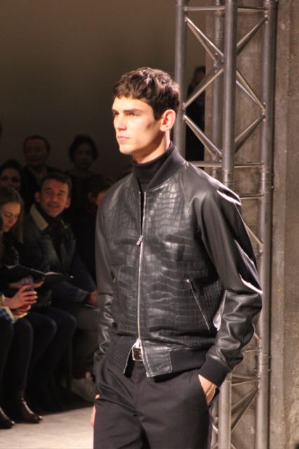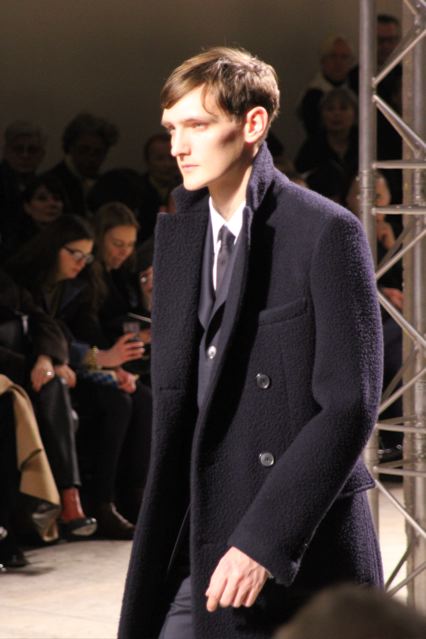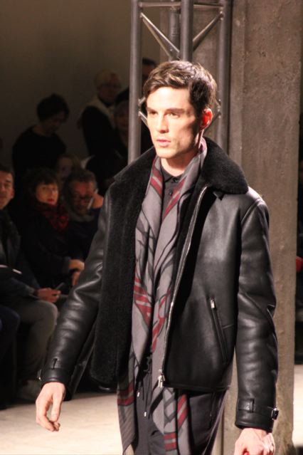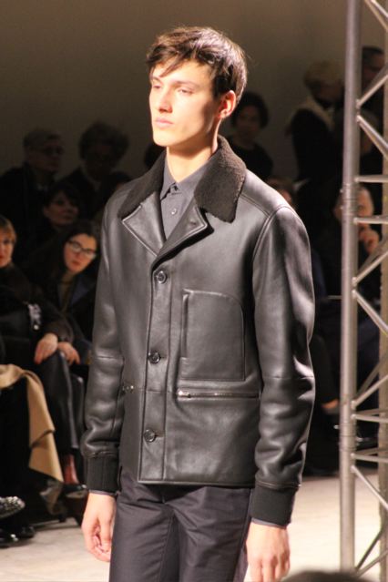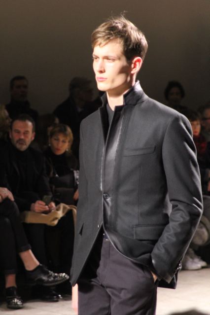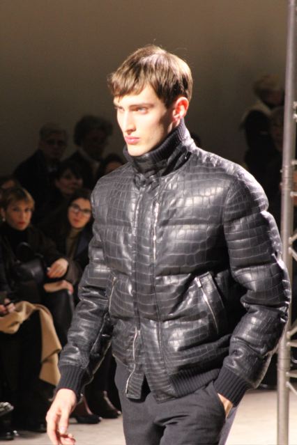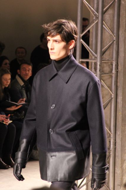 Dans sa collection homme hiver 2014, Hermès propose des couleurs anthracite, vert-de-gris, brun, noir, marine, kaki, vert anglais, bois et bleu glacier. Les tons sombres se superposent sur des volumes généreux, avec des associations de textures mates et brillantes. Des manteaux ont des fermetures croisées à six boutons, certains dans une version sport avec un col tricot amovible. Des manteaux droits ont une martingale détachable. D’autres silhouettes aux épaules tombantes. Pour affronter l’hiver dans des occasions moins formelles : des blousons et coupe-vents multipoches boxy, cabans courts croisés, cabans droits, parkas multipoches, blousons aviateurs, cabans esprit casaque, blousons teddy réversibles avec épaules raglan et des doudounes matelassées, dont un modèle ultra luxueux en crocodile chiffon vert-de-gris. Les costumes sont proposés à 3 boutons ou bien à fermeture croisée. Tandis que hors costume, les vestes portent 2 boutons. Les pulls ont des cols montants, des cols roulés ou des cols ras du cou avec des torsades. Les chemises sont proposées à col droit, petit col souple, col montant. Comme les manteaux, certaines ont un esprit cosaque. Les pantalons sont étroits droits, à un pli ou dans un esprit jogging. Comme toujours chez Hermès, les matières se montrent très luxueuses avec du cachemire compact ou Prince de galles, des flanelles de laine et cachemire, du cachemire tricoté main, de la soie. Parmi les pièces les plus remarquables, un blouson teddy réversible en vison rasé et agneau, un caban en drap de cachemire technique porté avec un col roulé en soie, un blouson esprit casque en drap de cachemire, un blouson en crocodile chiffon et agneau porté avec un col roulé en soie.