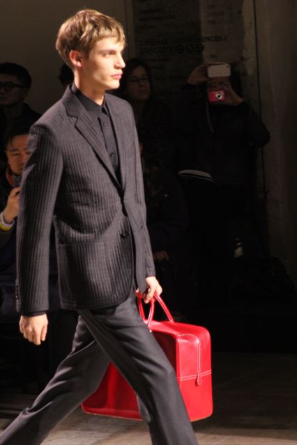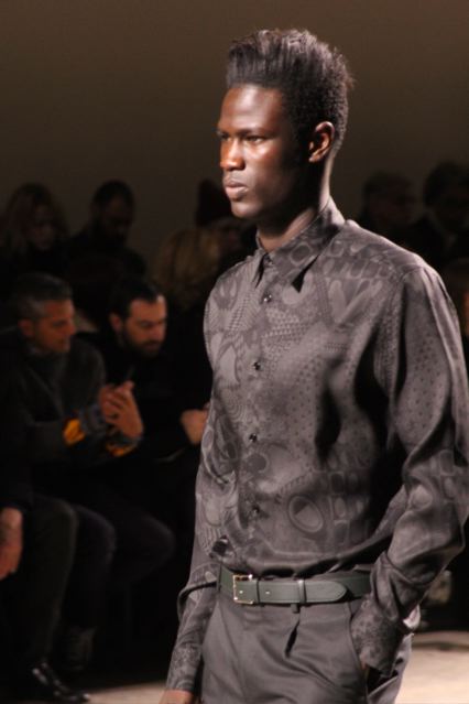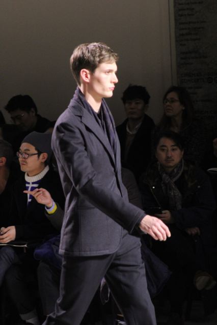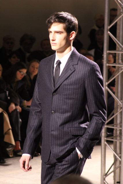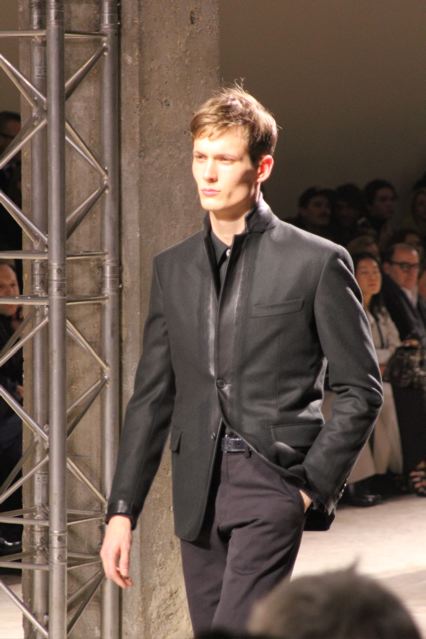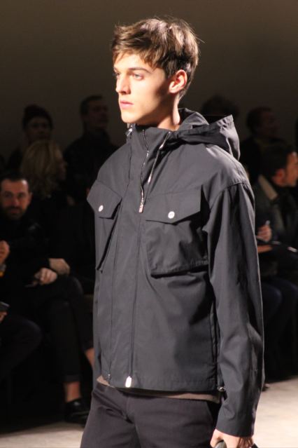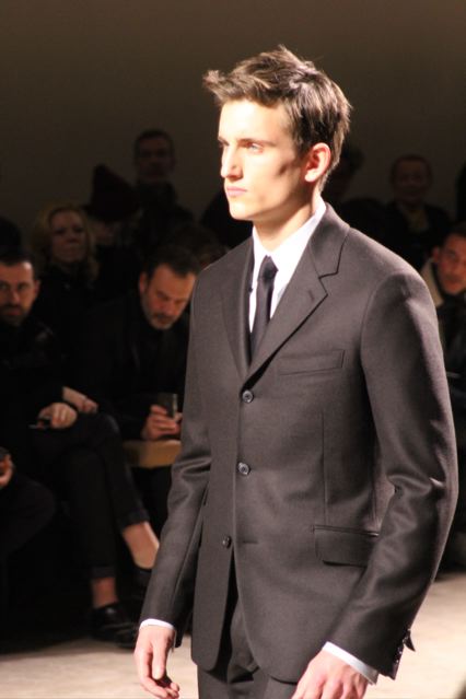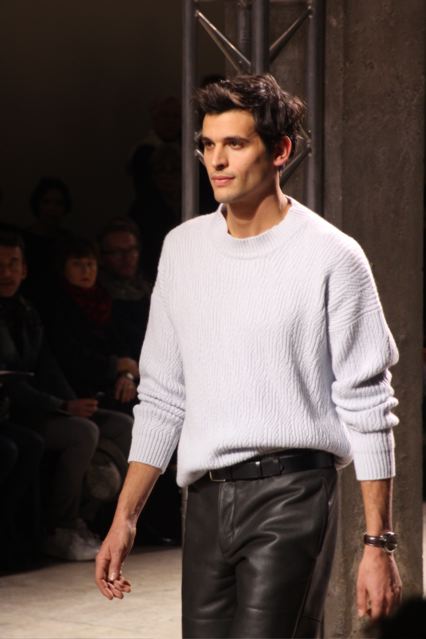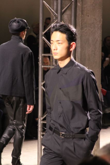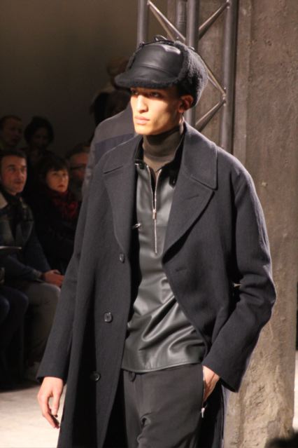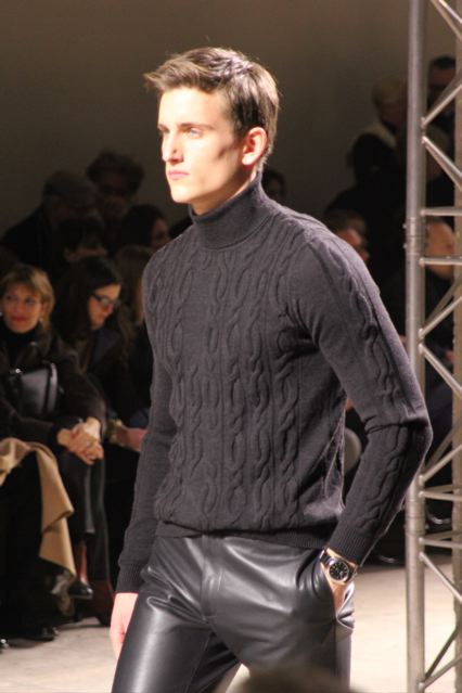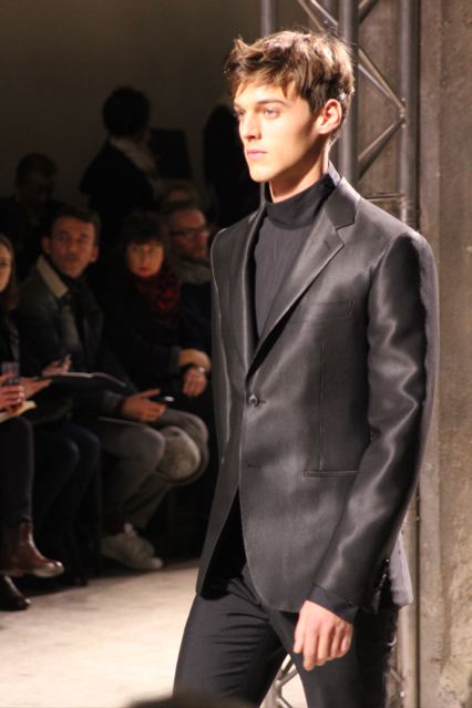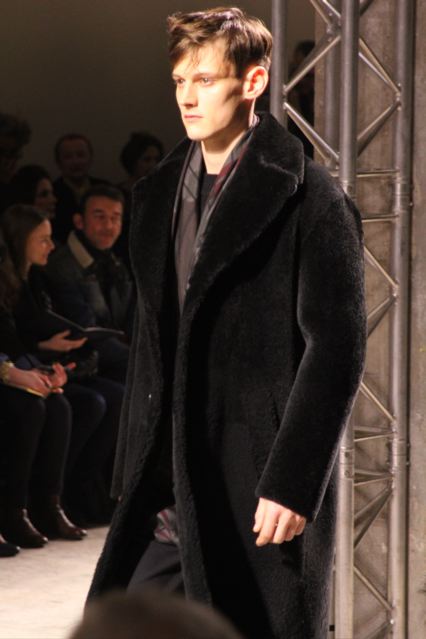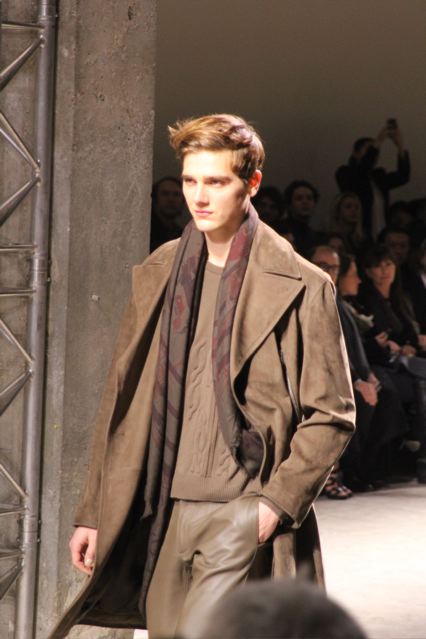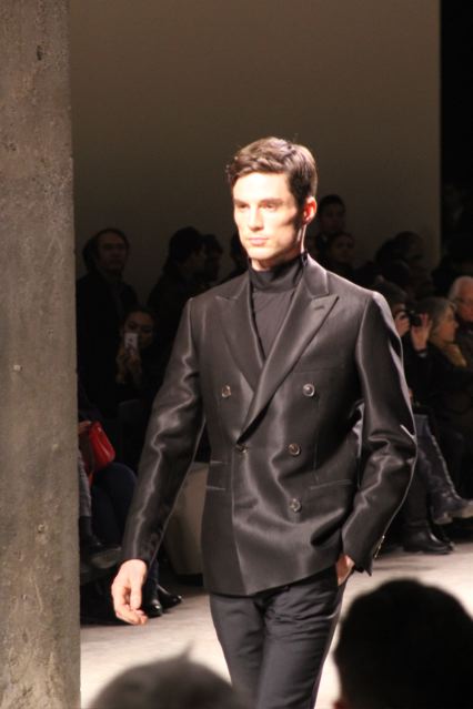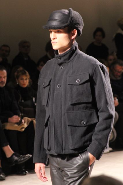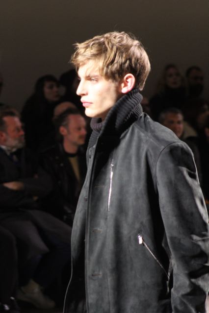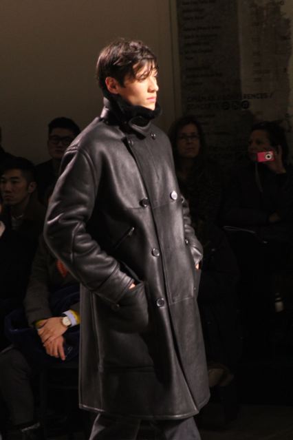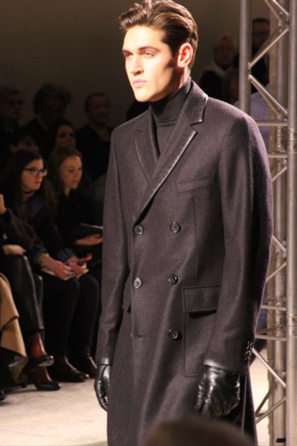 Dans sa collection homme hiver 2014, Hermès propose des couleurs anthracite, vert-de-gris, brun, noir, marine, kaki, vert anglais, bois et bleu glacier. Les tons sombres se superposent sur des volumes généreux, avec des associations de textures mates et brillantes. Des manteaux ont des fermetures croisées à six boutons, certains dans une version sport avec un col tricot amovible. Des manteaux droits ont une martingale détachable. D’autres silhouettes aux épaules tombantes. Pour affronter l’hiver dans des occasions moins formelles : des blousons et coupe-vents multipoches boxy, cabans courts croisés, cabans droits, parkas multipoches, blousons aviateurs, cabans esprit casaque, blousons teddy réversibles avec épaules raglan et des doudounes matelassées, dont un modèle ultra luxueux en crocodile chiffon vert-de-gris. Les costumes sont proposés à 3 boutons ou bien à fermeture croisée. Tandis que hors costume, les vestes portent 2 boutons. Les pulls ont des cols montants, des cols roulés ou des cols ras du cou avec des torsades. Les chemises sont proposées à col droit, petit col souple, col montant. Comme les manteaux, certaines ont un esprit cosaque. Les pantalons sont étroits droits, à un pli ou dans un esprit jogging. Comme toujours chez Hermès, les matières se montrent très luxueuses avec du cachemire compact ou Prince de galles, des flanelles de laine et cachemire, du cachemire tricoté main, de la soie. Parmi les pièces les plus remarquables, un blouson teddy réversible en vison rasé et agneau, un caban en drap de cachemire technique porté avec un col roulé en soie, un blouson esprit casque en drap de cachemire, un blouson en crocodile chiffon et agneau porté avec un col roulé en soie.