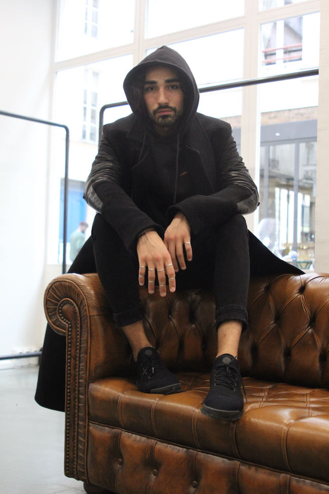 Je m’habille en sombre. J’ai toujours voulu être comme un personnage dessin animé qui est constamment habillé pareil, avoir une silhouette reconnaissable. Je suis fasciné par les matières noires. J’adore.