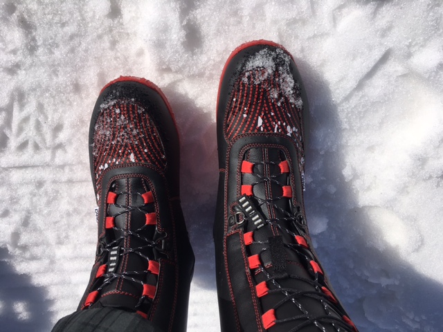 J’ai attaché la structure rigide des chaussures à mon sac à dos pour les transporter et marcher à l’aise avec les après-ski
