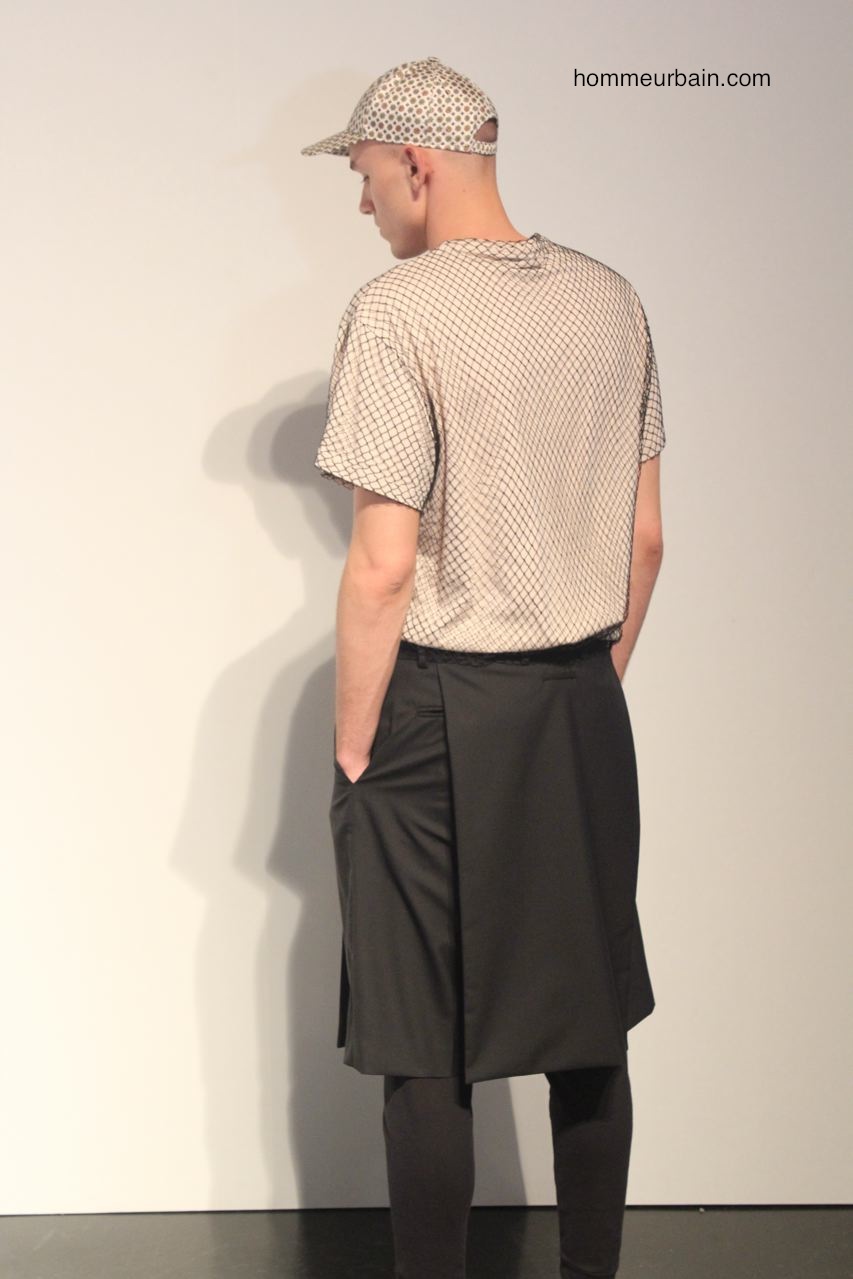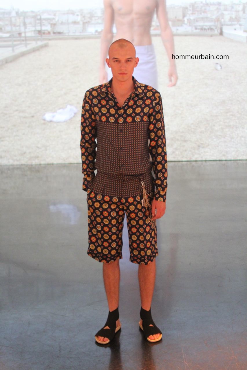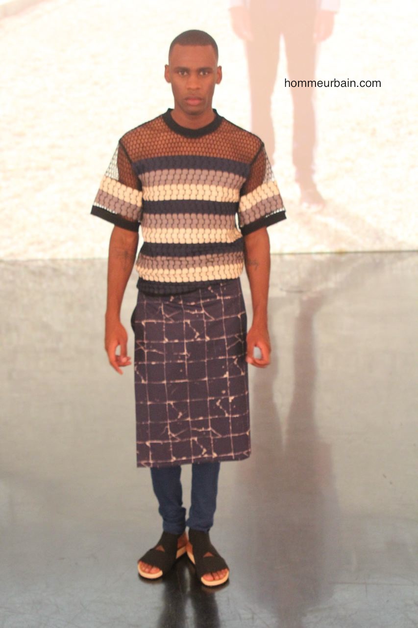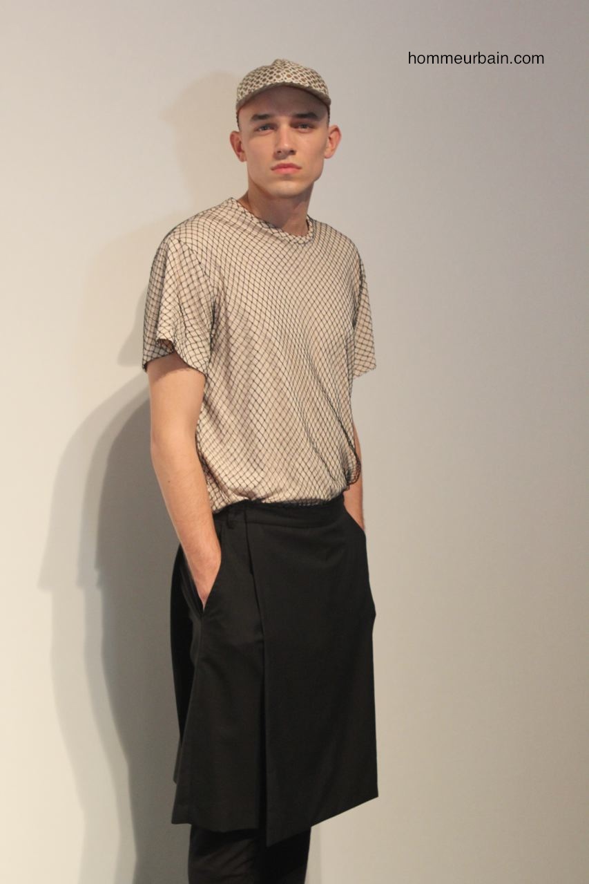 Beaucoup de classiques emblématiques de Jean Paul Gaultier sont modernisées et adaptés au goût du jour : l’envers et l’endroit ; les superpositions avec par exemple des vêtements qui semblent faits à partir de 2 vêtements différents l’un en tissus opaque, l’autre transparent ; les faux semblants ; les imprimés carrelage. On retrouve aussi des fleurs et des motifs de cravate imprimés sur des bermudas et chemises. Autre pièce des archives modernisée : la jupe short qui est proposée en 2 versions. L’une d’elle avec un double pan, c’est comme un bermuda avec un tablier devant et un derrière. Beaucoup de résille sur des vestes et T-shirts.