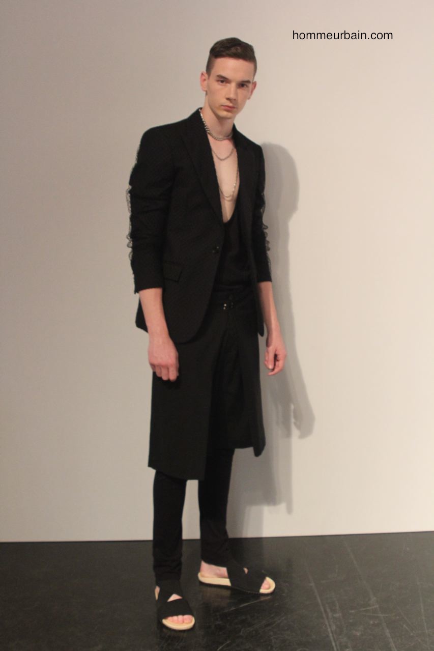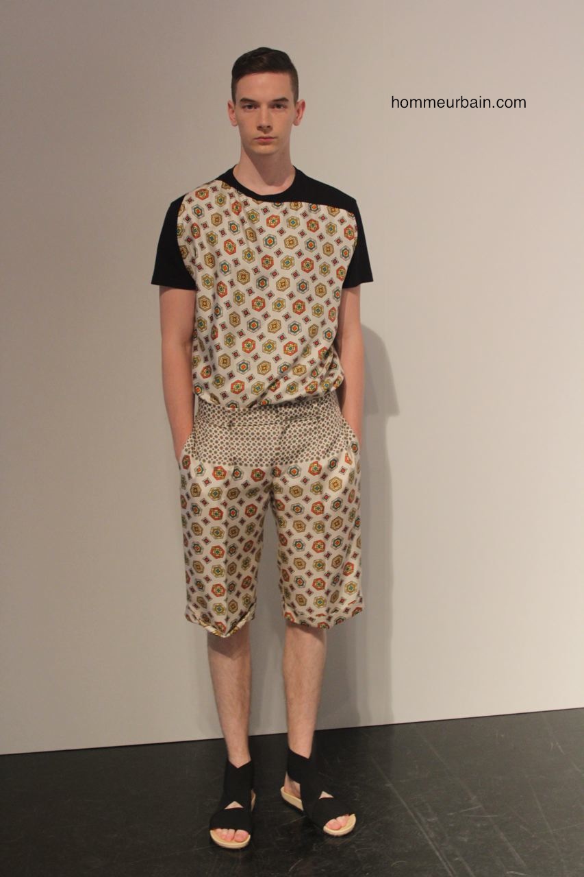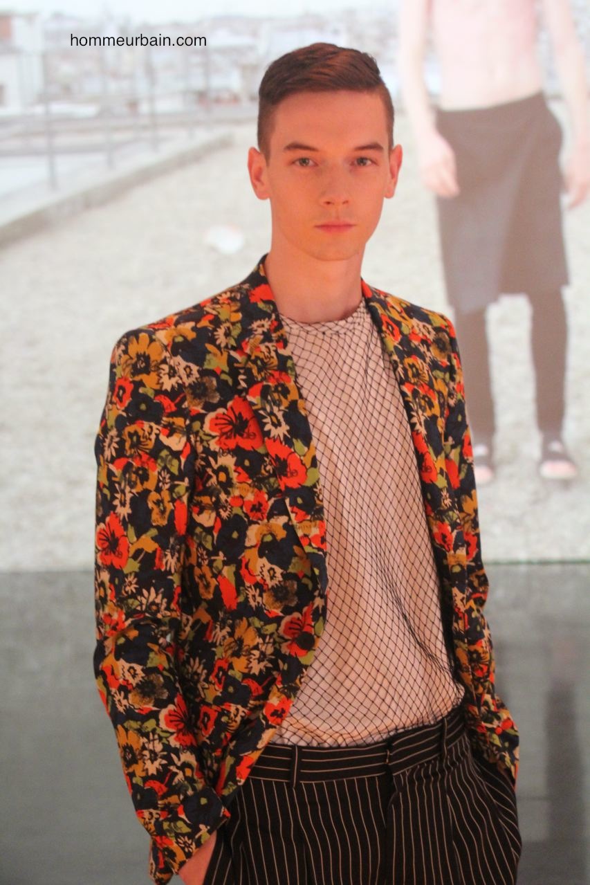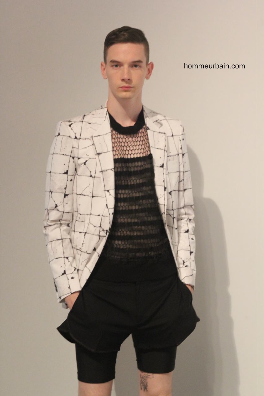 Beaucoup de classiques emblématiques de Jean Paul Gaultier sont modernisées et adaptés au goût du jour : l’envers et l’endroit ; les superpositions avec par exemple des vêtements qui semblent faits à partir de 2 vêtements différents l’un en tissus opaque, l’autre transparent ; les faux semblants ; les imprimés carrelage. On retrouve aussi des fleurs et des motifs de cravate imprimés sur des bermudas et chemises. Autre pièce des archives modernisée : la jupe short qui est proposée en 2 versions. L’une d’elle avec un double pan, c’est comme un bermuda avec un tablier devant et un derrière. Beaucoup de résille sur des vestes et T-shirts.
