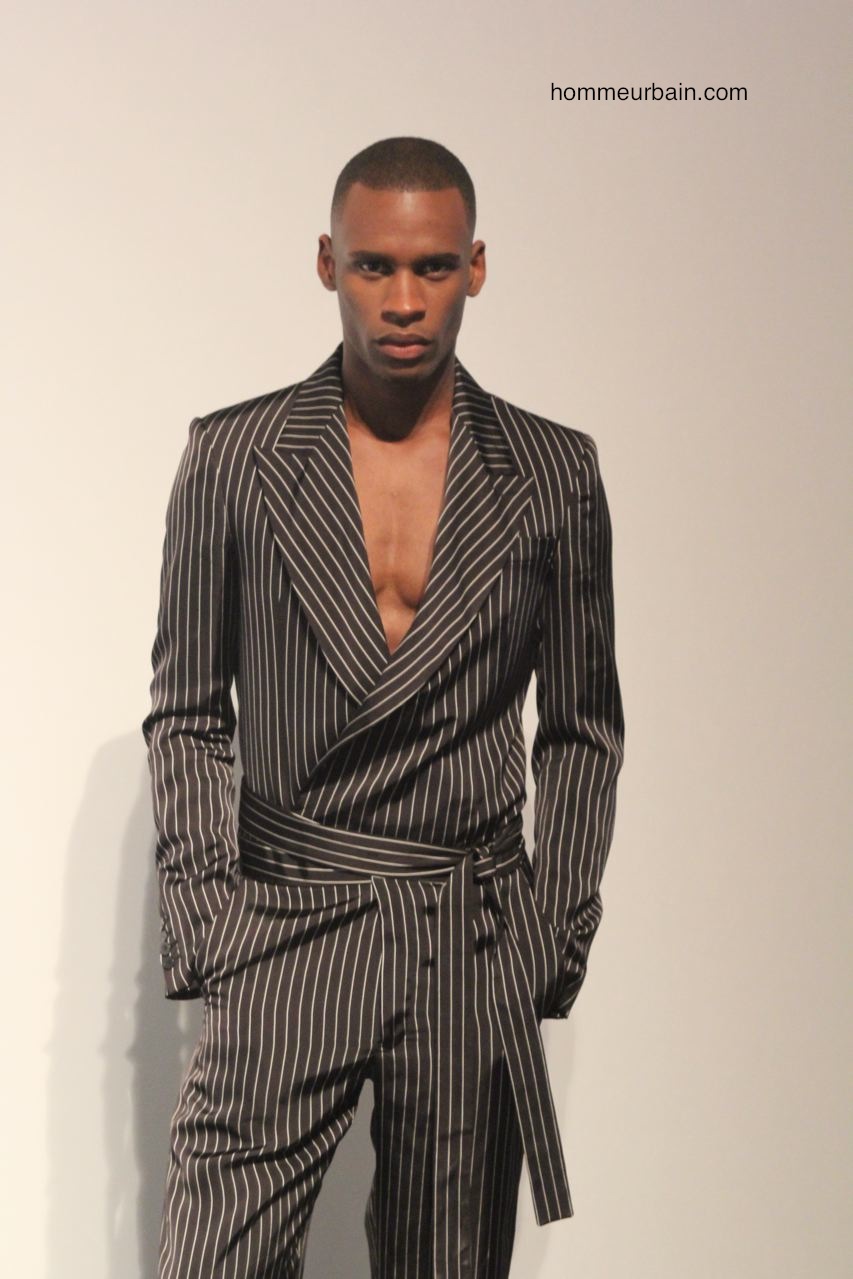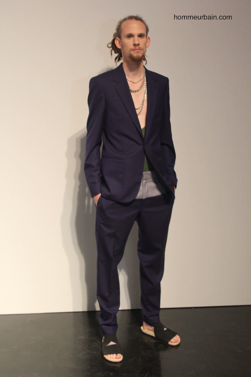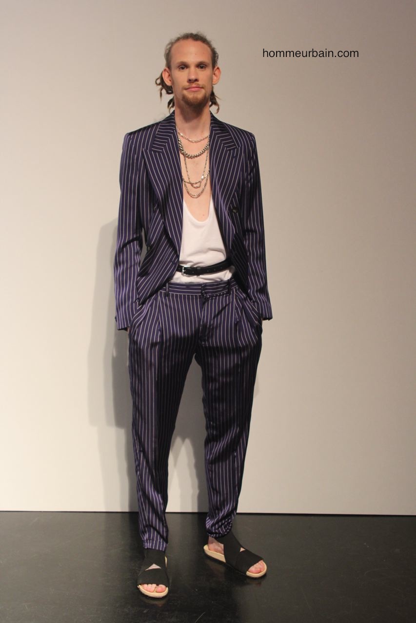 Un costume d’homme d’affaire est porté avec un marcel décolleté et des sandales. Des pantalons et vestes semblent portés à l’envers : les coutures et poches sont à l’extérieur. Un costume est traité façon pyjama, un autre comme un peignoir où la laine sèche est remplacée par de la viscose fluide. Un gilet ressemble à un gilet de sauvetage. Un mini short de sport « années 80 » est en « tissu de banquier » (laine sèche de costume).