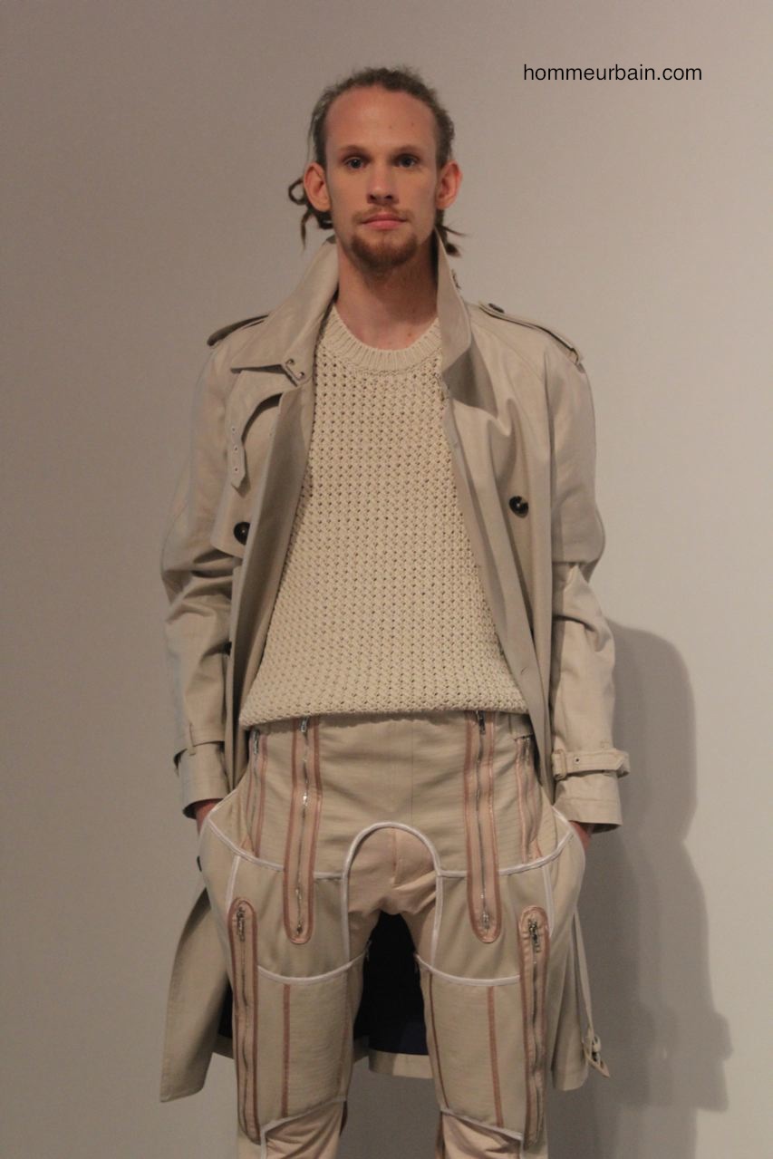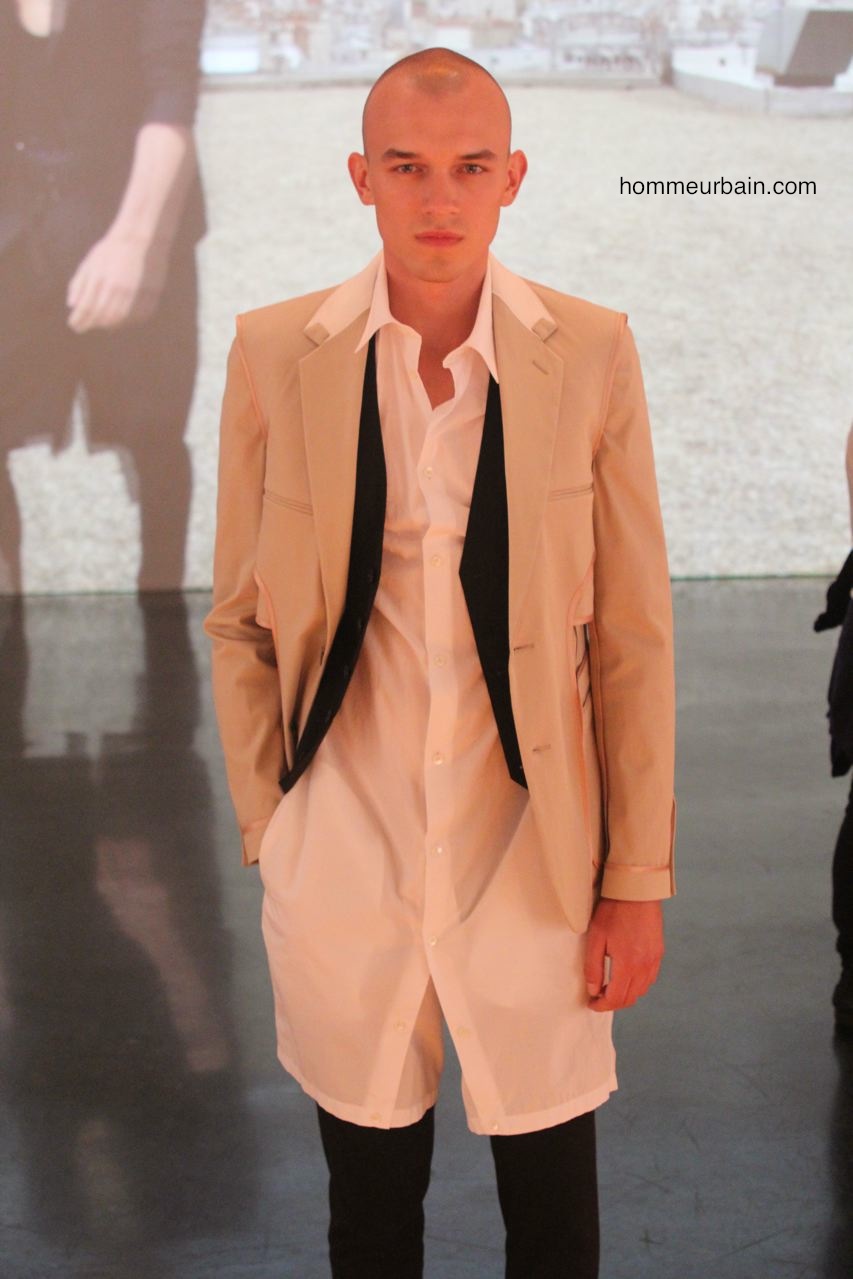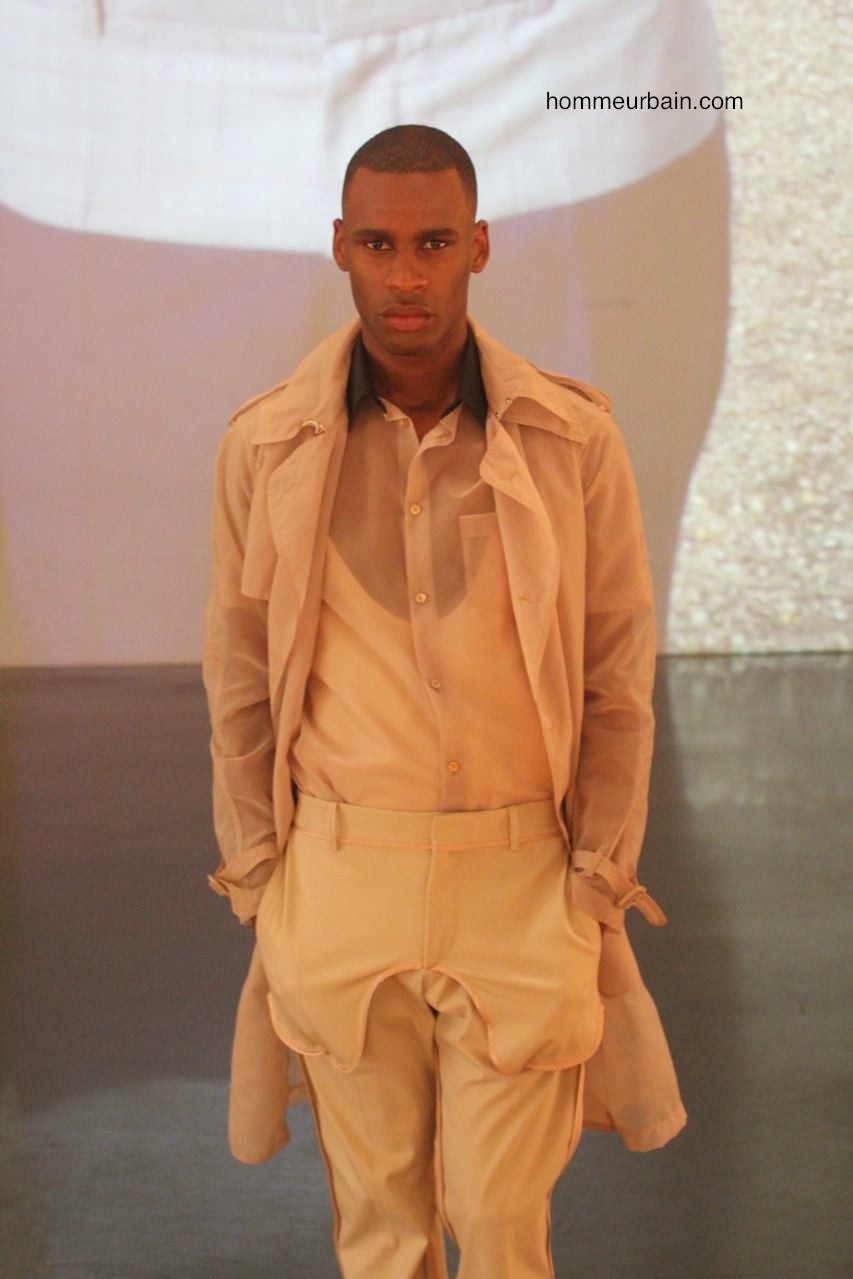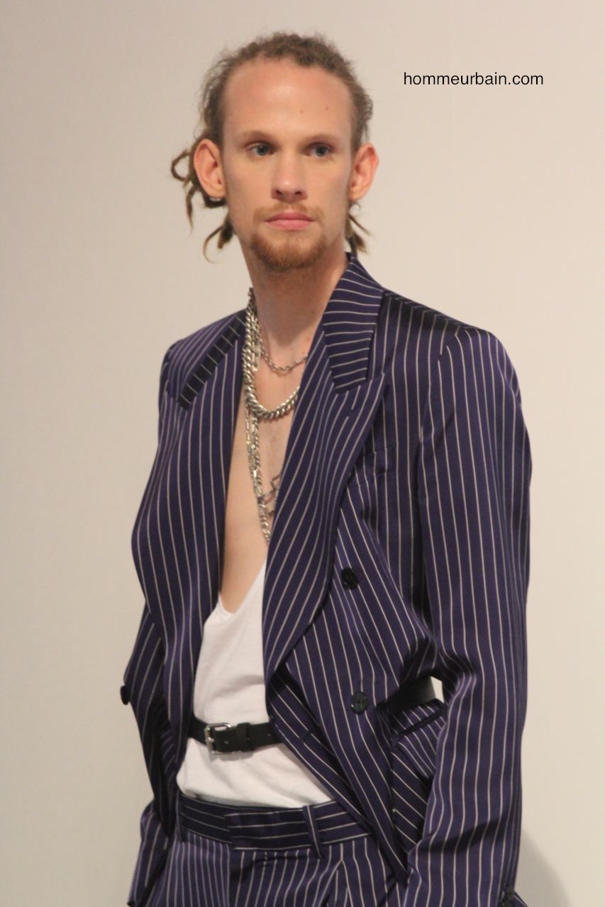 Un costume d’homme d’affaire est porté avec un marcel décolleté et des sandales. Des pantalons et vestes semblent portés à l’envers : les coutures et poches sont à l’extérieur. Un costume est traité façon pyjama, un autre comme un peignoir où la laine sèche est remplacée par de la viscose fluide. Un gilet ressemble à un gilet de sauvetage. Un mini short de sport « années 80 » est en « tissu de banquier » (laine sèche de costume).