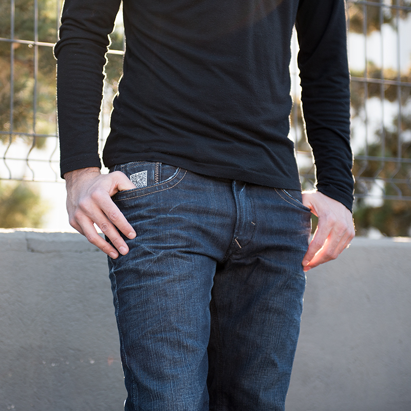 Autre innovation, de la marque française Kaporal en partenariat avec la start up Buzcard : Le connecting jean. Il s’agit d’un pantalon avec un QR code cousu dans une poche. Je rencontre quelqu’un, avec son smartphone, il peut scanner le QR code pour accèder à ma carte de visite en ligne, la vCard. Je retrouve ensuite l’historique de toutes mes rencontres. La coupe est semi slim.