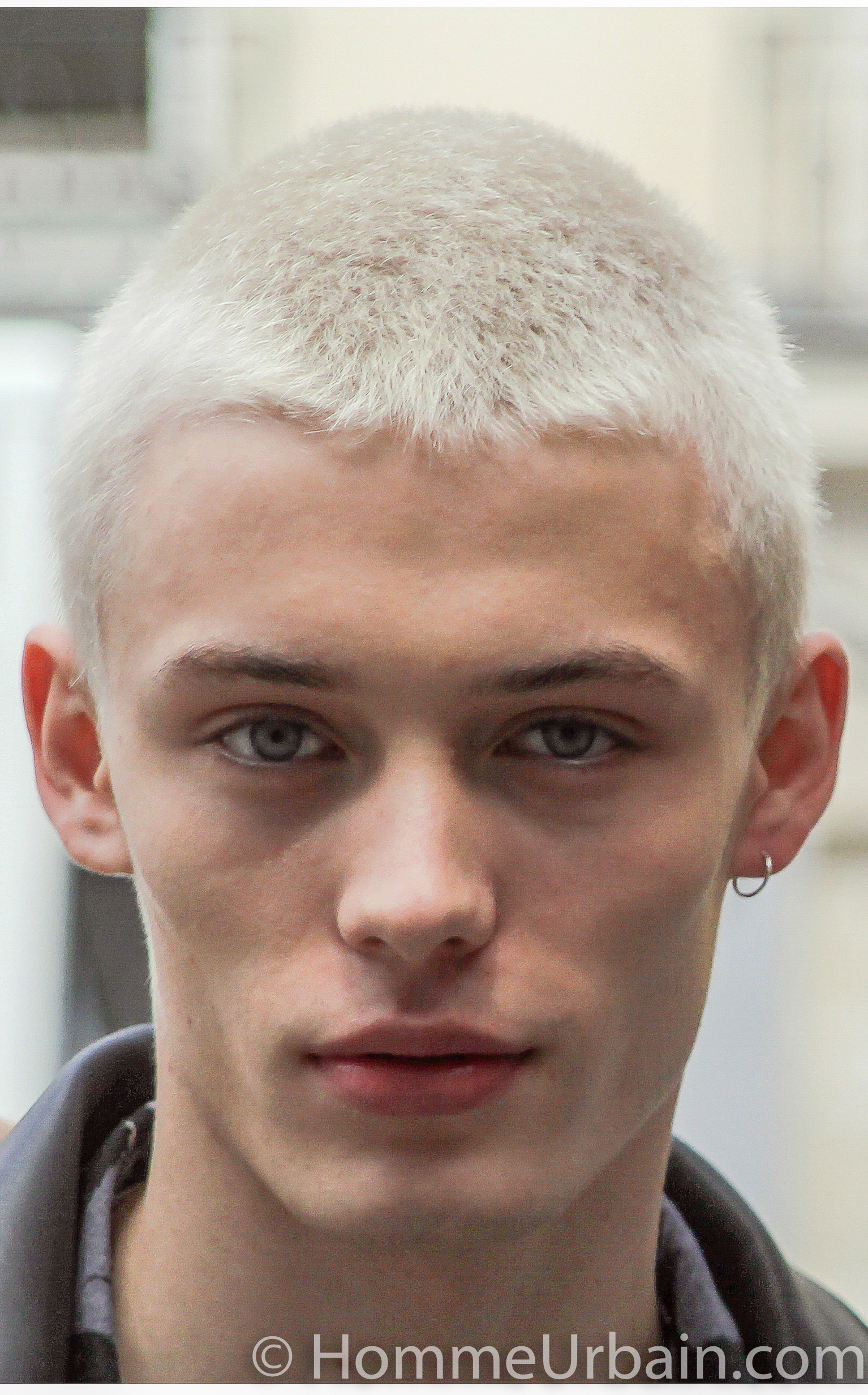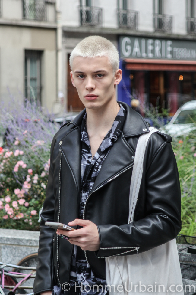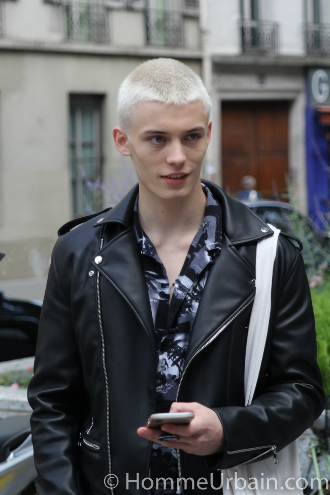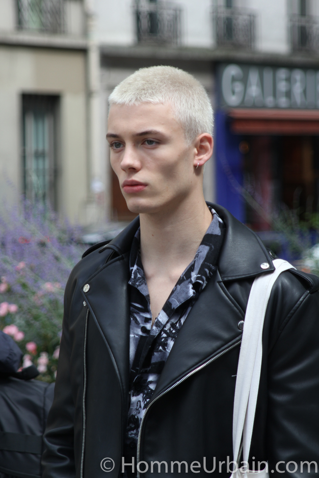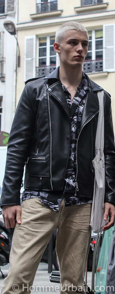Je l’ai vu pour la première fois au défilé d’Issey Miyake : Cheveux blonds, visage fin, avec des lunettes fumées grises, une chemise blanche et un pantalon de type pyjama. J’ai immédiatement pensé qu’il allait sortir du lot et très vite. Je l’ai photographié rapidement dans la rue à la sortie de la présentation de la collection. Il portait un perfecto de cuir noir et un chino beige.