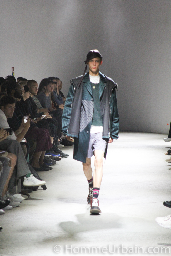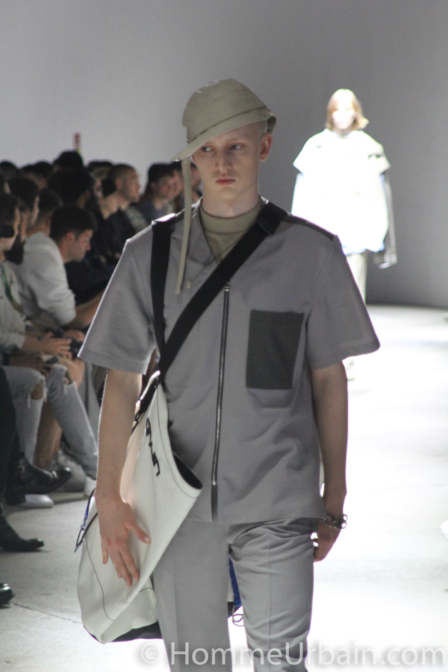 Références et univers se rencontrent avec des vêtements hybrides. Par exemple, un tailleur à l’allure presque militaire intègre un esprit smoking. Des tops sont construits avec le dos d’une chemise et le devant d’un tee-shirt en crêpe de coton. Par le travail de coupe, ils peuvent être portés des deux côtés.