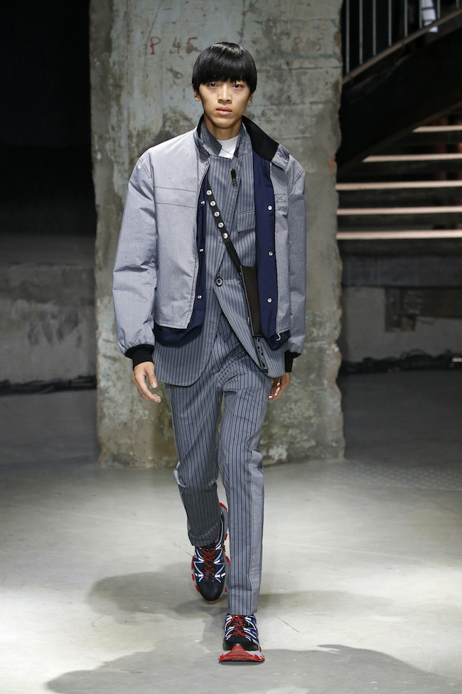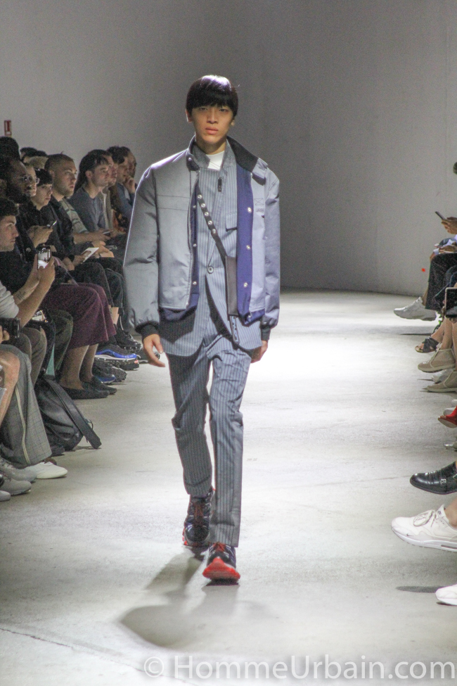 La collection joue les contrastes entre souplesse et rigidité, vêtements pour le soir et pour la journée, plat et relief, plein et vide. Par exemple, une bande de tissu cousue entre l’extérieur et l’intérieur d’un bombers gonfle le vêtement et lui donne son volume.